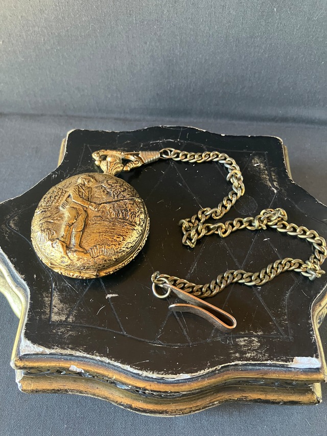 ・直径 4.5㎝ チェーンの長さ 35㎝ 素晴らしいエンボスの懐中時計です。動いていませんので、お値段に鑑みますが、実用より鑑賞用です。チェーンは取り外しできます。フランスビンテージ。
