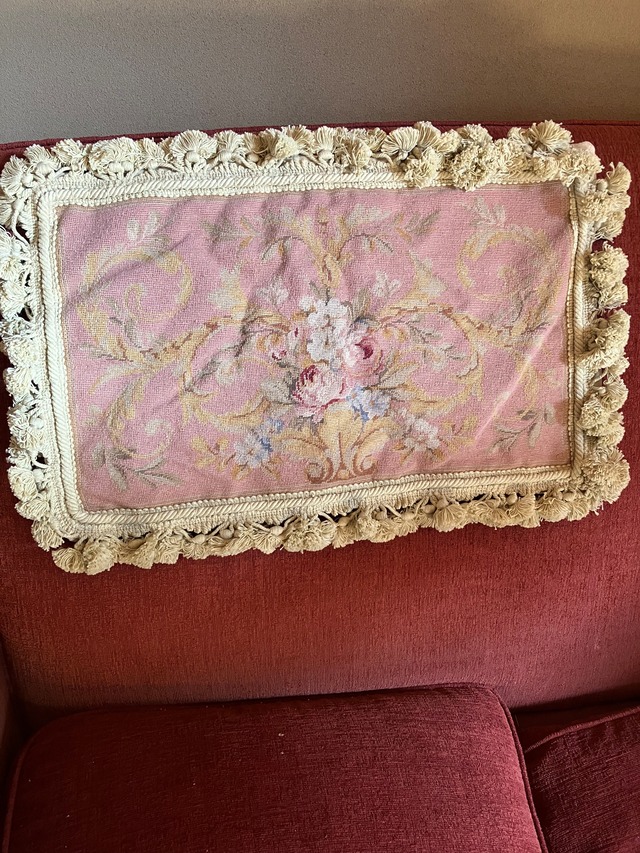 ・縦 39㎝ 横 60㎝ コブラン刺繍織りのクッションカバーです。コブラン織りの部分はアンティーク生地でそちらを活かしてクッションカバーにリメイクしたものです。 素晴らしくエレガントなクッションカバーに仕上がっています。