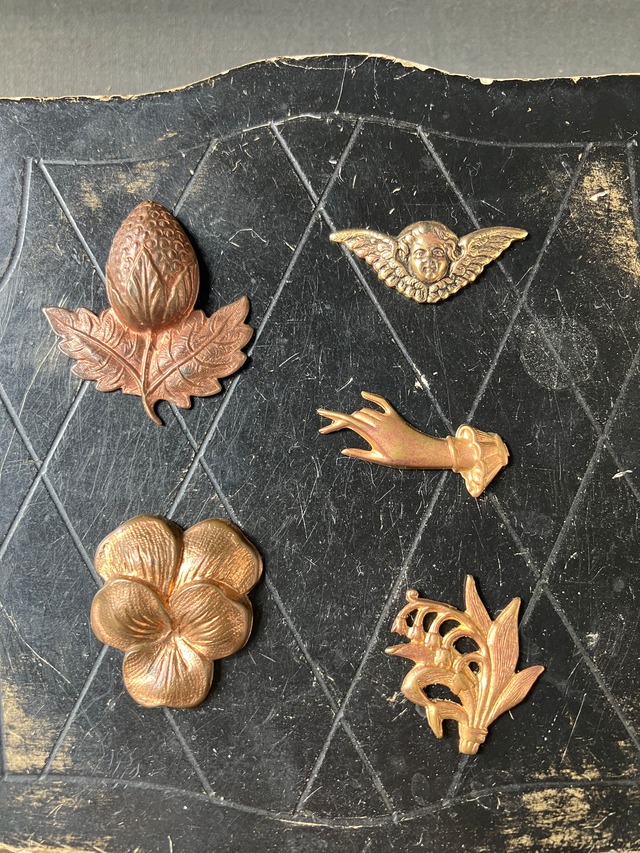 ・ブラス製のモチーフ5点セットです。 スズラン 縦 2.2㎝ 横 1.8㎝ ハンド 縦 1㎝ 横 2.5㎝ パンセ 縦 2.8㎝ 横 2.2㎝ エンジェル 縦 1.1㎝ 横 3㎝ アーティチョーク 縦 3㎝ 横 3㎝