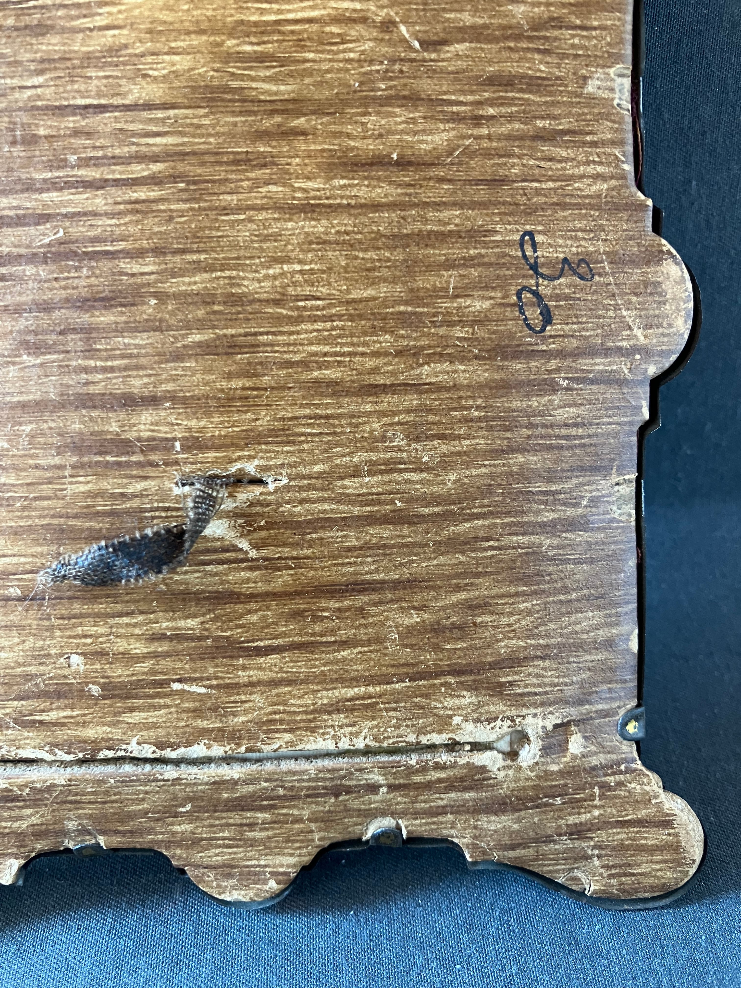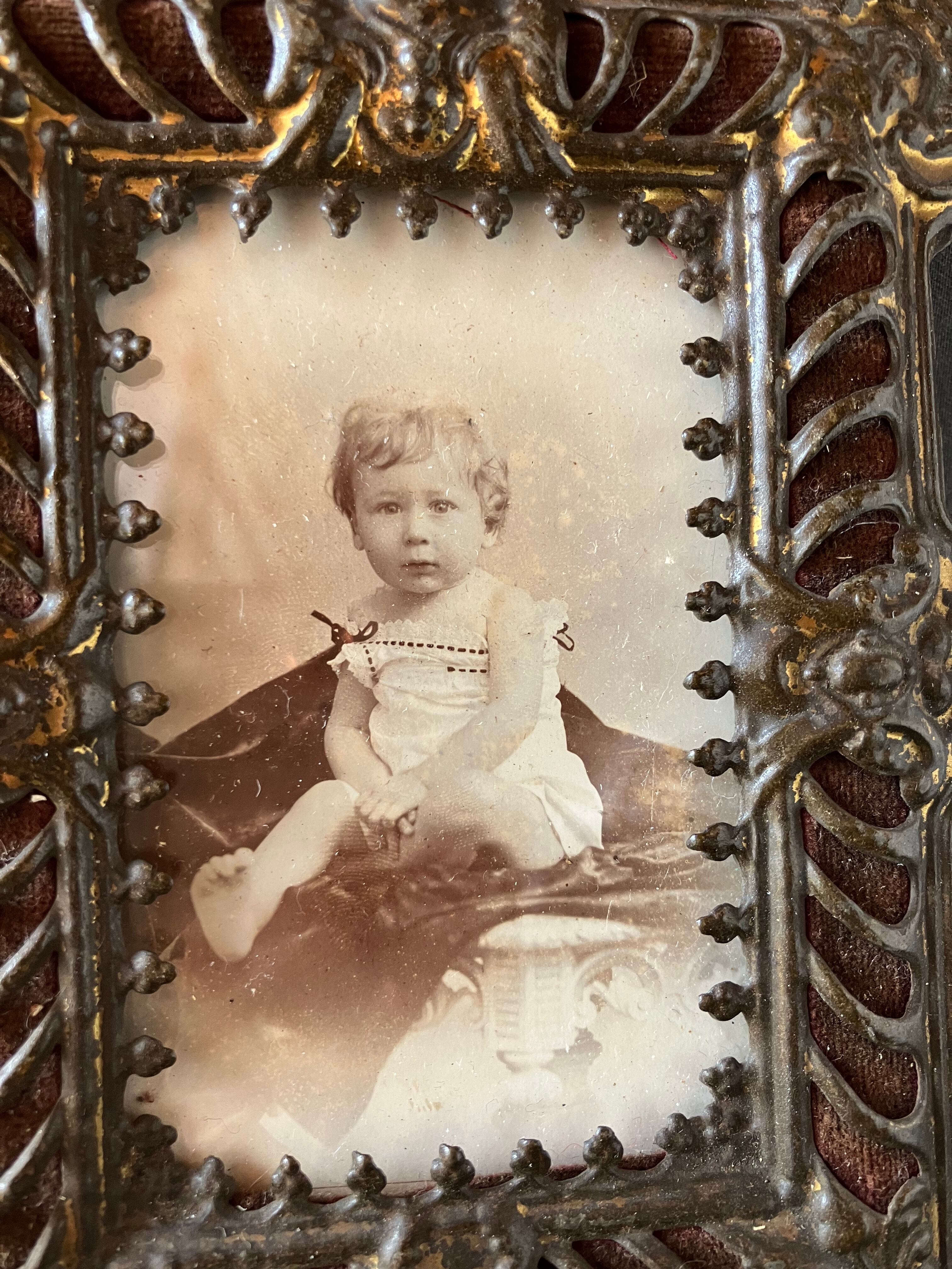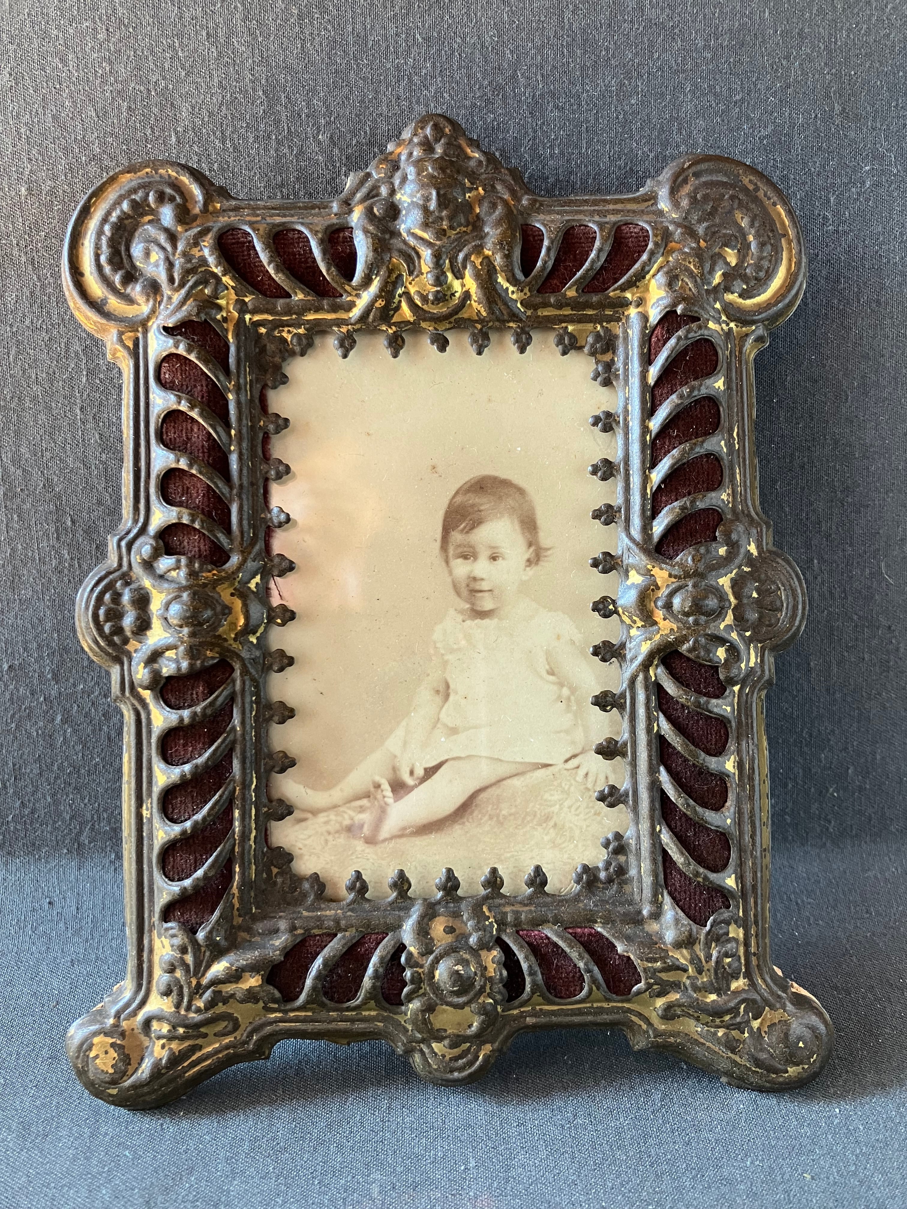 スェードのフレームにメタル製のエンジェルとロカイユの装飾が素晴らしいピクチャーフレームてす。中のフォトは取り替えられます。裏の取り出し部分が1枚劣化部分があります。2枚共ガラストップが付いています。フランスアンティーク。