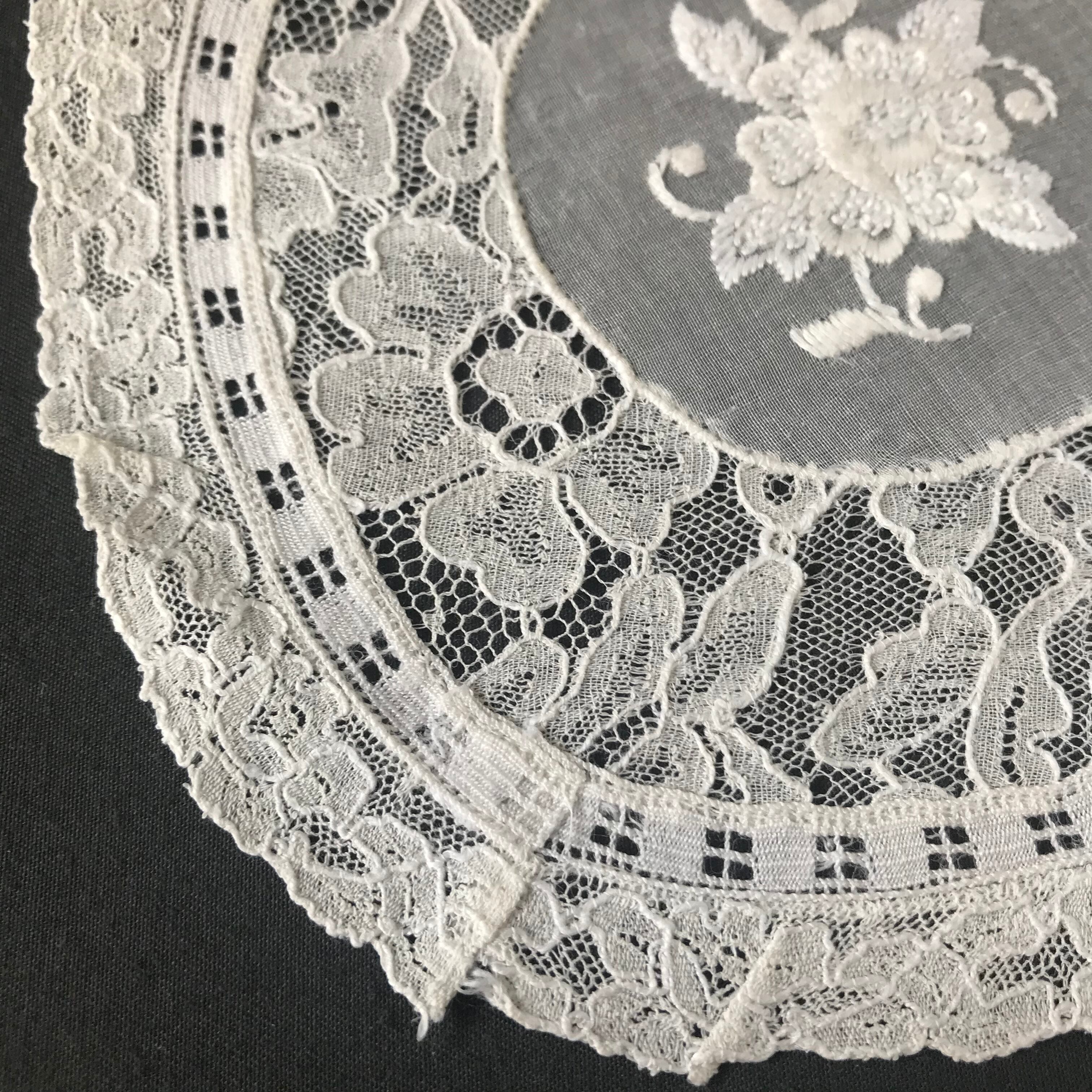 ・直径 18㎝ 中央にカメリアの手刺繍が施され周りをレースで縁取った可愛らしいレースドイリーです。フランスビンテージ。同じものが2枚あります。