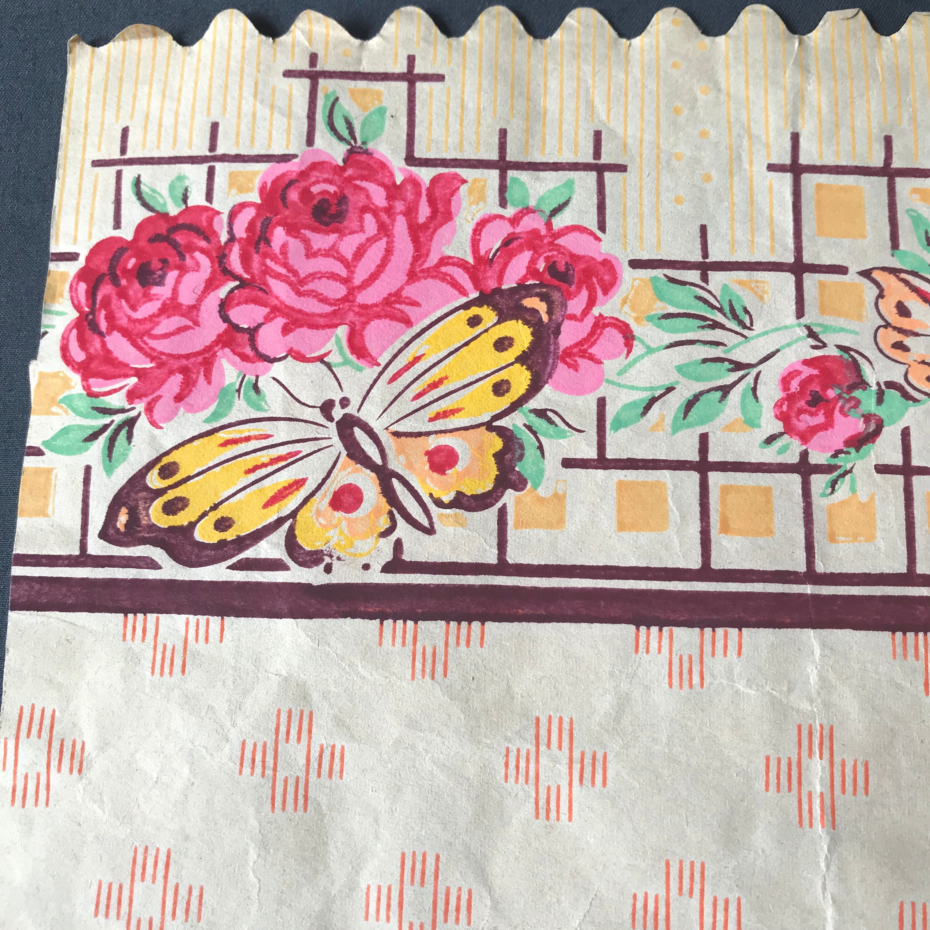 可愛らしいノルマンディーレースとバタフライとバラが描かれた珍しいペーパー、モーブピンクのベルベットのお花が3個の可愛らしいセットです。フランスアンティーク。