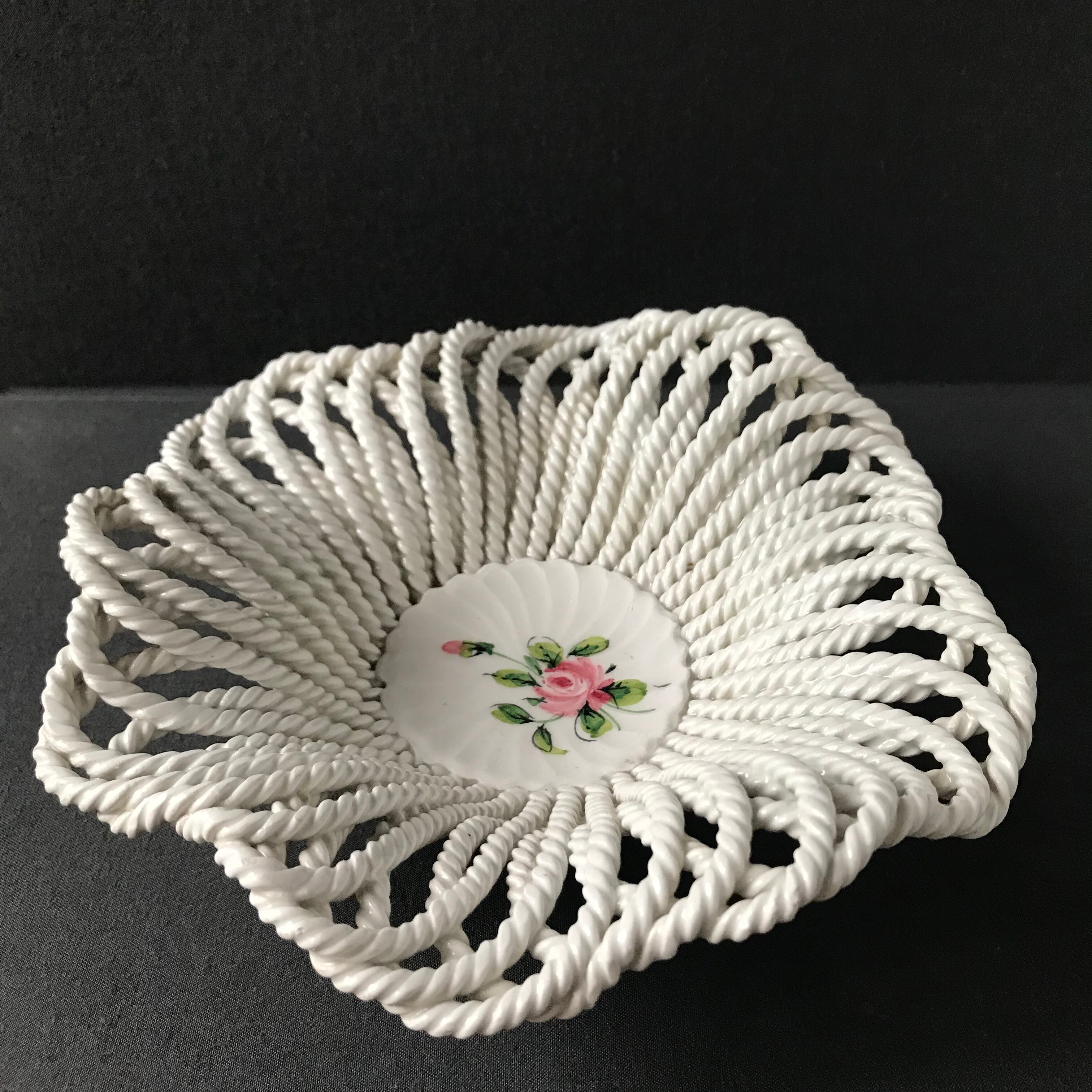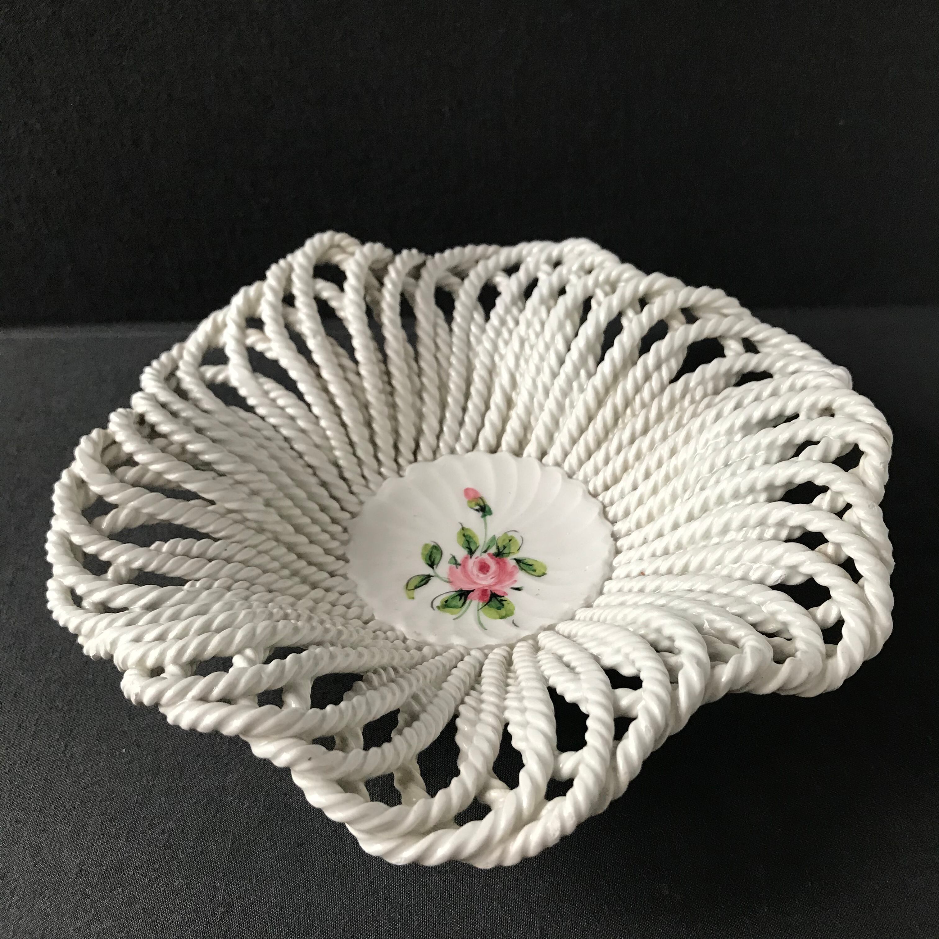 ・直径 18㎝ 中央にピンクの薔薇がかかれ、パニエ編みが綺麗なボウルです。ヒビカケ無く良い状態です。ITALY とサインがありますが、フランスにて買付けました。フランスビンテージ。