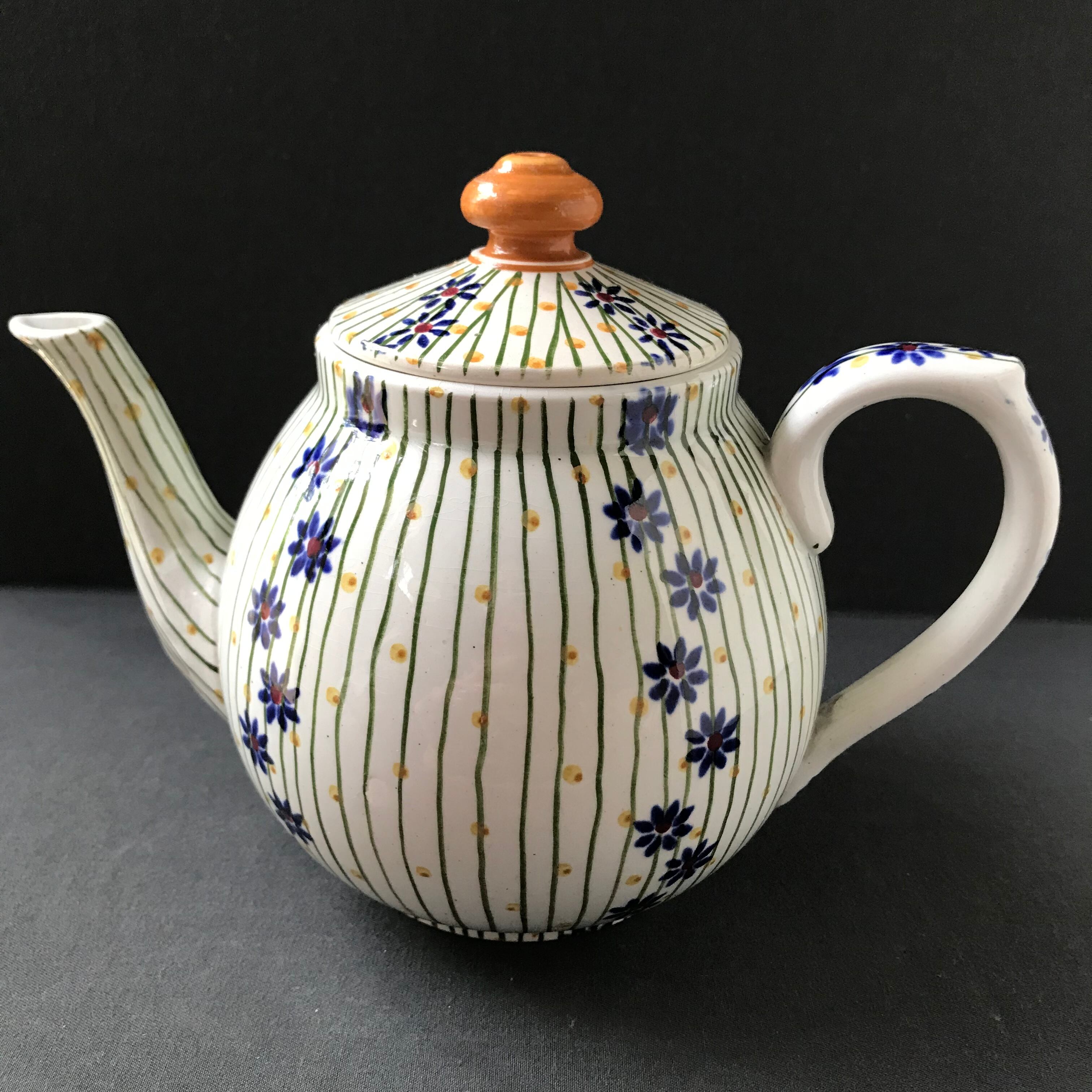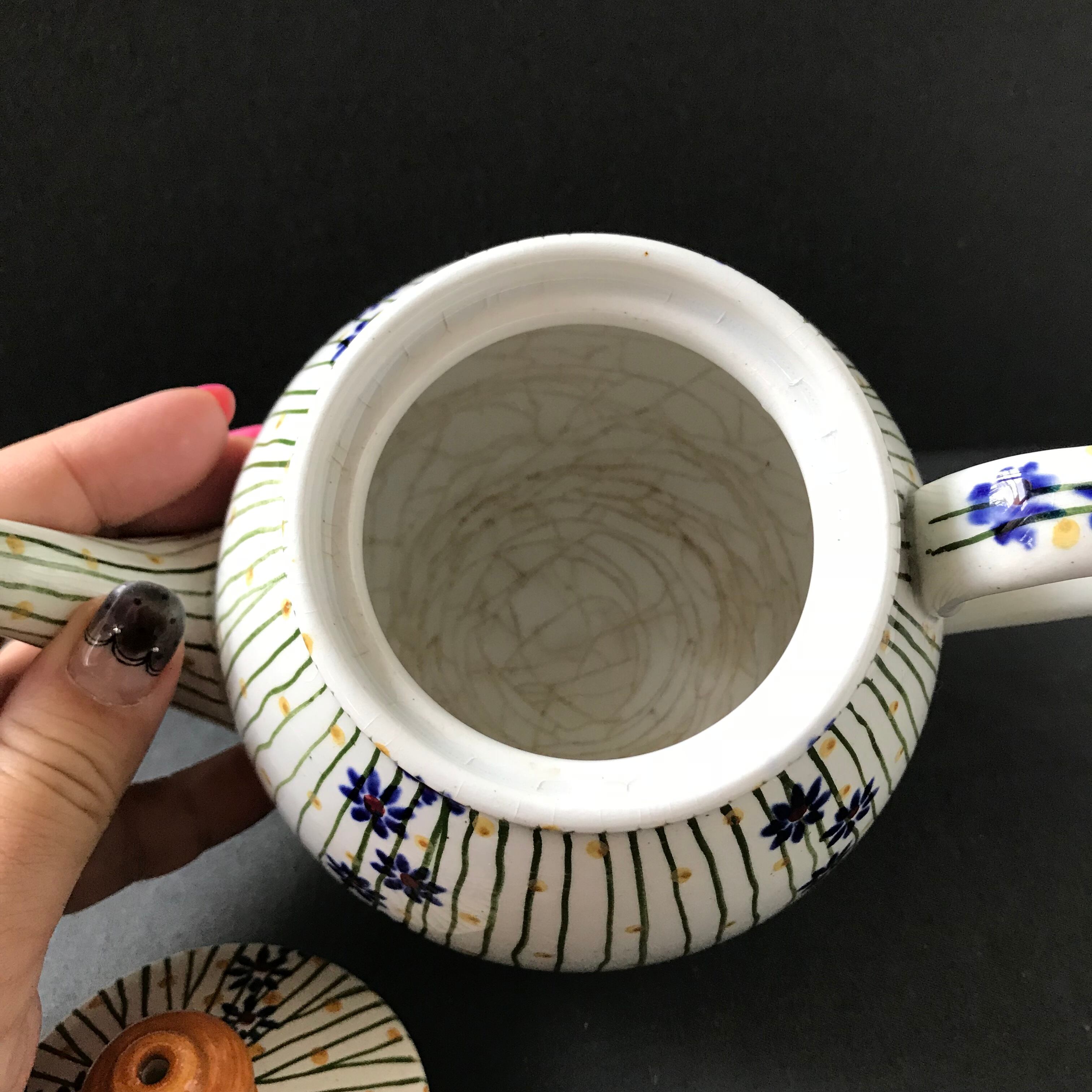 ・直径 11㎝ 高さ 15.5㎝ オランダマーストリヒト製 青いデイジーのティポットです。ハンドペイントの素朴な柄は温かみを感じますね。ヒビカケ無く良い状態です。ポットの中に貫入がありますが、水漏れはしませんでした。同じ柄のカップ&ソーサーとクレミエがあります。