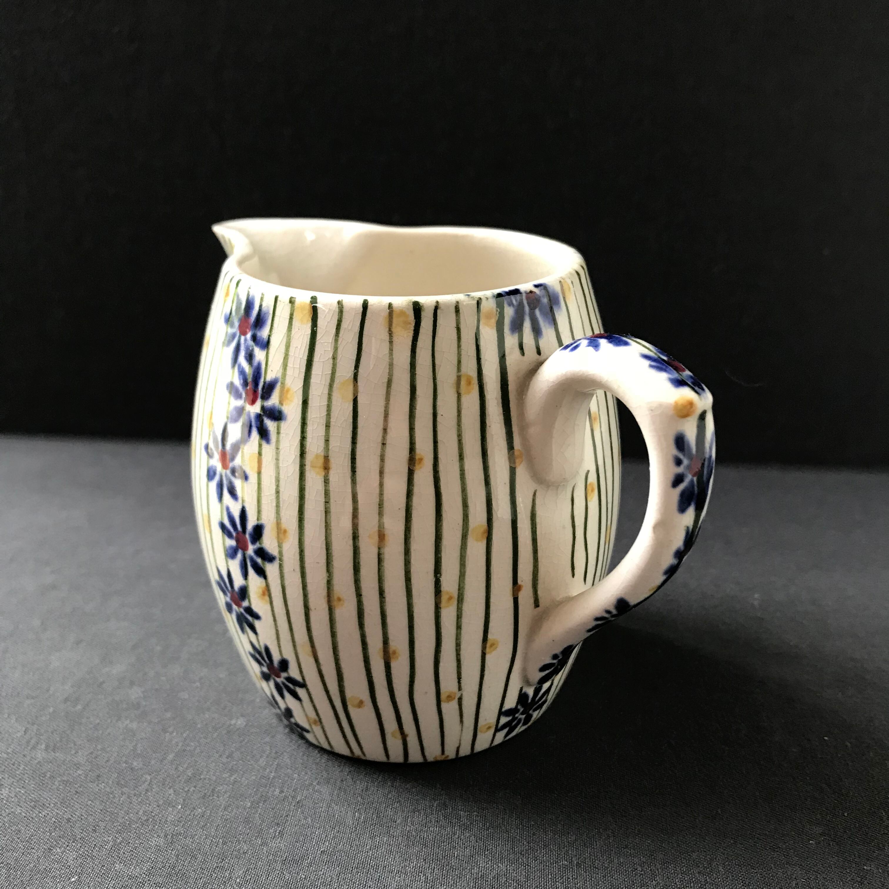 ・直径 5.5㎝ 高さ 8㎝ オランダマーストリヒト製 青いデイジーのクレミエです。素朴な風合いの柄は温かみを感じますね。同じ柄のティーポットとカップ&ソーサーがございます。小さなお花を飾っても可愛いらしいですね。