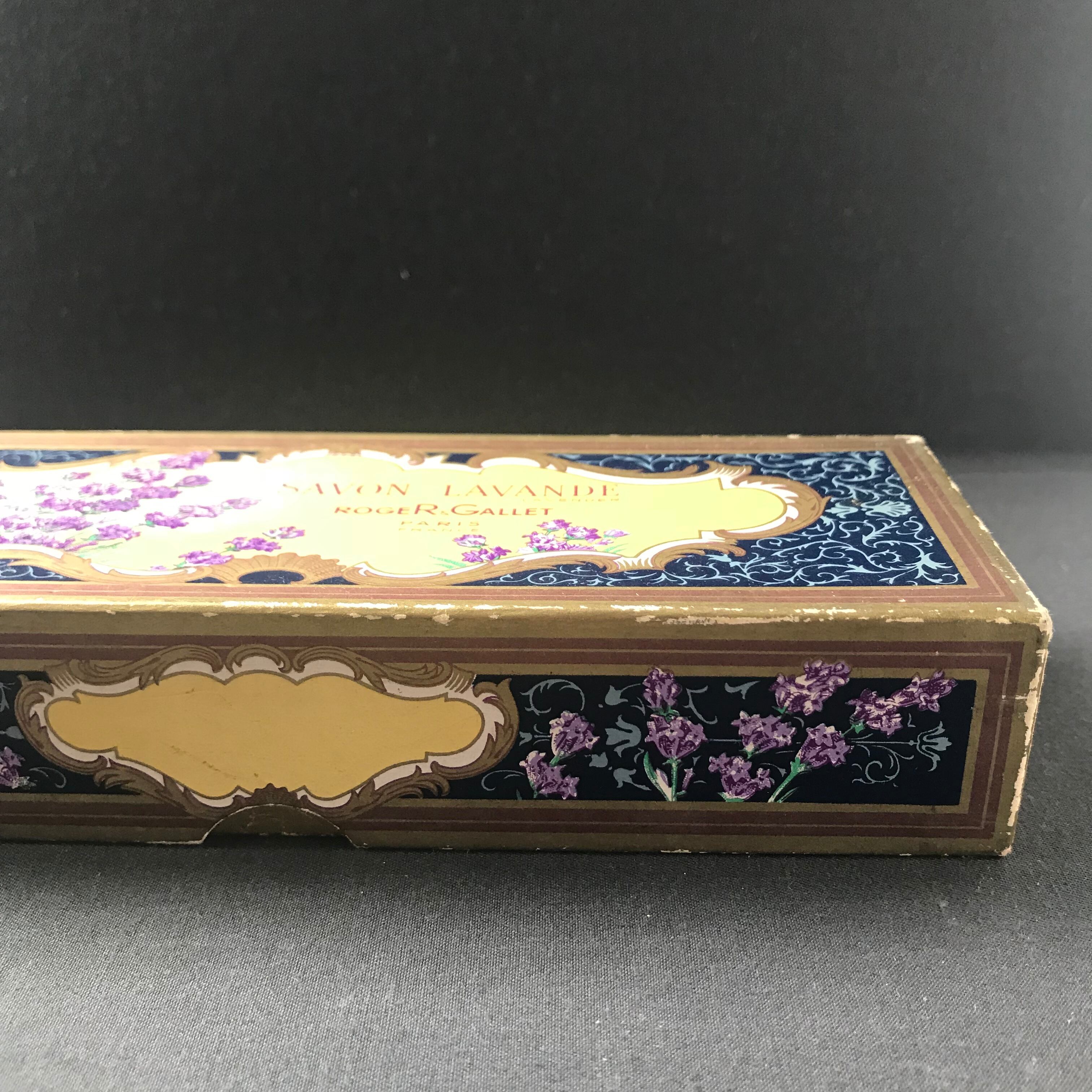 ・縦 7㎝ 横 20.2㎝ 高さ 3.7㎝ ROGER GALLETのラベンダーのSAVON BOXです。破れ等はありません。側面もラベンダーが描かれとても綺麗です。