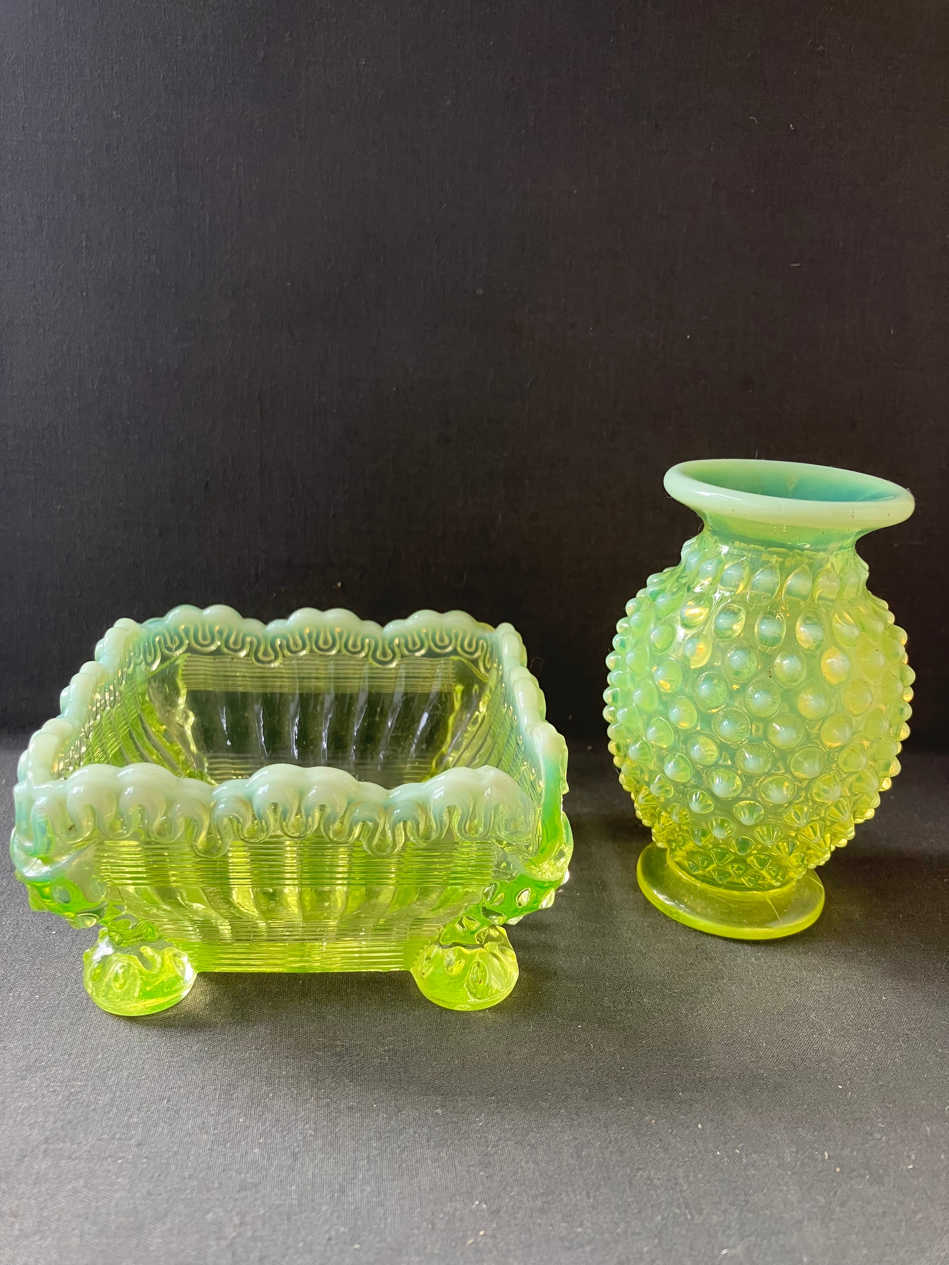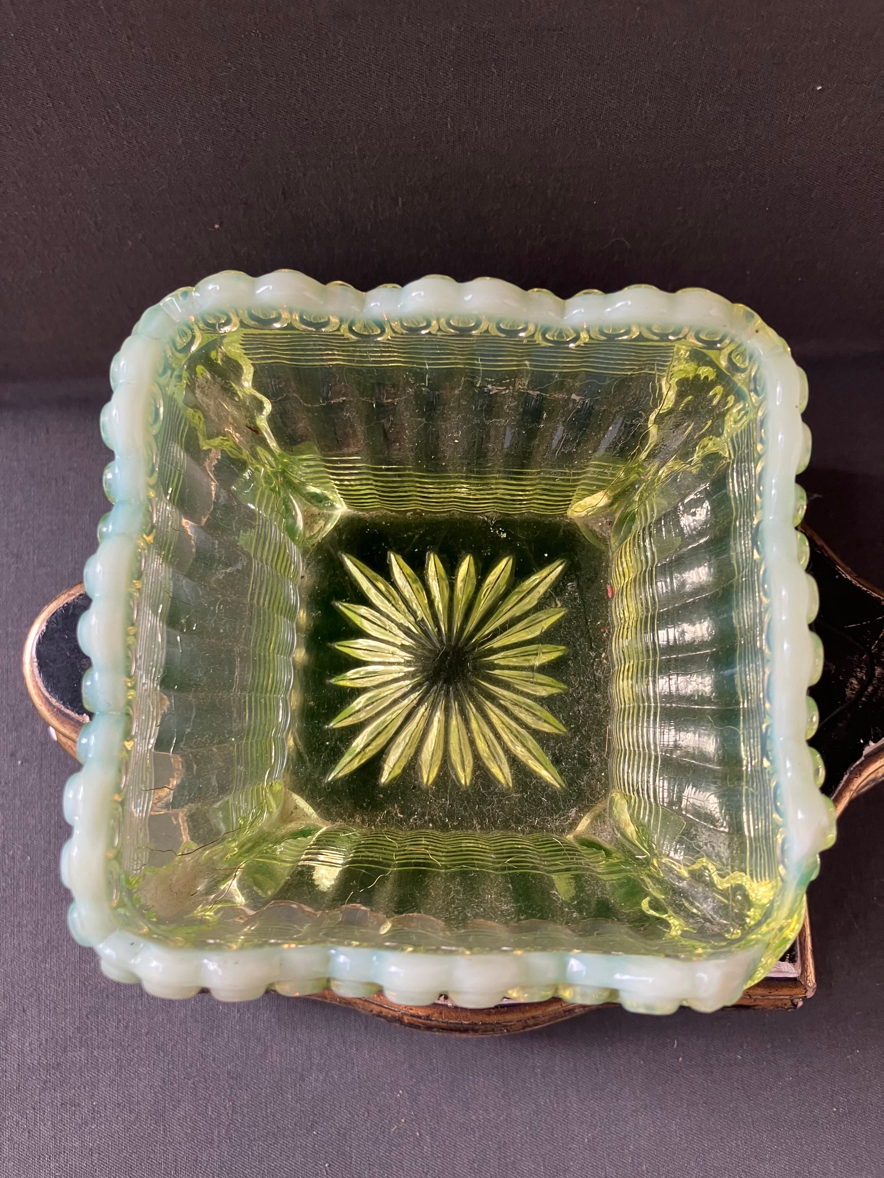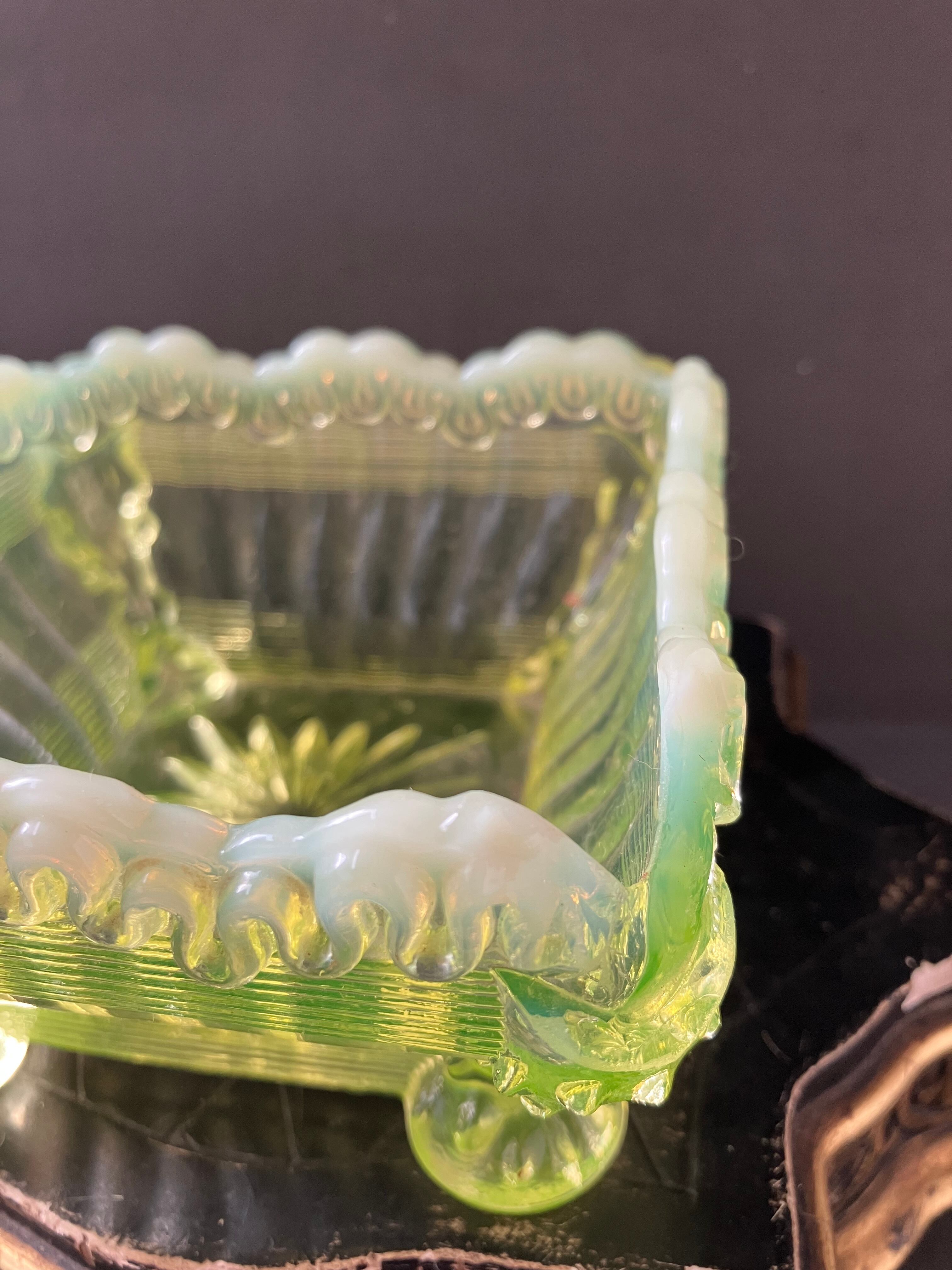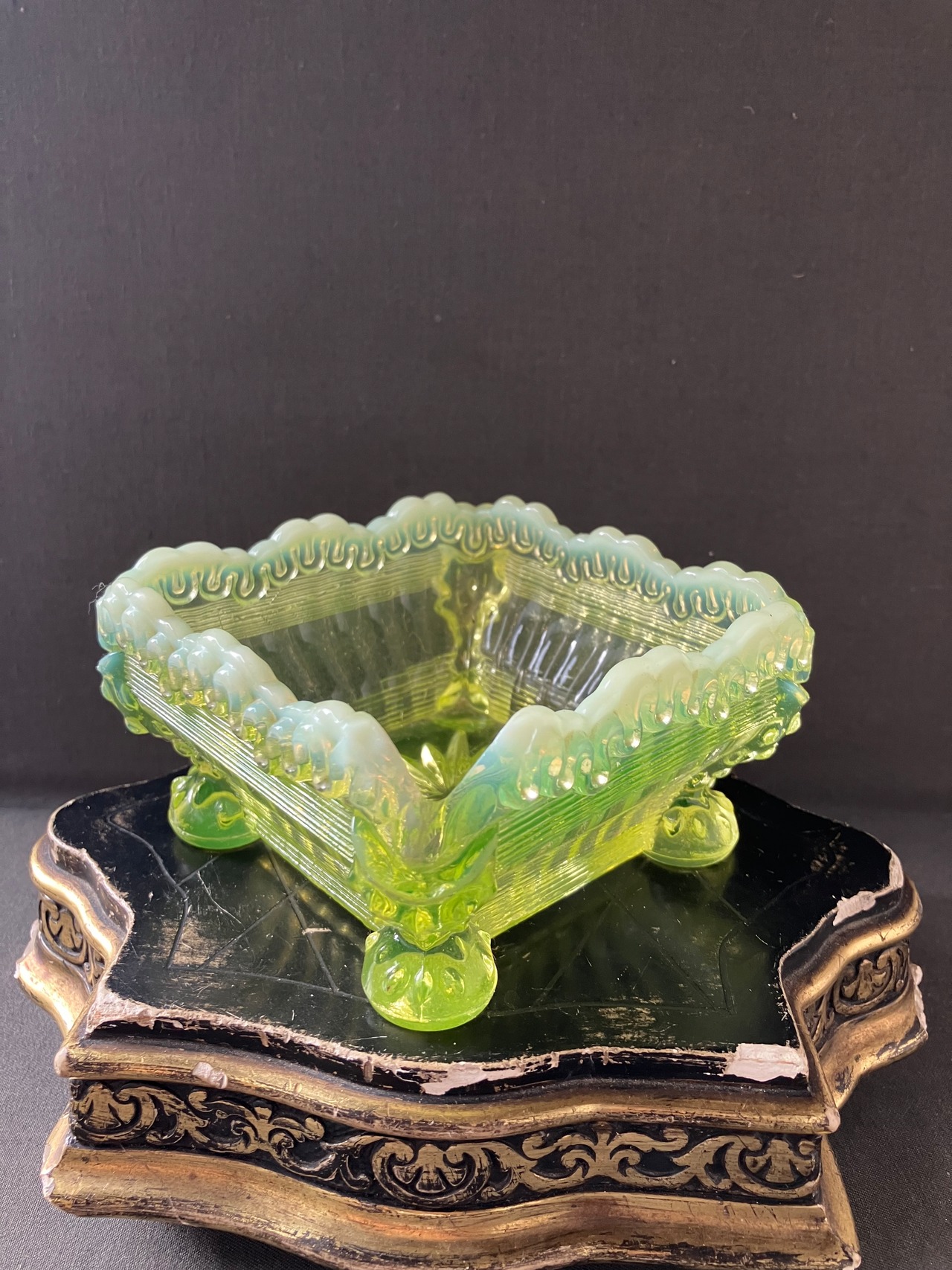・ウランガラスとオパリンガラスのボブネイルのベイスンと足付きディッシュのセットです。ベイスンの底にスレカケがあり、ディッシュの角1ヶ所にカケがあります。お値段に反映しております。フランスアンティーク。