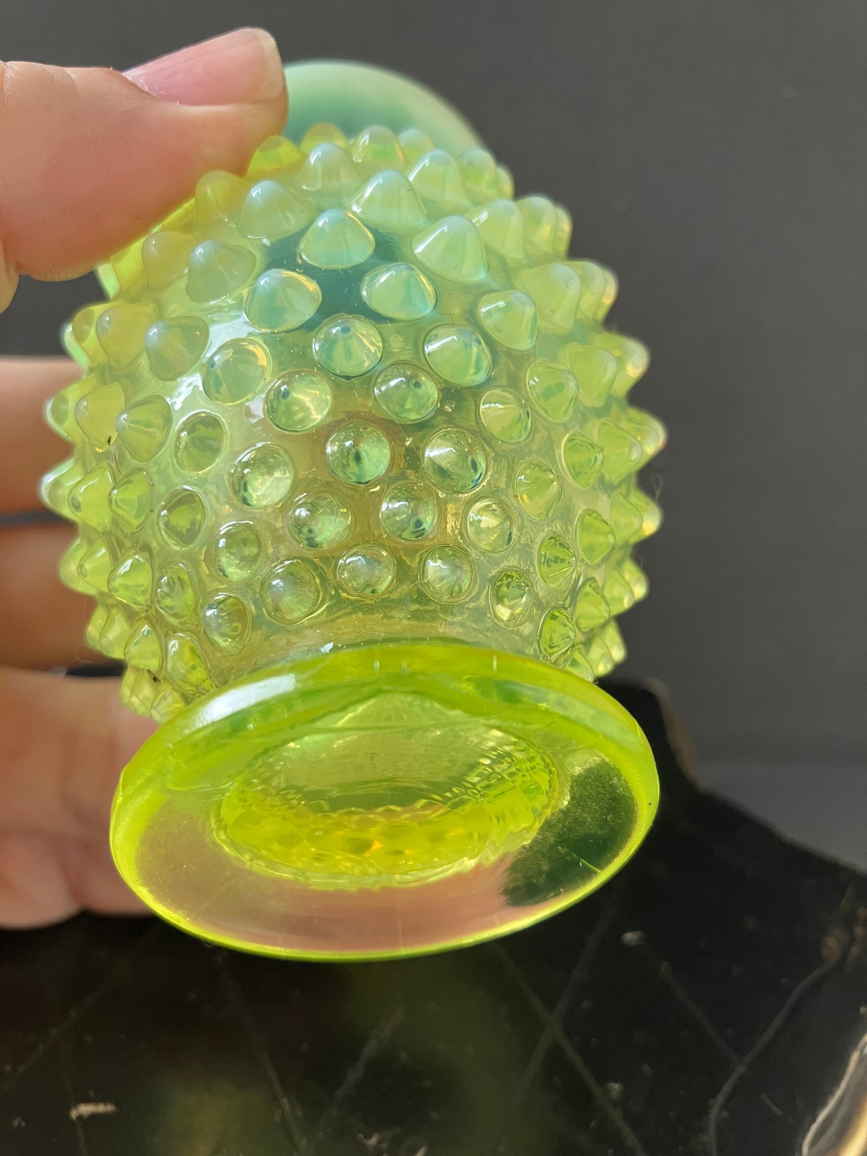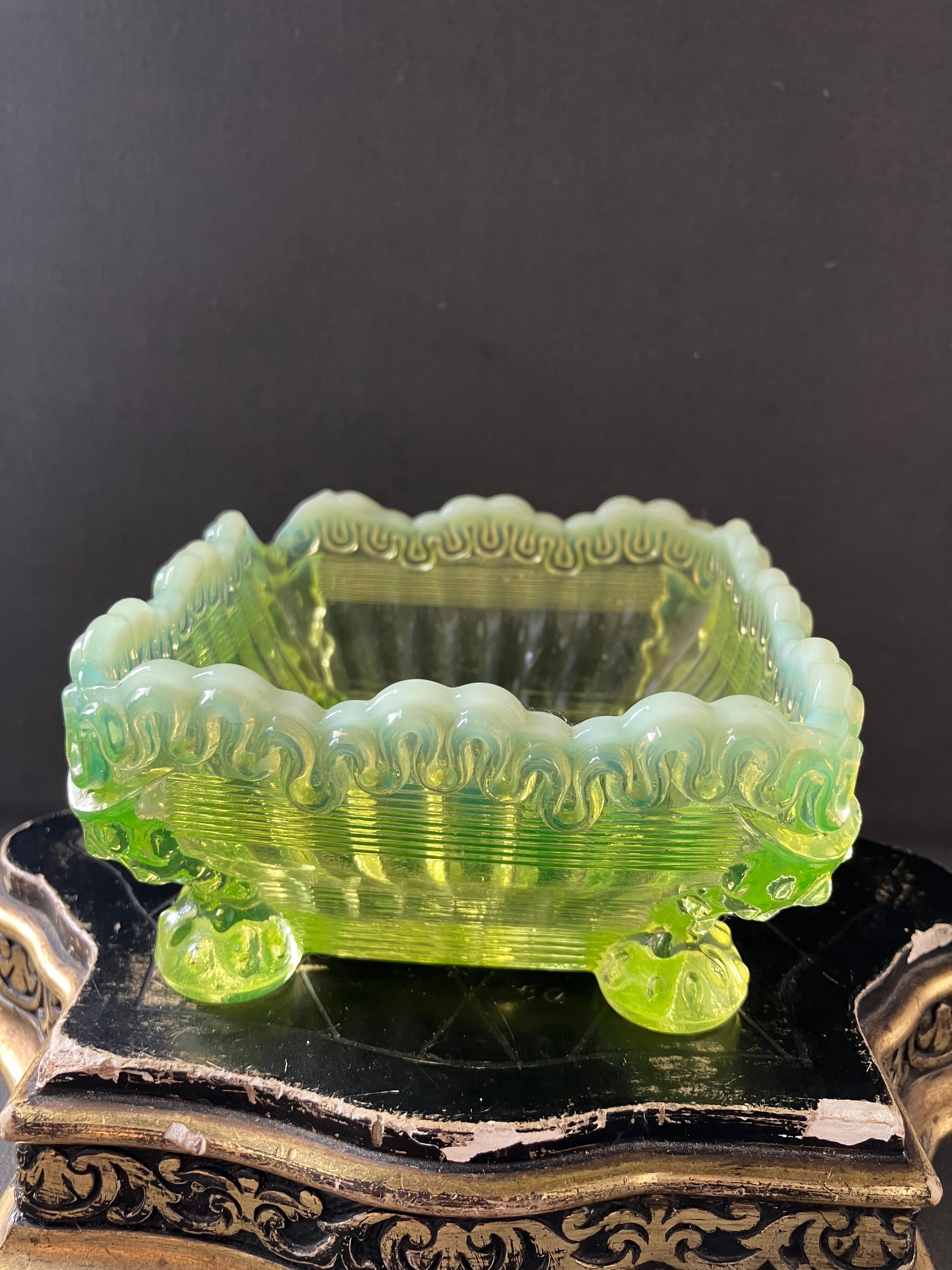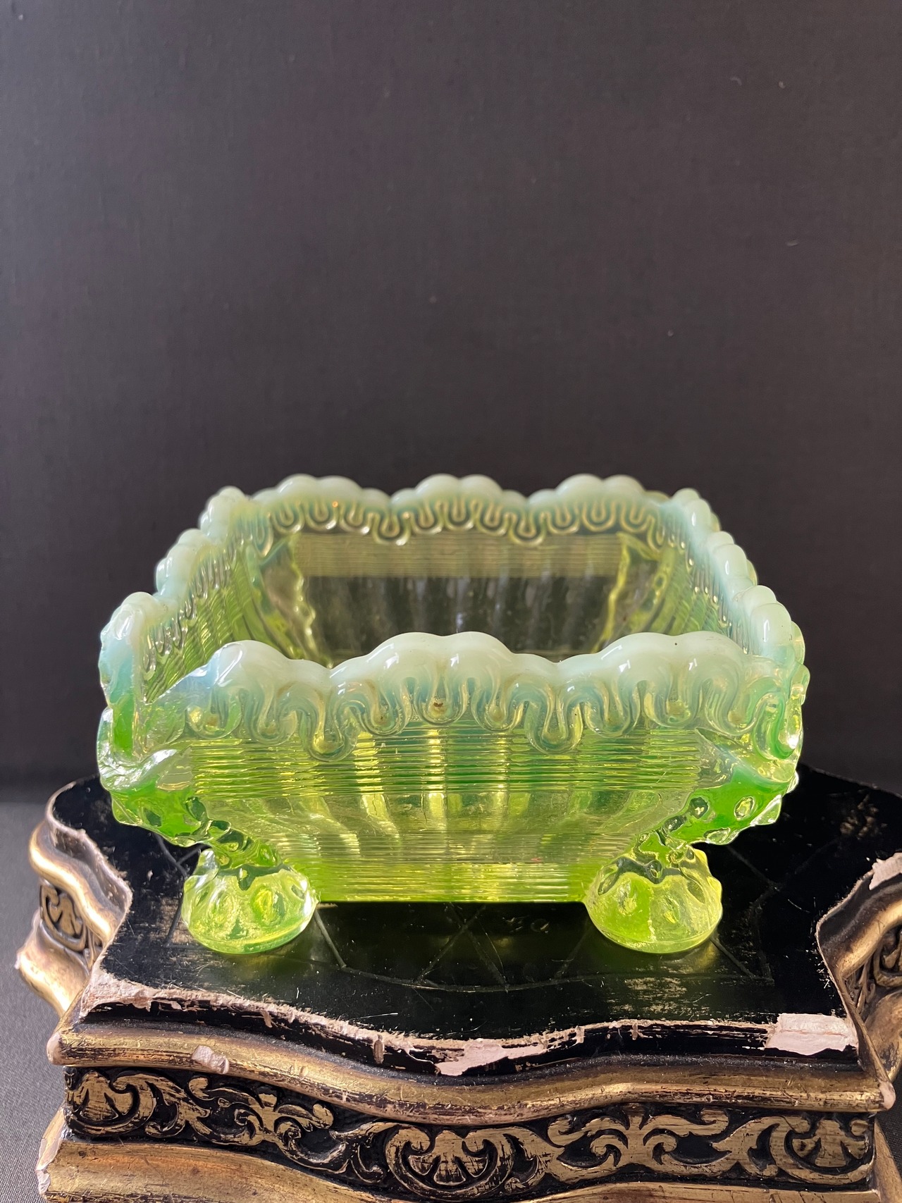 ・ウランガラスとオパリンガラスのボブネイルのベイスンと足付きディッシュのセットです。ベイスンの底にスレカケがあり、ディッシュの角1ヶ所にカケがあります。お値段に反映しております。フランスアンティーク。