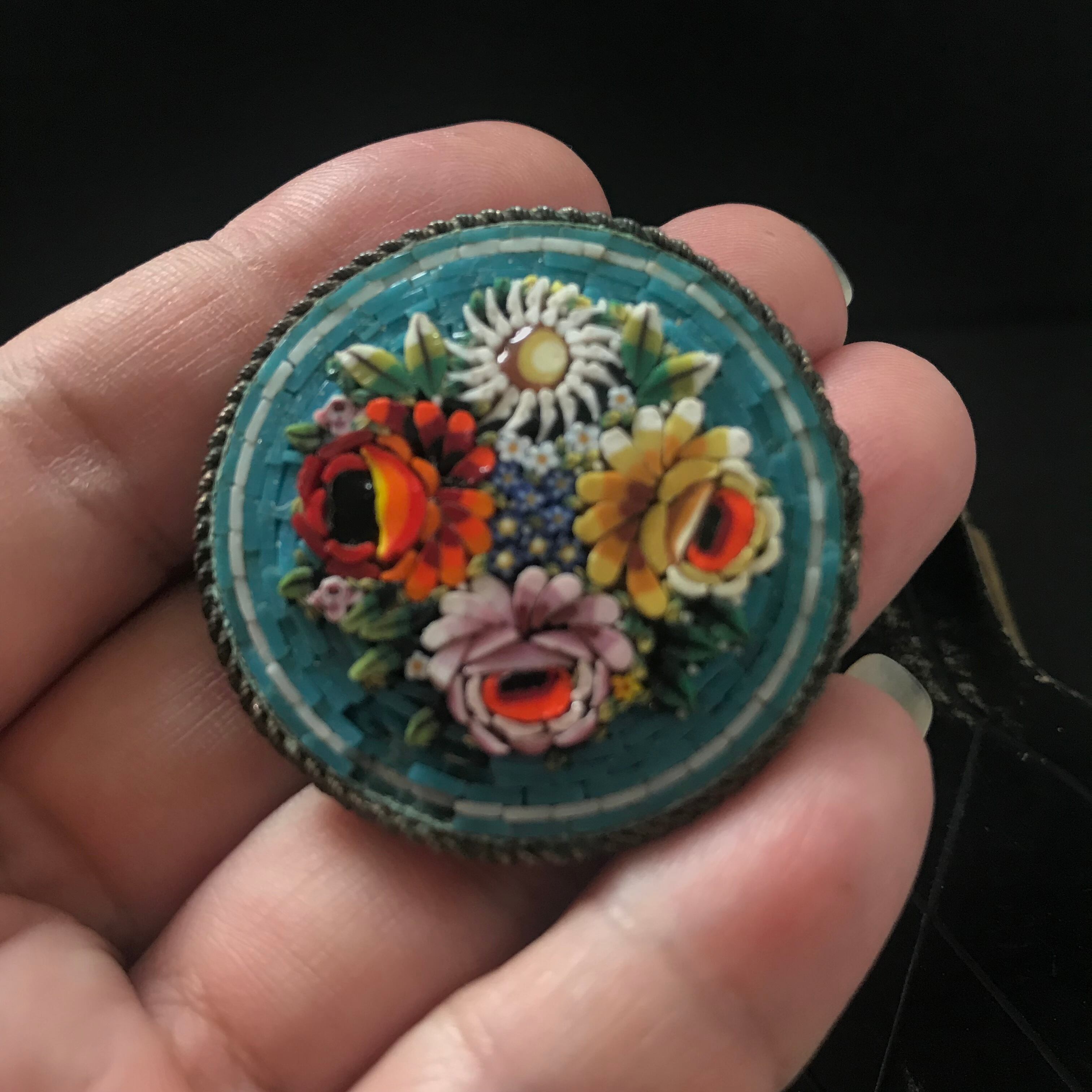 ・直径 4.2㎝ スカイブルーのモザイクにバラやマーガレットそして中央には1㎜以下のモザイクを使って勿忘草が現れています。芸術的なブローチです。今ではこの技術を持った人が減っていますので細やかな細工物はレアです。縁の一部モザイクが沈んでいます。そちらを鑑みたお値段になっております。フランスで見つけました。