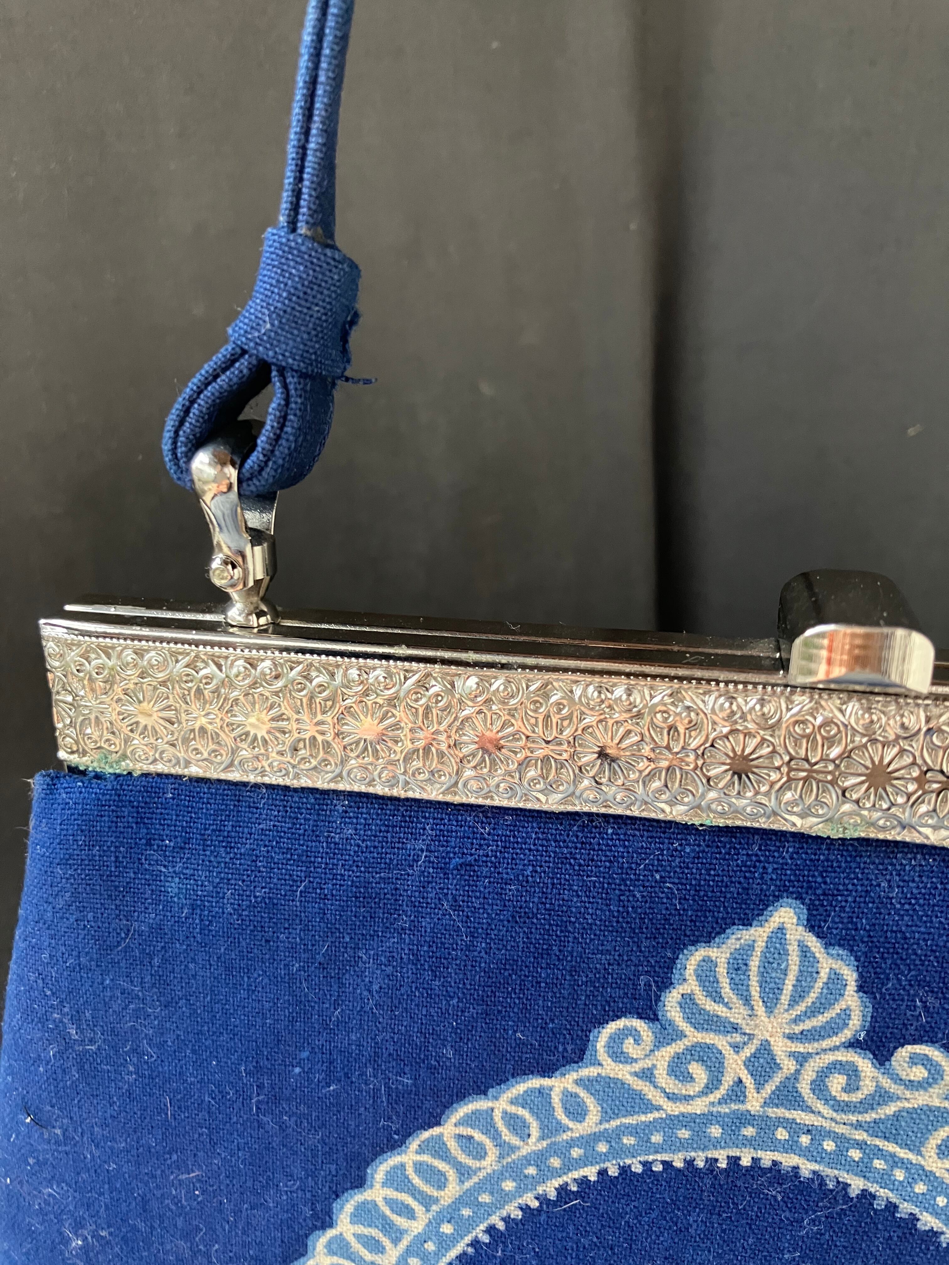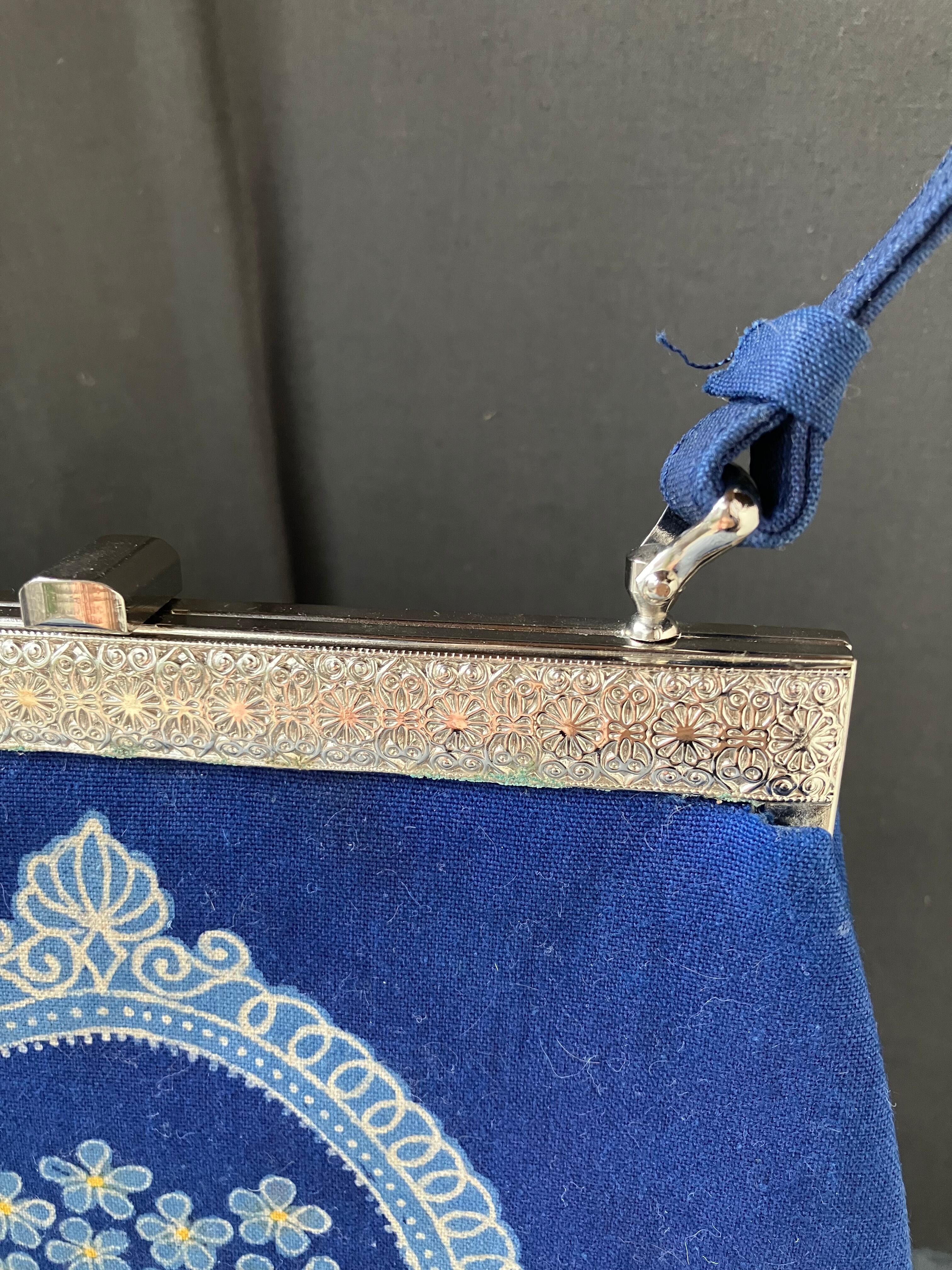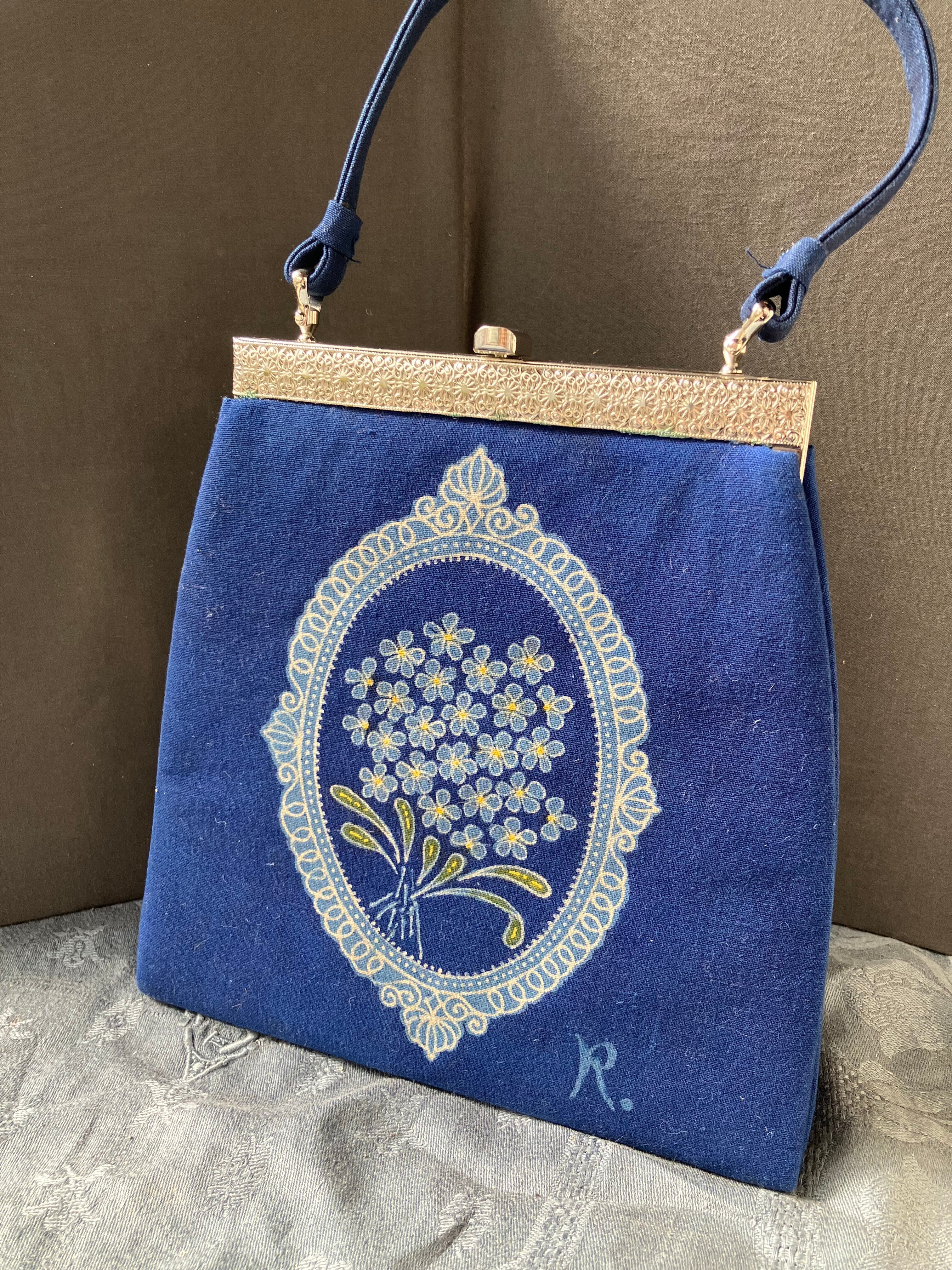 スミレとカメオフレームが可愛いらしいバックです。留金も凝っていてしっかりしています。内側はモーヴブルーのシルクです。実用できるアンティークは楽しいですね。お洋服やお着物にも合いそうです。フランスビンテージ。