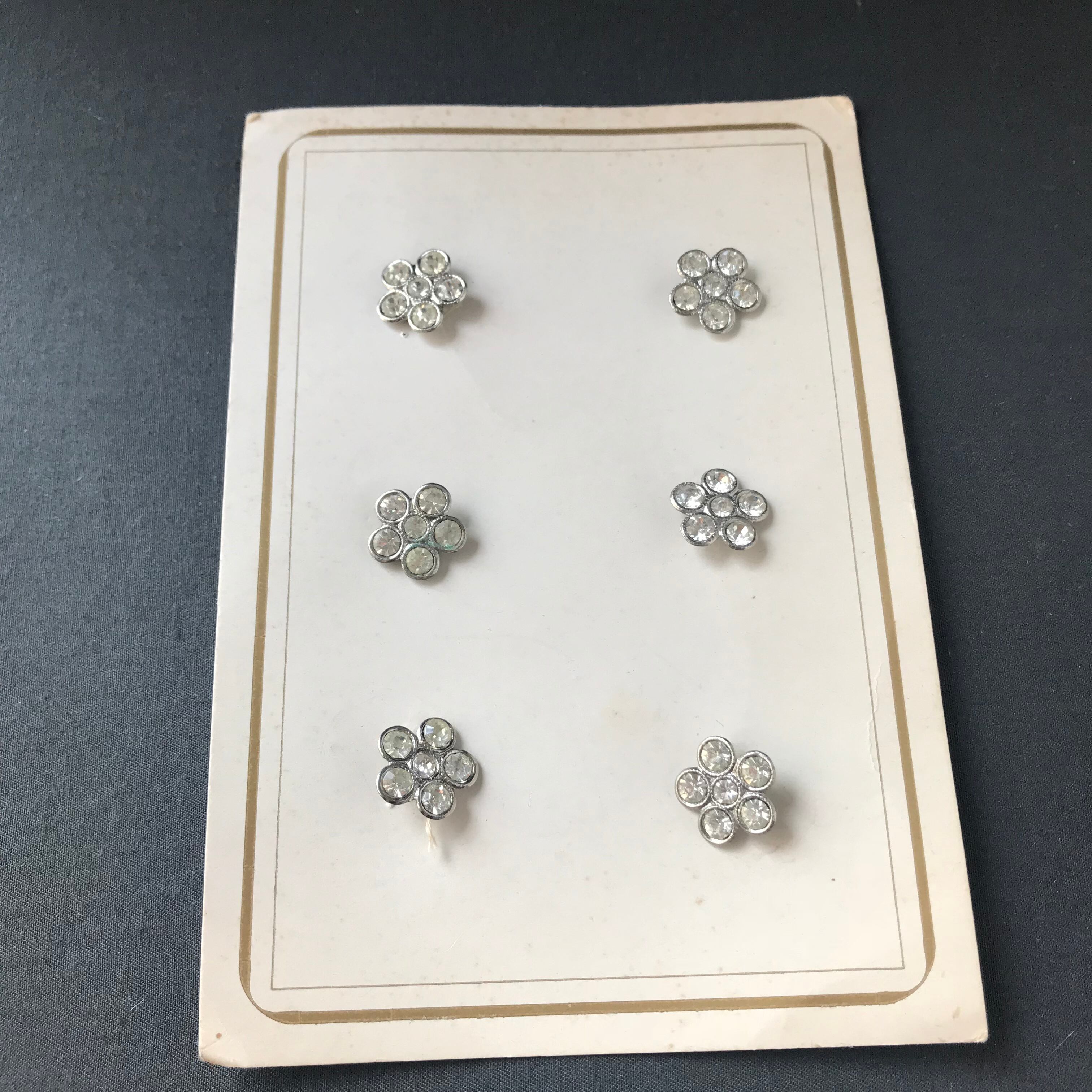 お花の形をしたラインストーンのボタンが6個付いたシートです。綺麗なボタンを使って頂いたり、このまま飾って頂いても可愛らしいです。フランスビンテージ。
