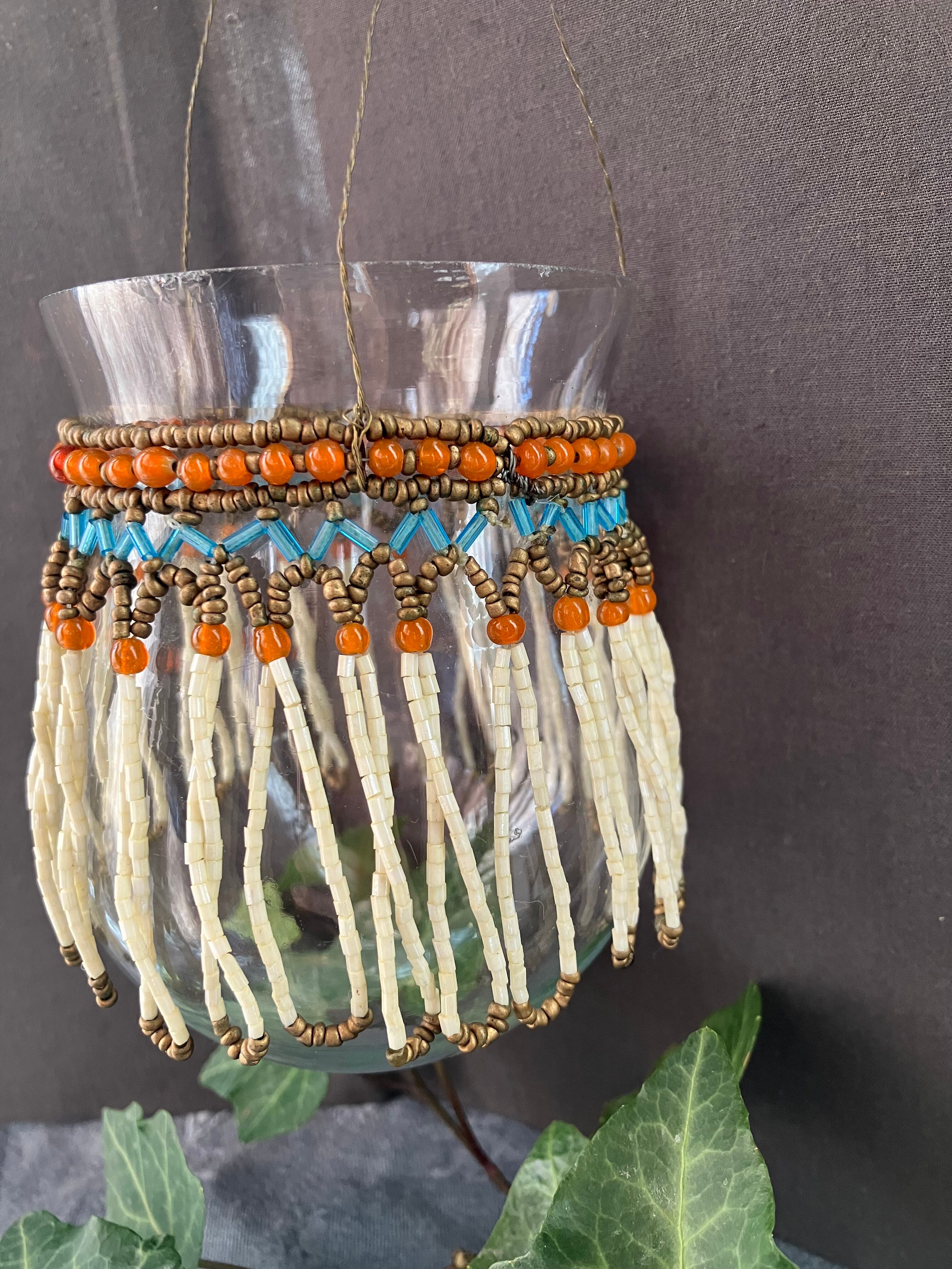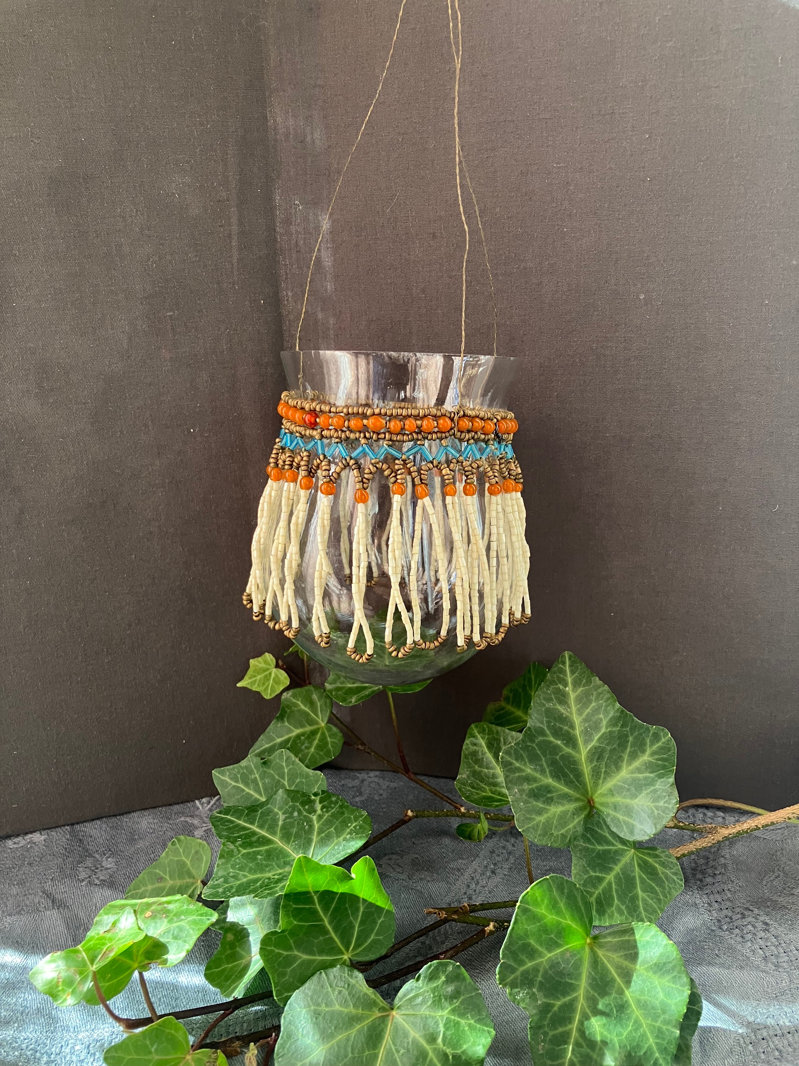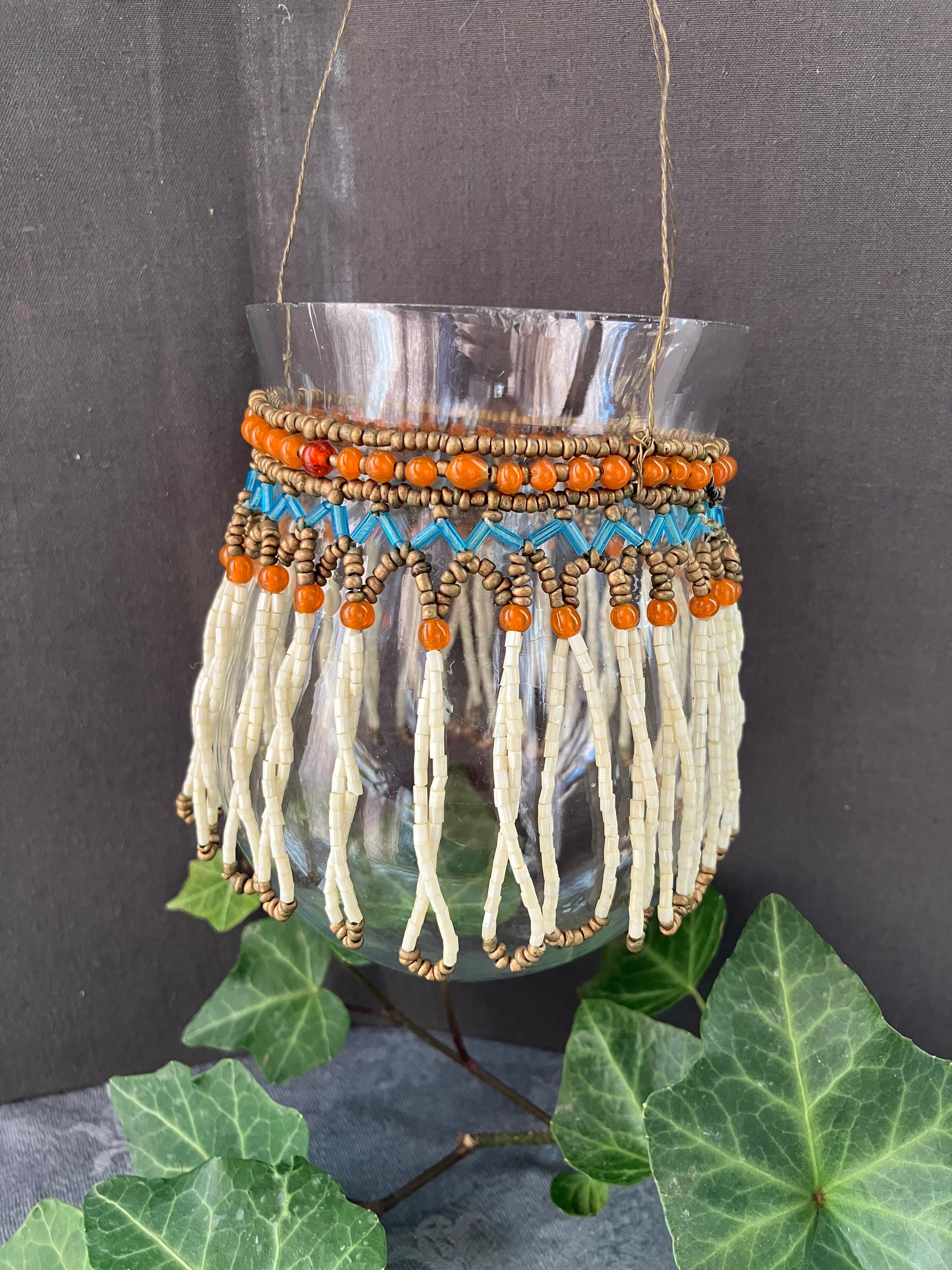薄張りガラスのベイスンに素晴らしいビーズフリンジが付いた吊り下げタイプのベイスンです。真鍮のフックもアイアンも雰囲気にぴったりです。口縁周りに小さなチップがあります。フランスビンテージ。