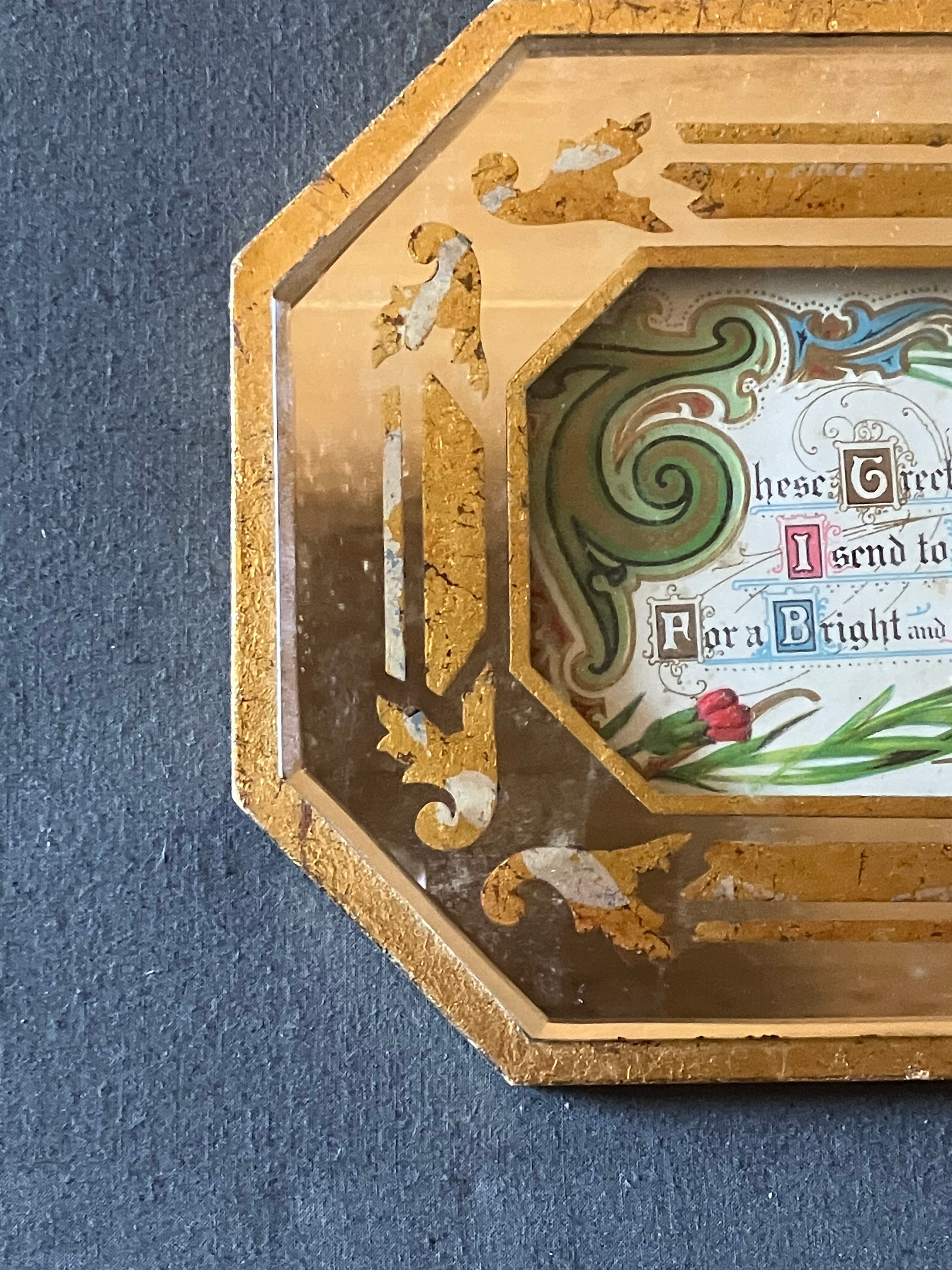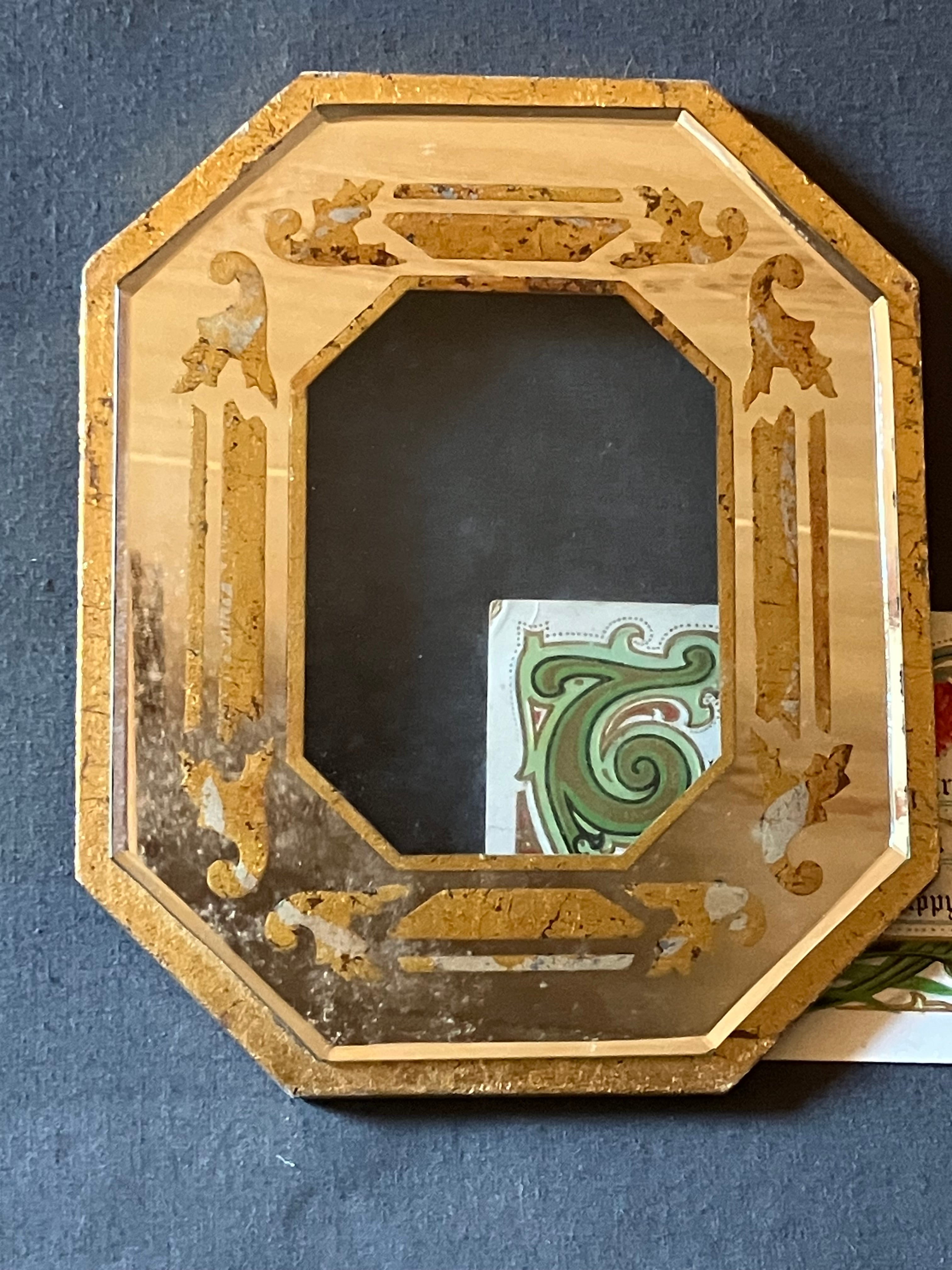 ガラスにゴールドのインレイが入ったフレームです。おそらく裏かついていましたが、無くなっています。裏側にカケがあります。表からは見えません。それらを鑑みたお値段です。ディスプレイ台としてお使い頂いてはいかがでしょうか。カーネーションのポストカードもセットです。フランスビンテージ。