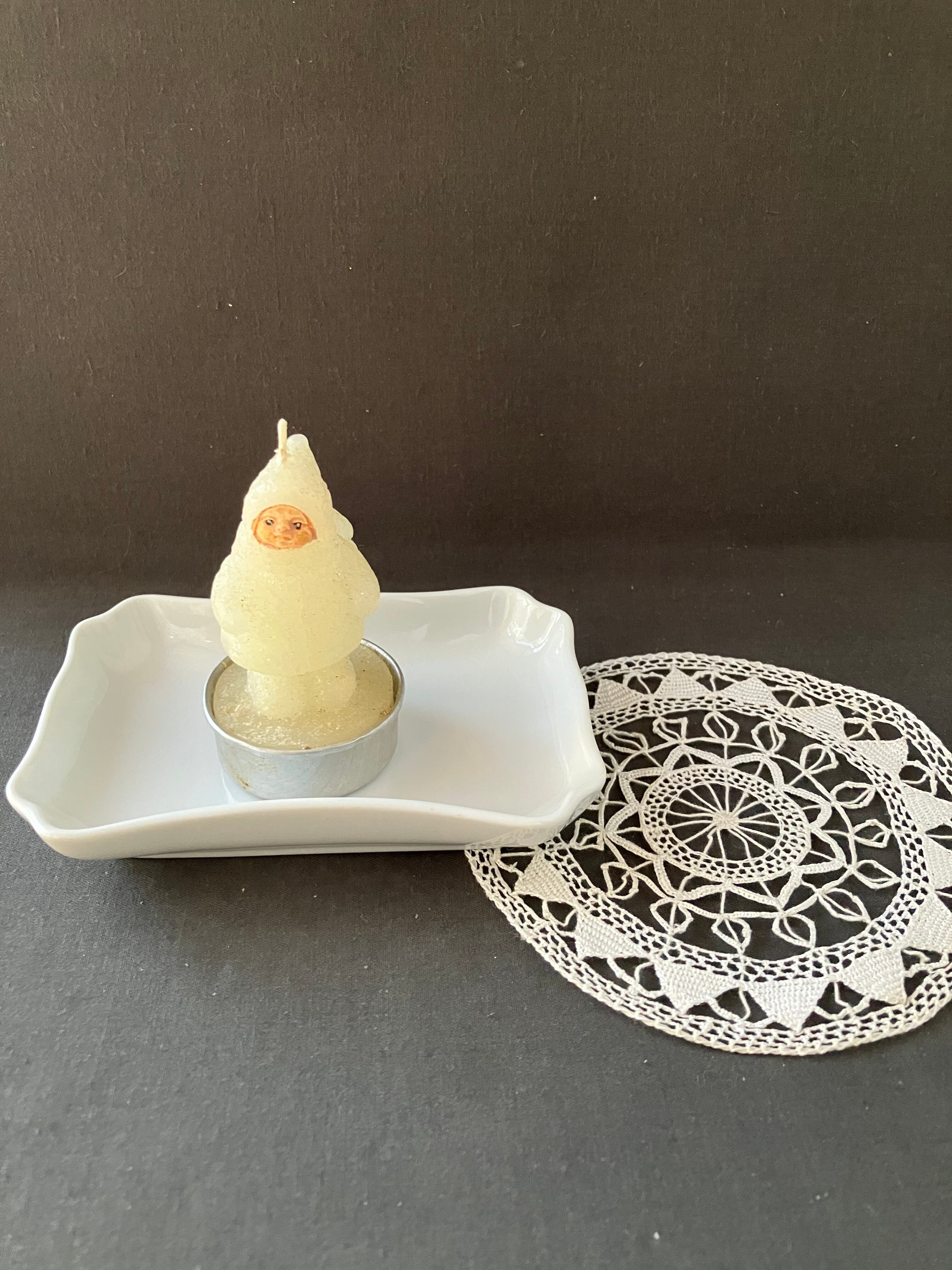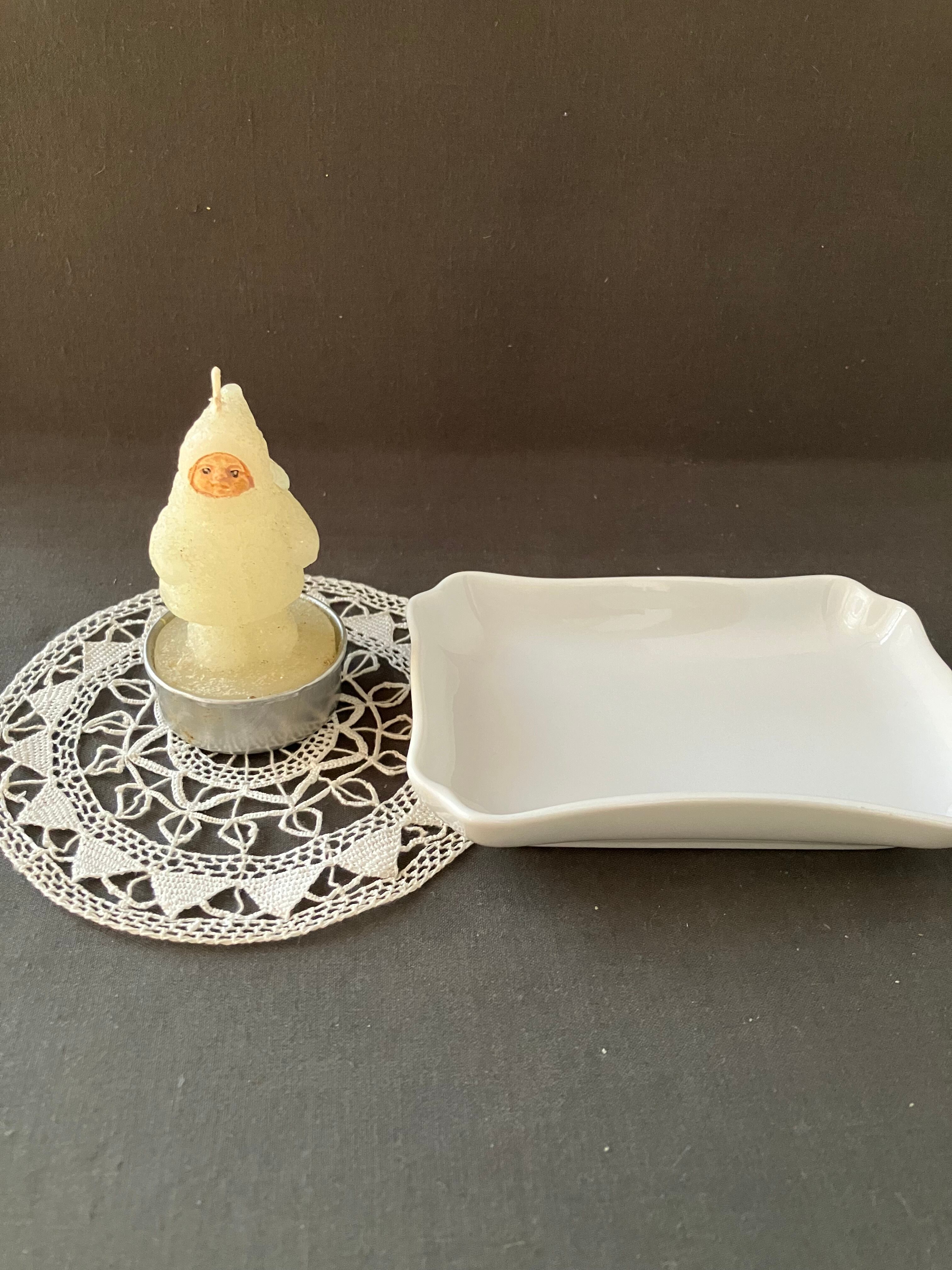 ぽってりとしたポーセリン製のアクセサリートレイとクロッシェレースのドイリー スノーベビーのキャンドルのセットです。フランスビンテージ。