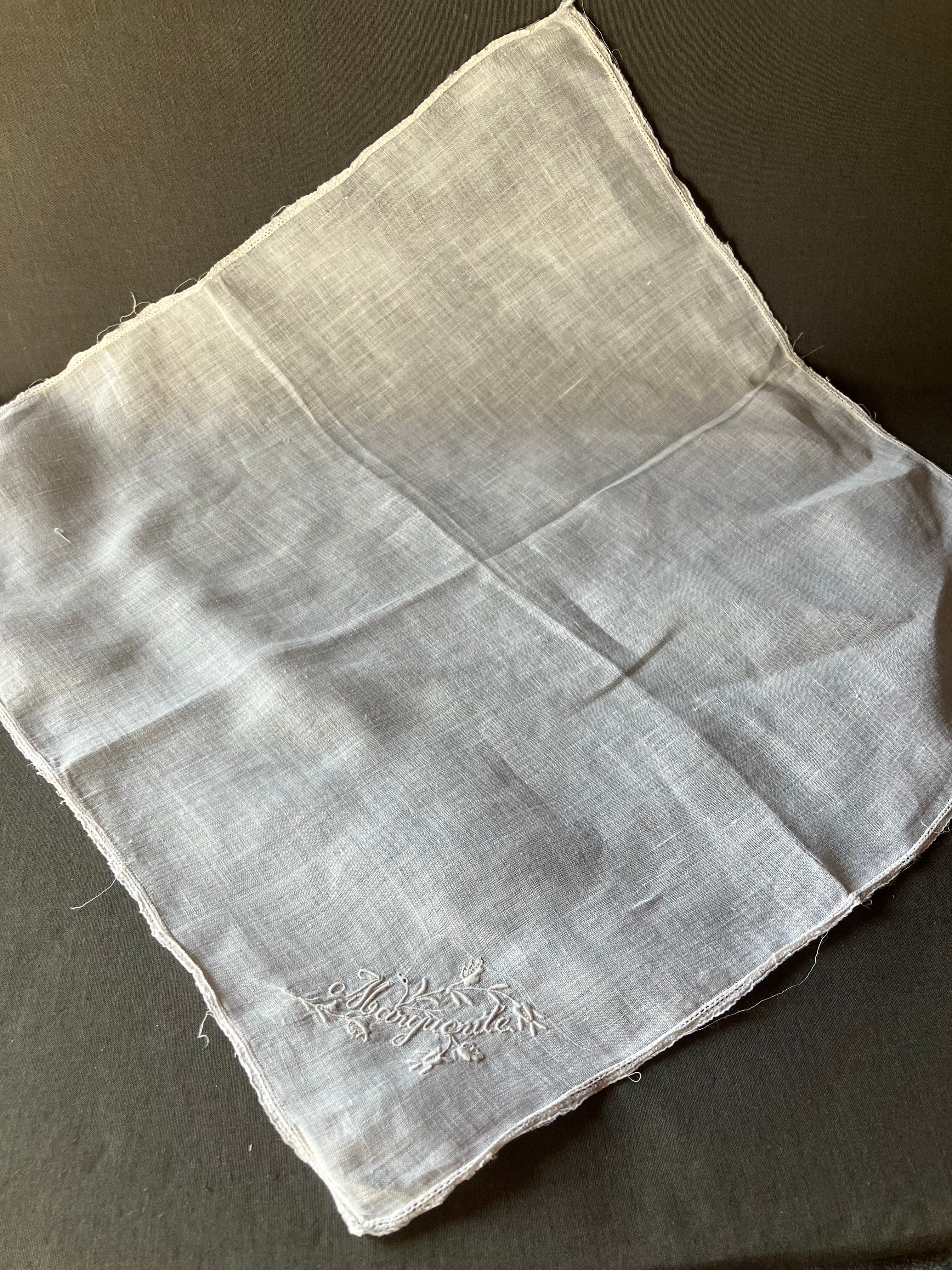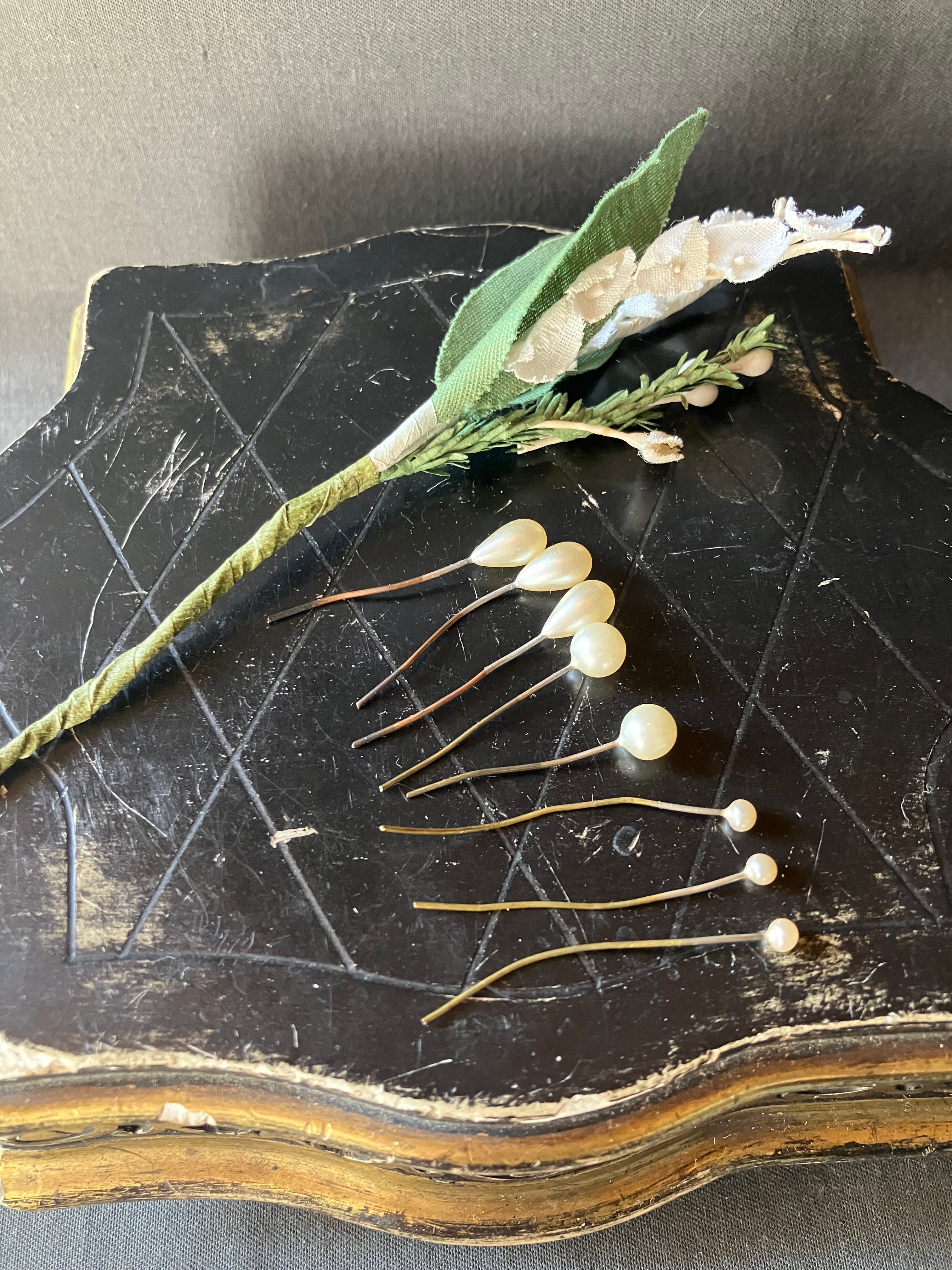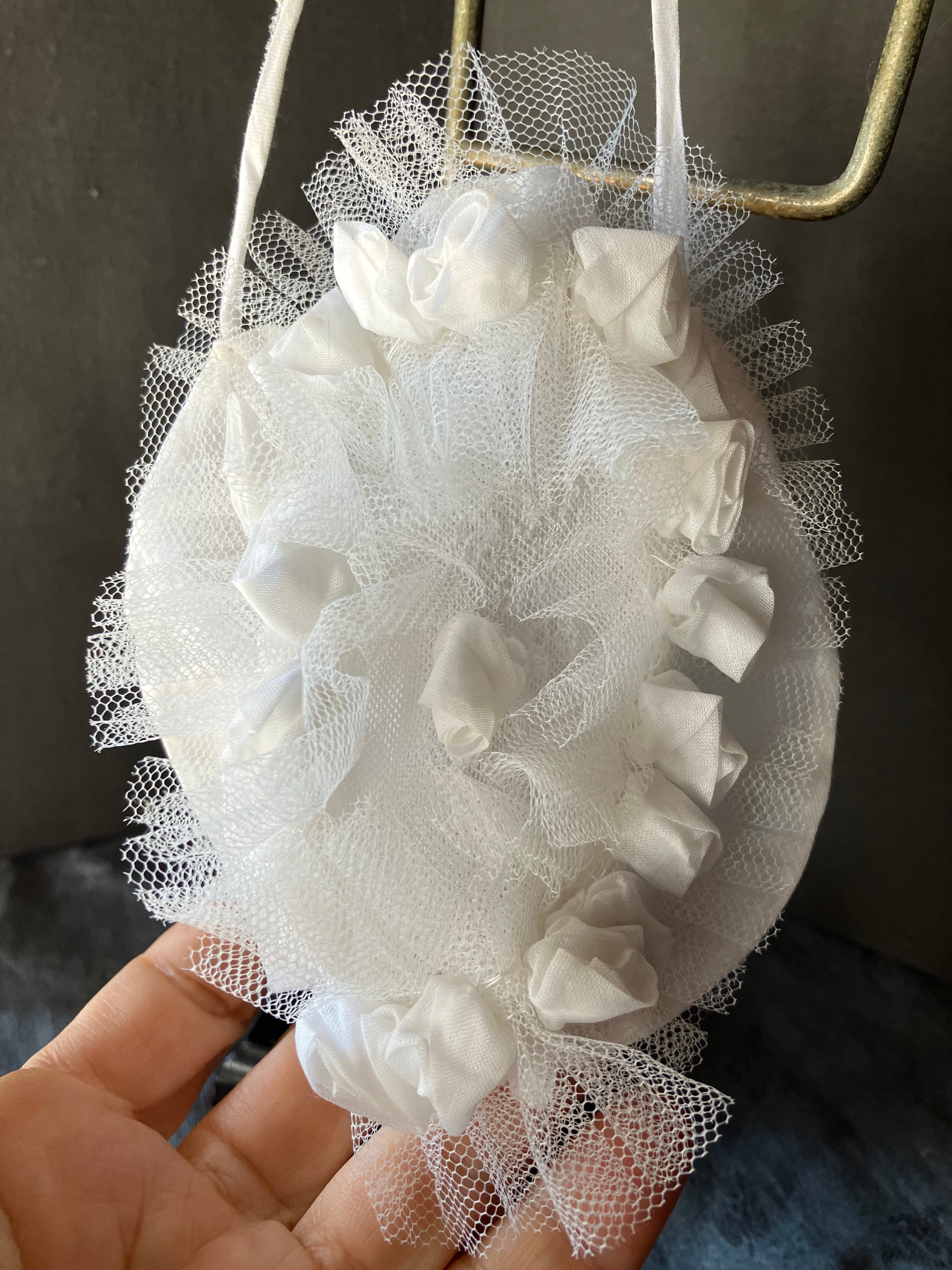 初聖体に腰から下げるプティサックと刺繍入りのハンキーケース、そして素晴らしいミクロ刺繍のハンキーと刺繍襟、レースリボン2本、スズランのブケ、パールピン8本のセットです。フランスアンティーク。