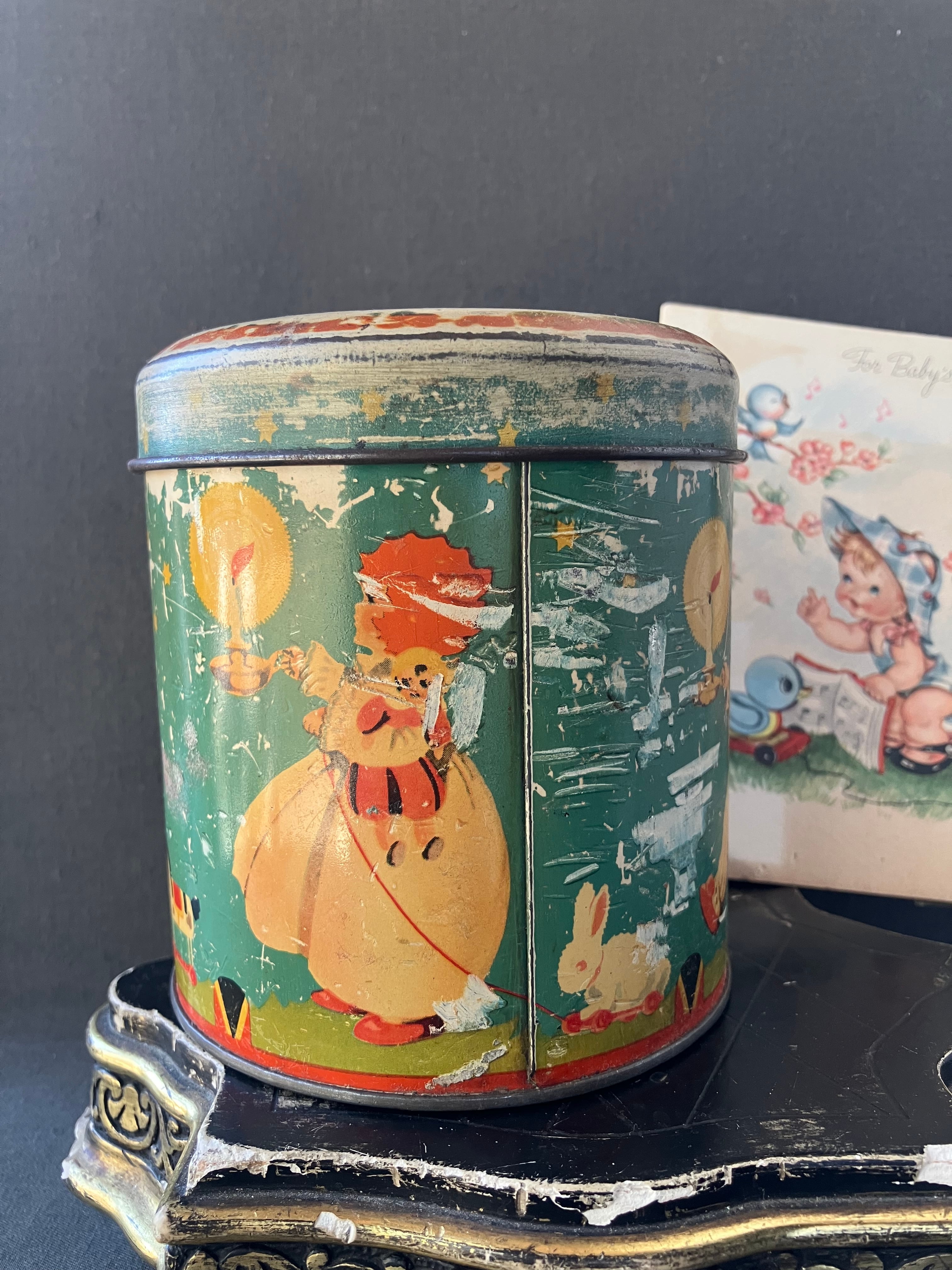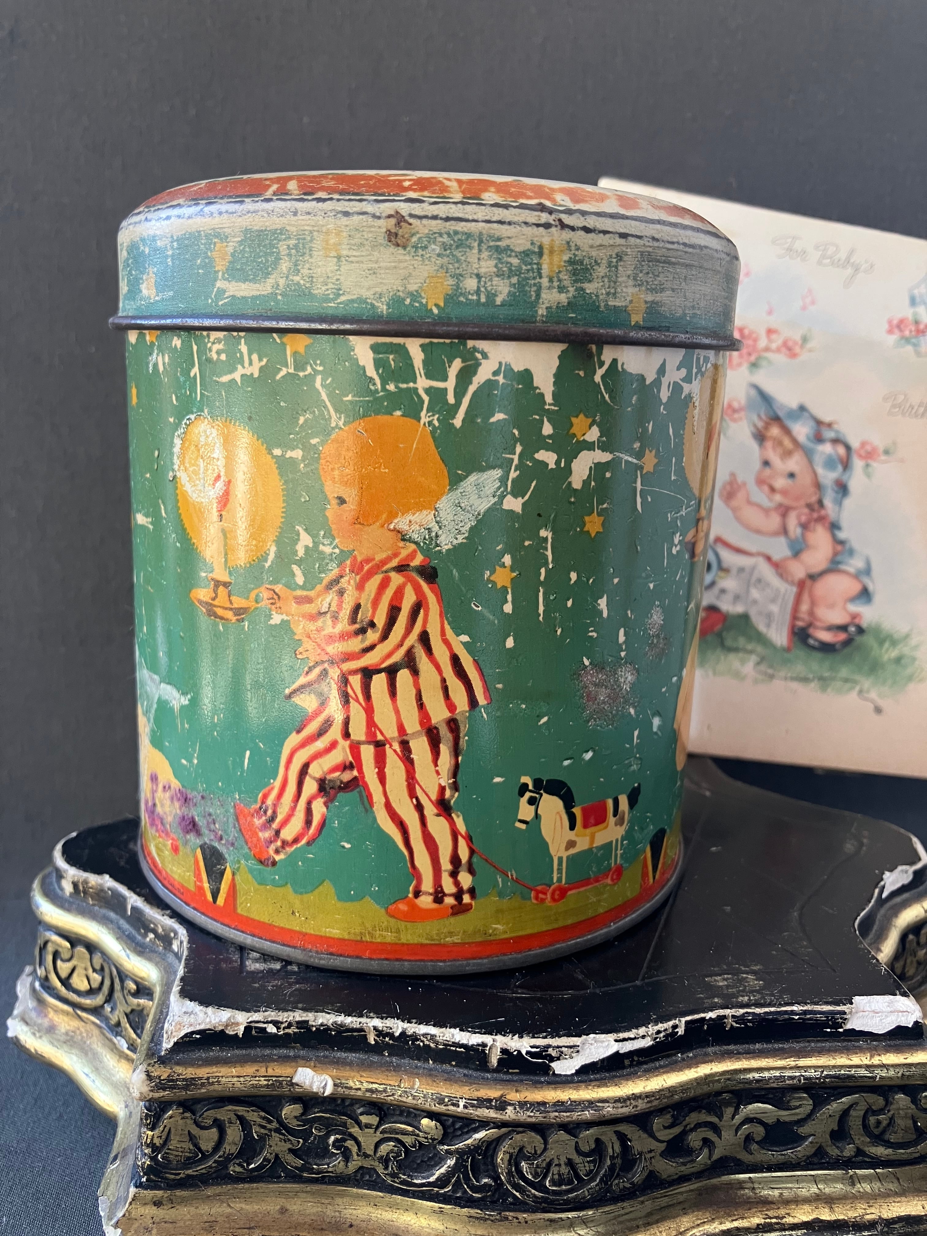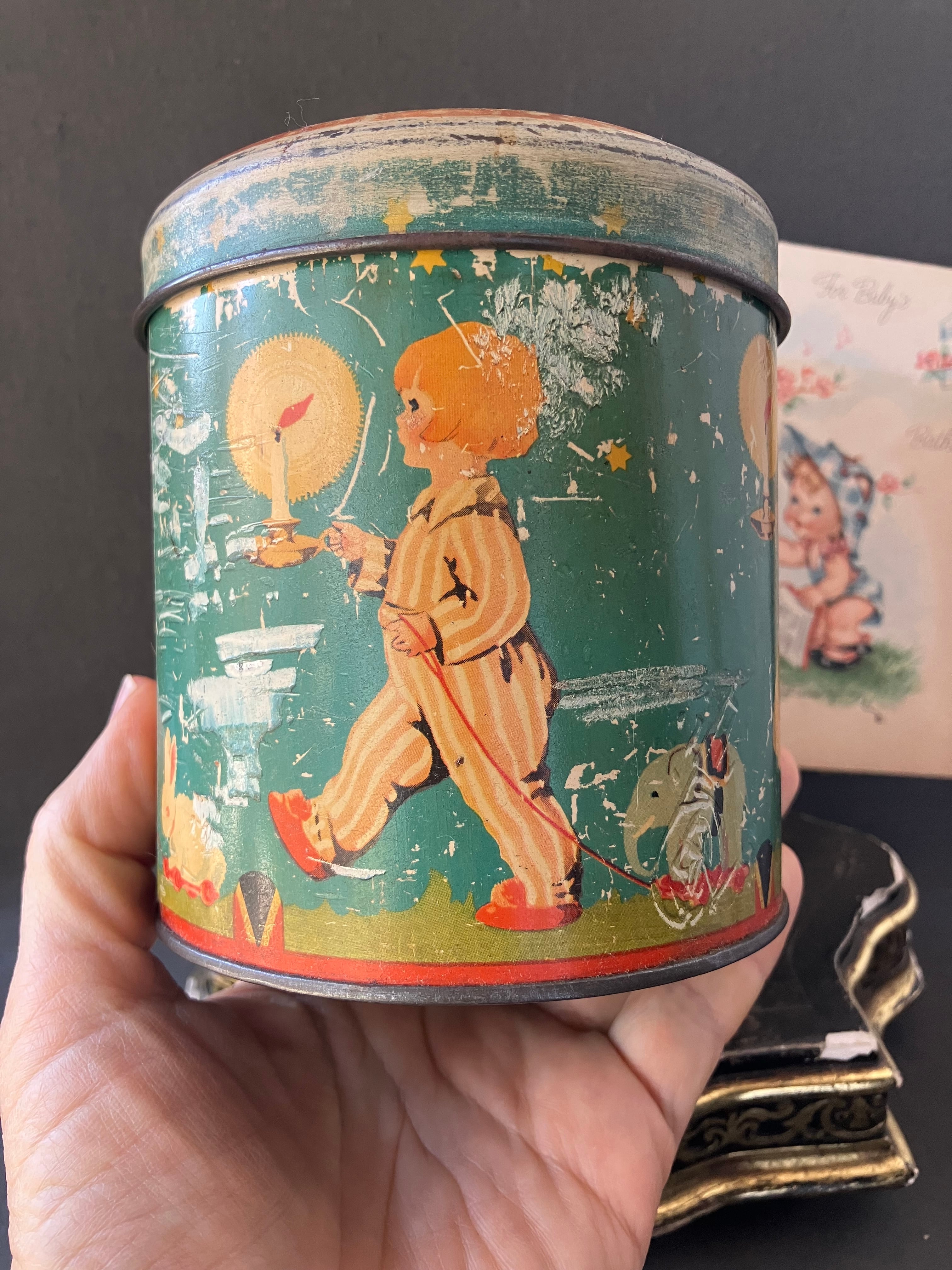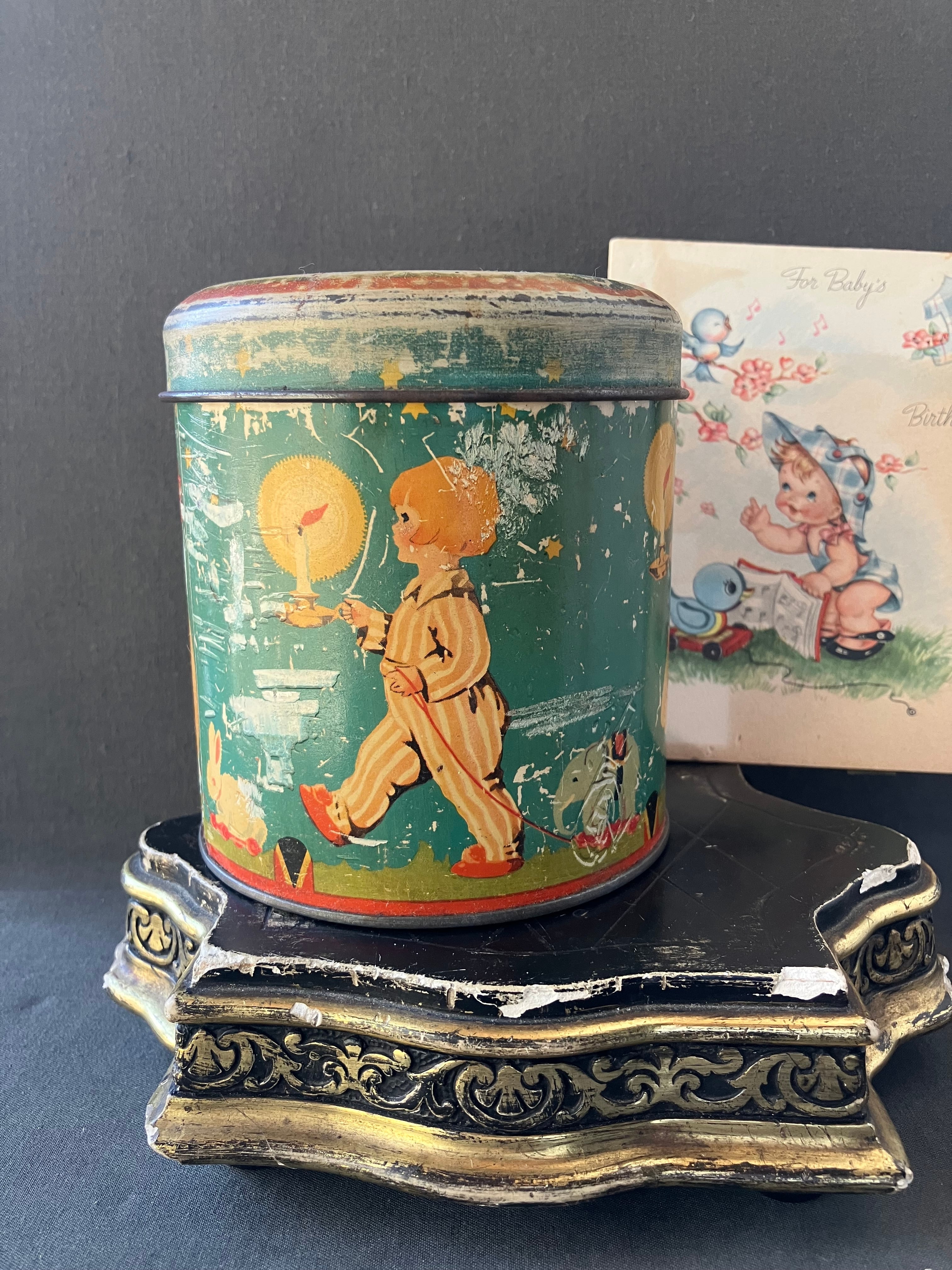 少女や少年がドゥドゥ(お気に入りのおもちゃ)を引っ張る愛らしいTIN缶です。モスグリーンの背景に羊やら馬、ウサギ、ぞうさんなどを引っ張っています。同じ世界感のカードもお付けします。缶はフランスアンティーク。カードはUSAビンテージです。