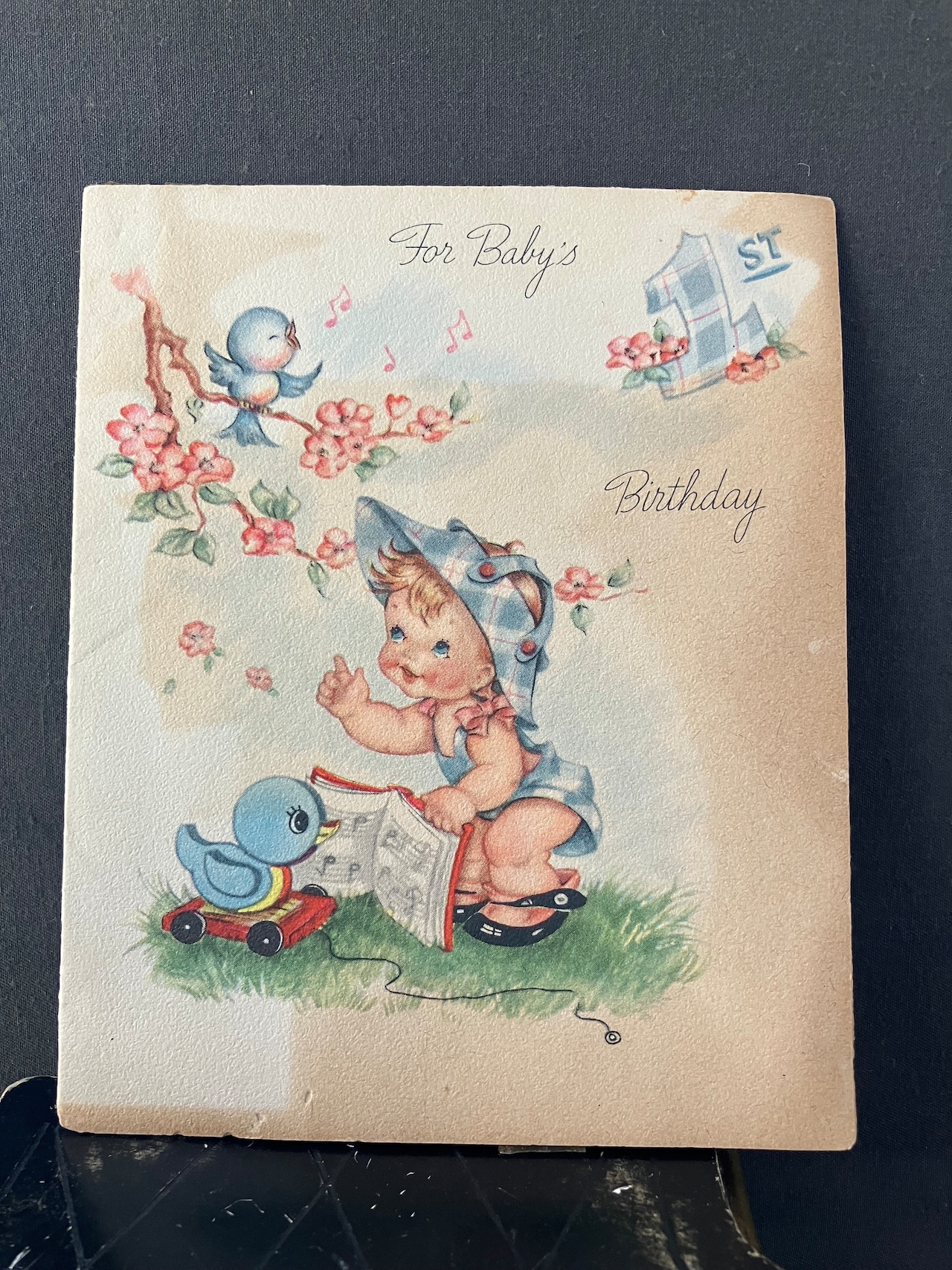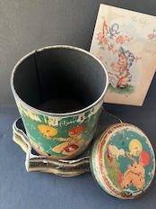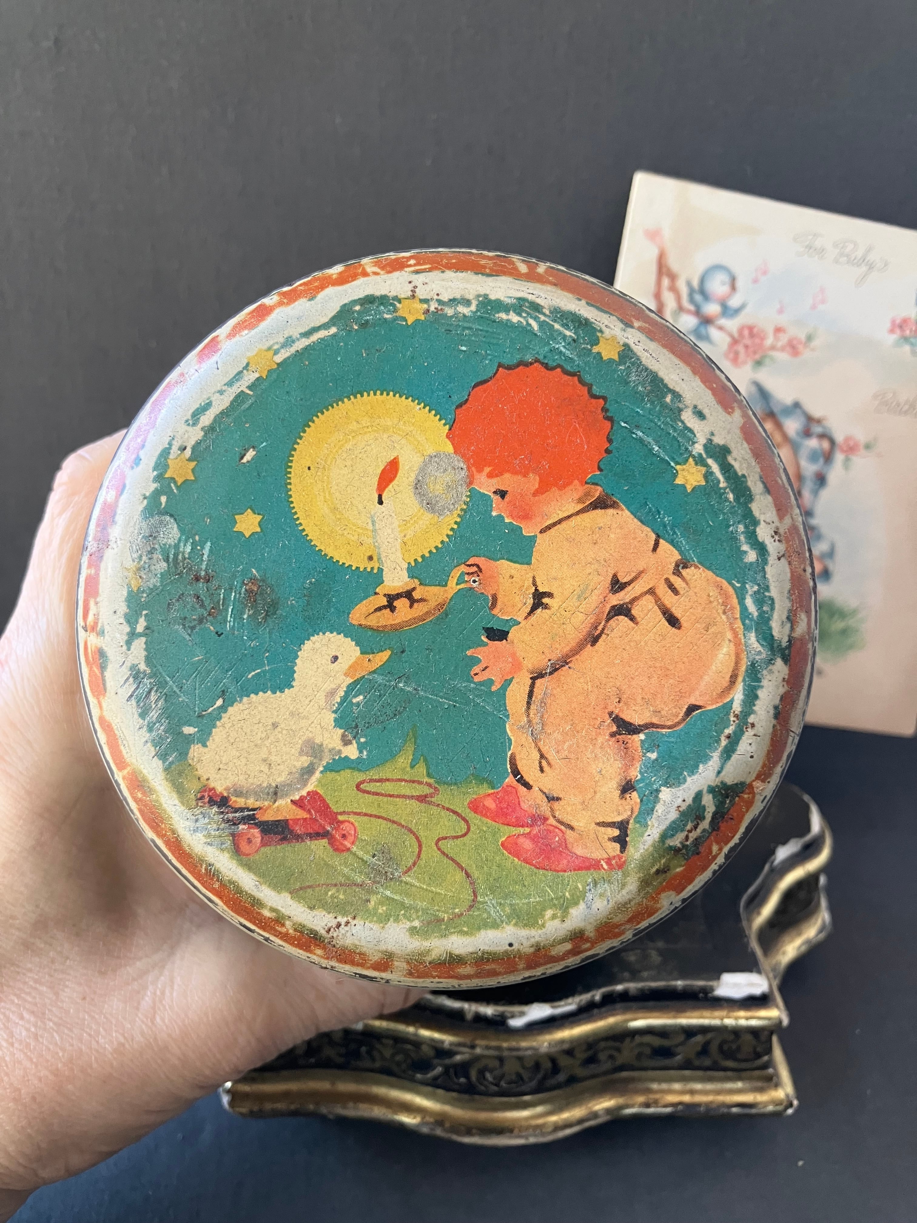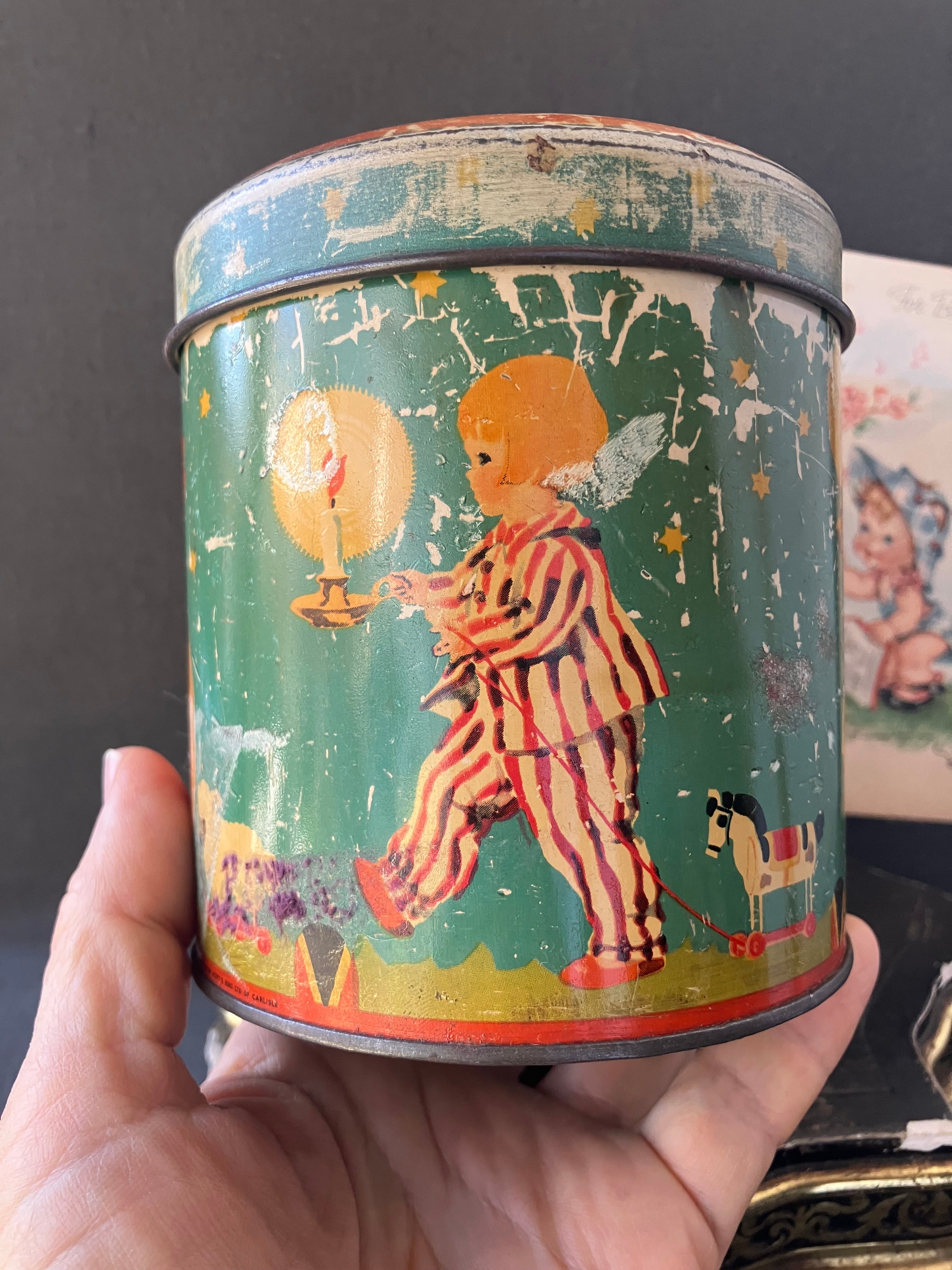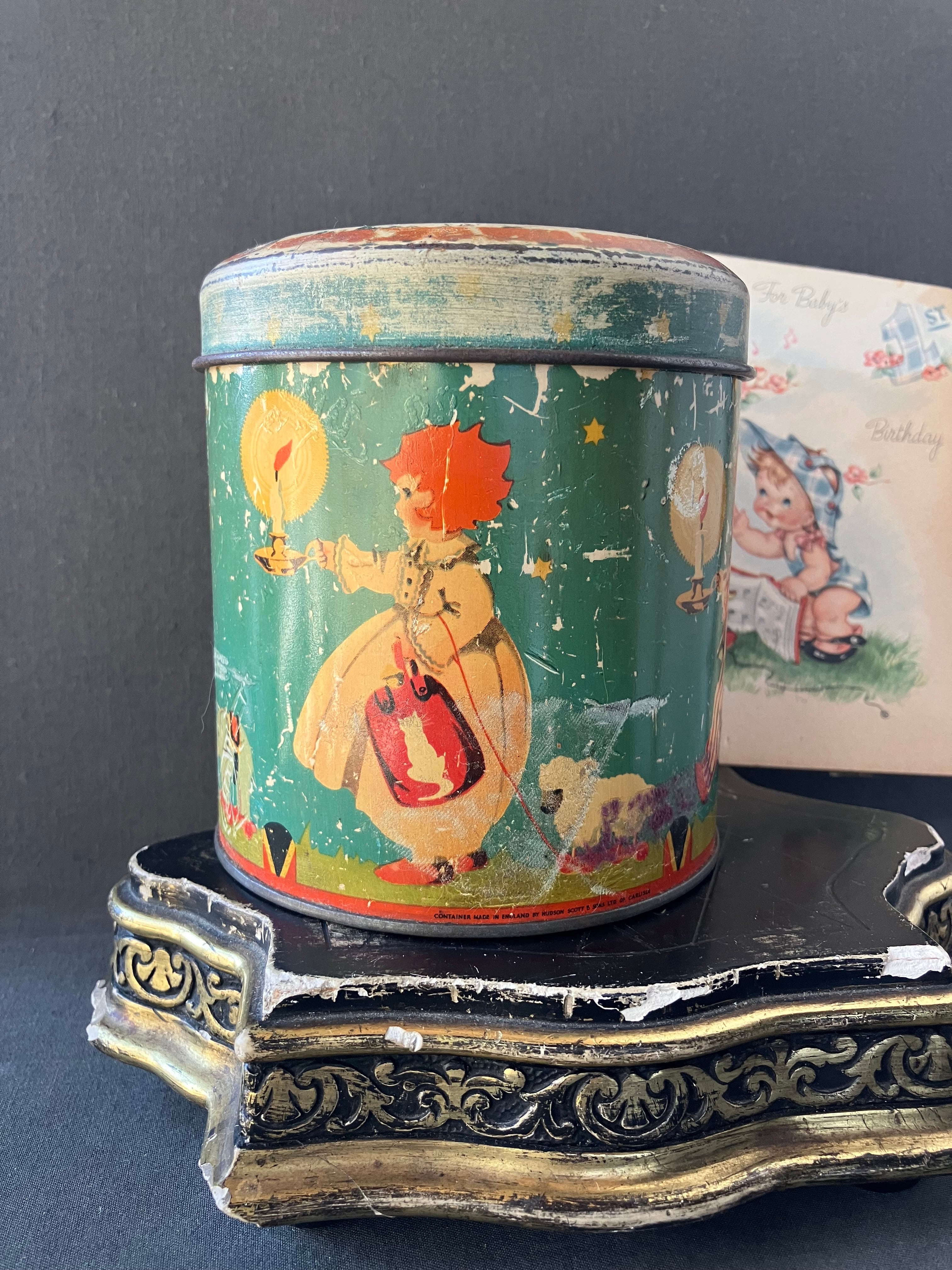 少女や少年がドゥドゥ(お気に入りのおもちゃ)を引っ張る愛らしいTIN缶です。モスグリーンの背景に羊やら馬、ウサギ、ぞうさんなどを引っ張っています。同じ世界感のカードもお付けします。缶はフランスアンティーク。カードはUSAビンテージです。