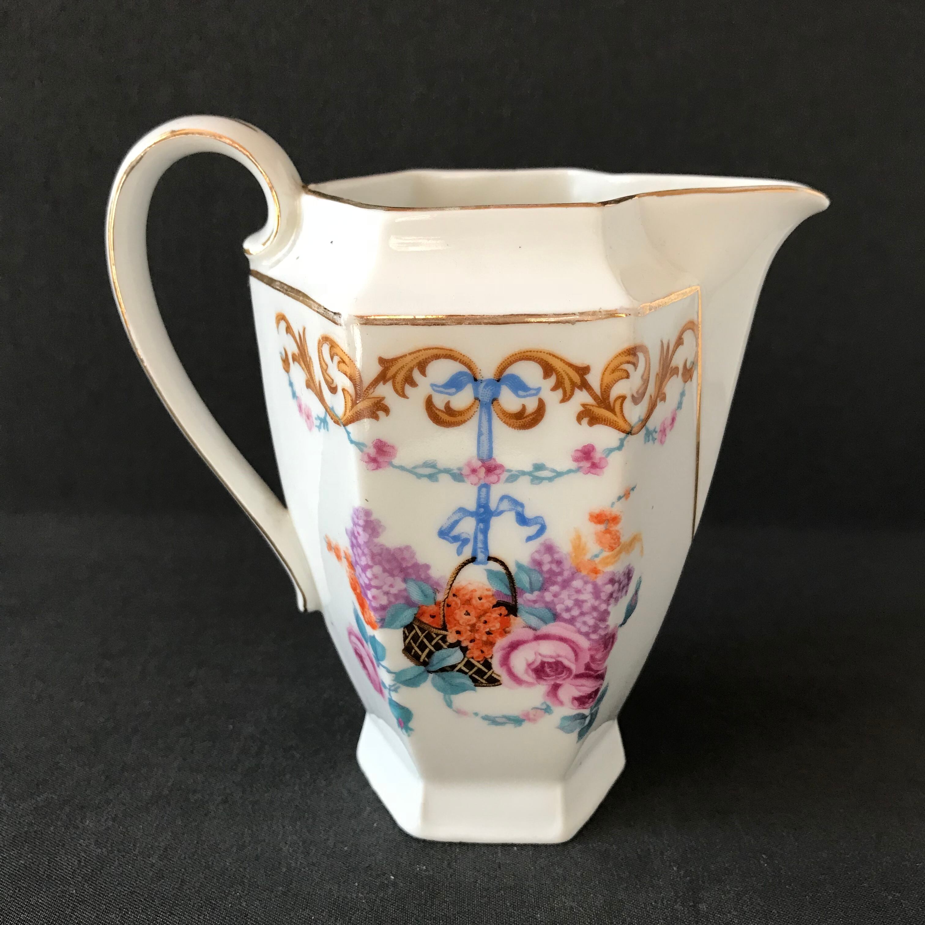 ・口部分 縦 7㎝ 横 8㎝ 高さ 11.5㎝ リモージュ のバラとパニエとリボンとライラックが可愛らしいクレミエです。ヒビカケなく良い状態です。フランスビンテージ。