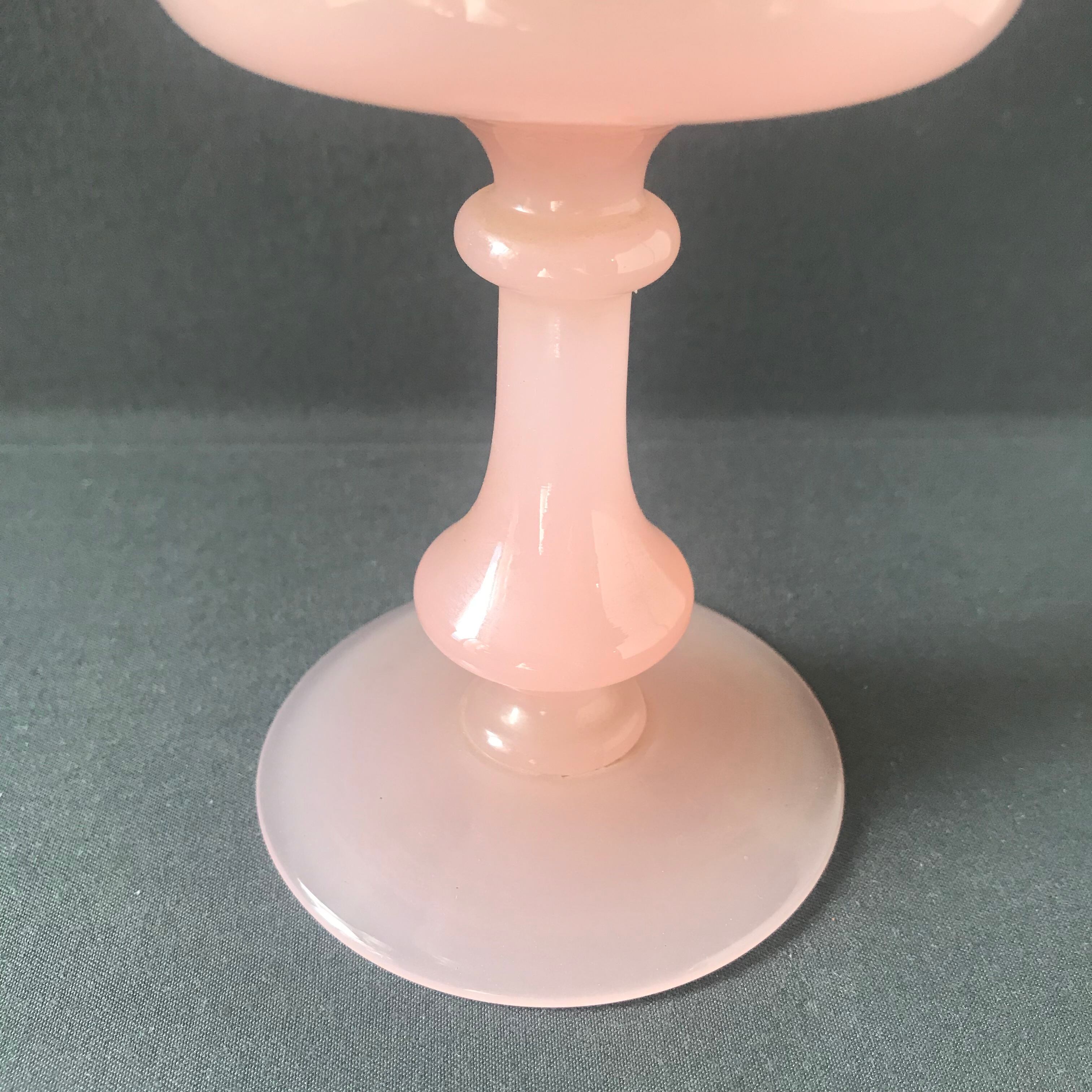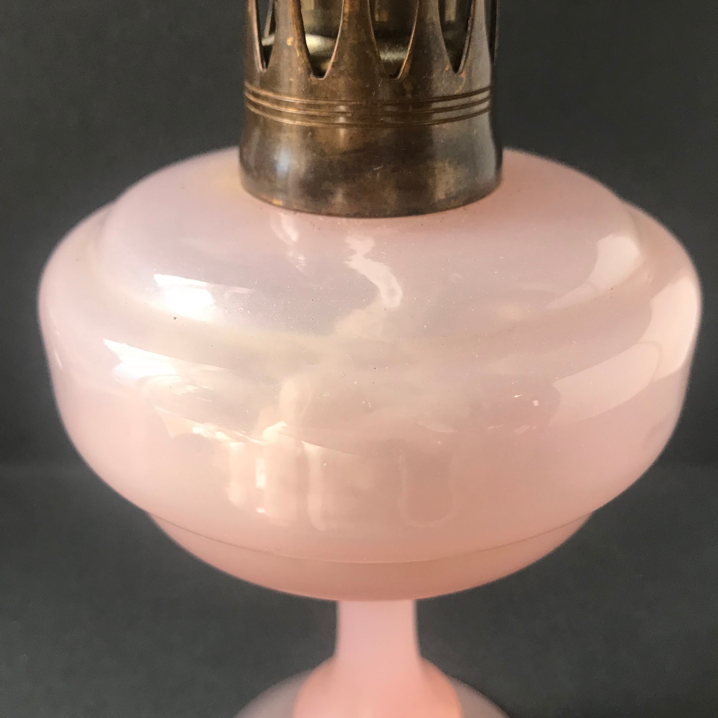・直径 9.5㎝ 高さ 20.5㎝ ピンクオパーリン(オパールセントガラス)の綺麗なランプベルジュです。このエレガントな型は大変珍しいです。アロマオイルを入れて炊き香りを楽しむものです。昔は薬用で使われていました。芯は現代のものに替えてあります。中に若干の汚れがある以外ヒビカケ無く良い状態です。フランスアンティーク。