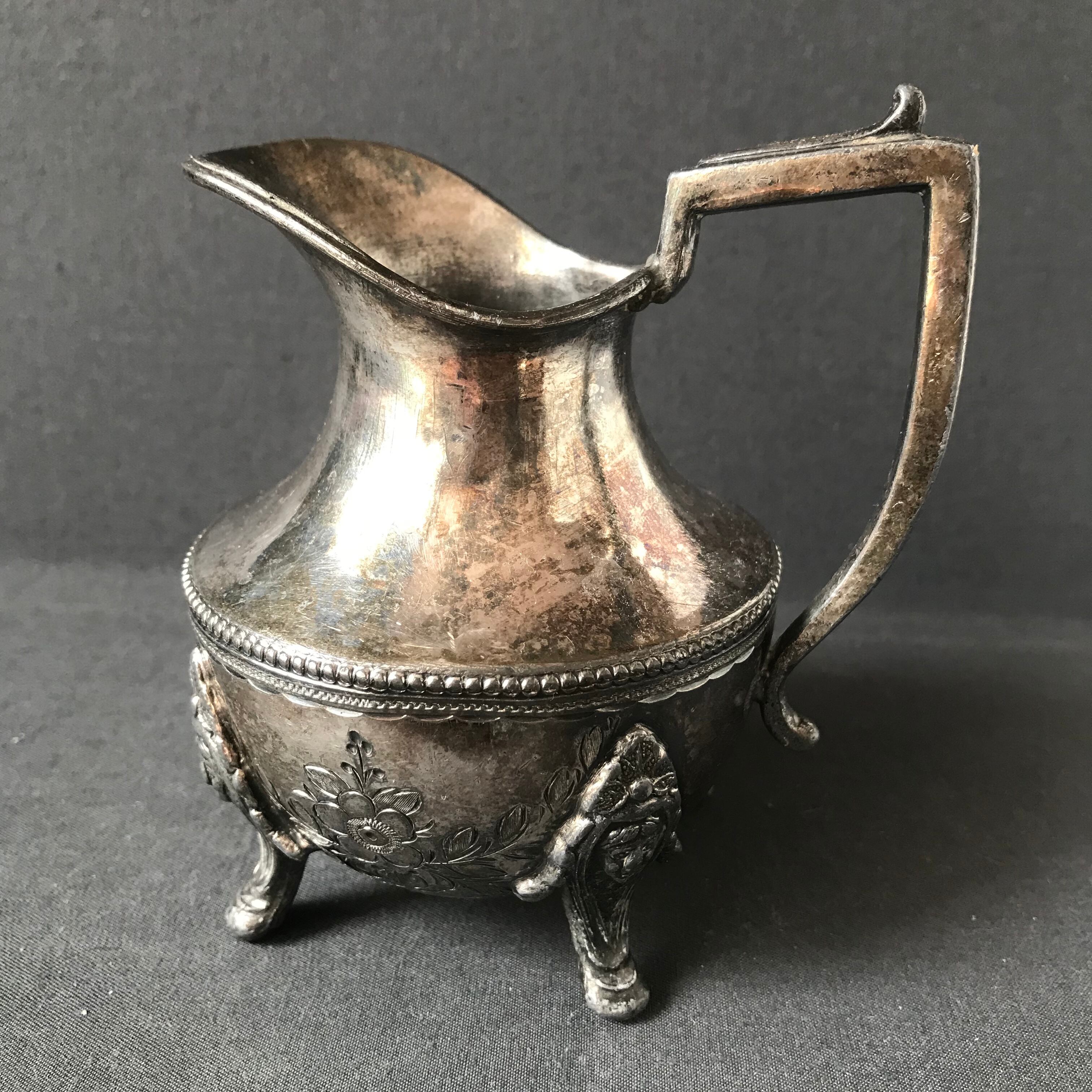 ・口部分 縦 5㎝ 横 6㎝ 全体高さ 11㎝ シルバープレートのクレミエです。4本の足にはグリーンマン、お花のエンボスも綺麗なクレミエです。フランスアンティーク。