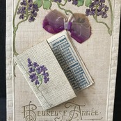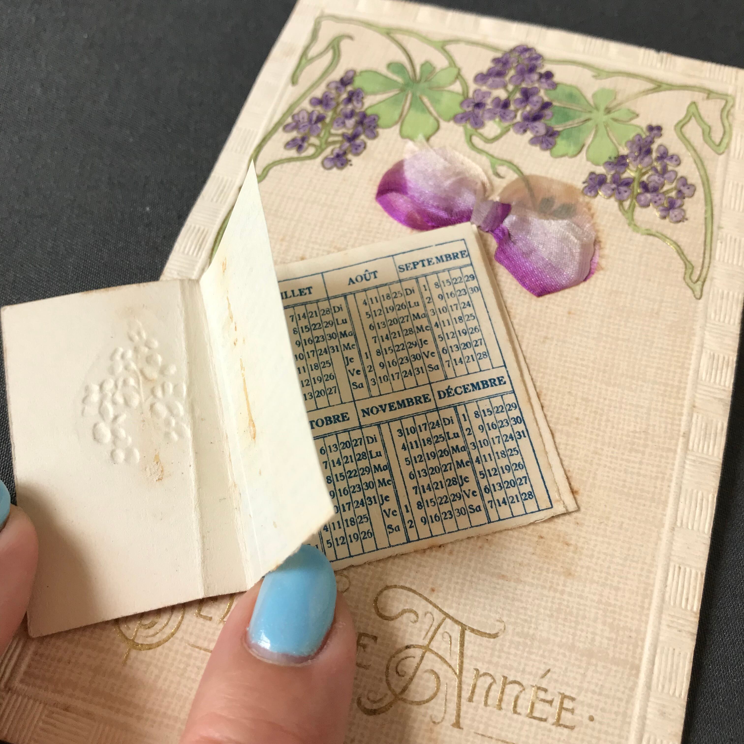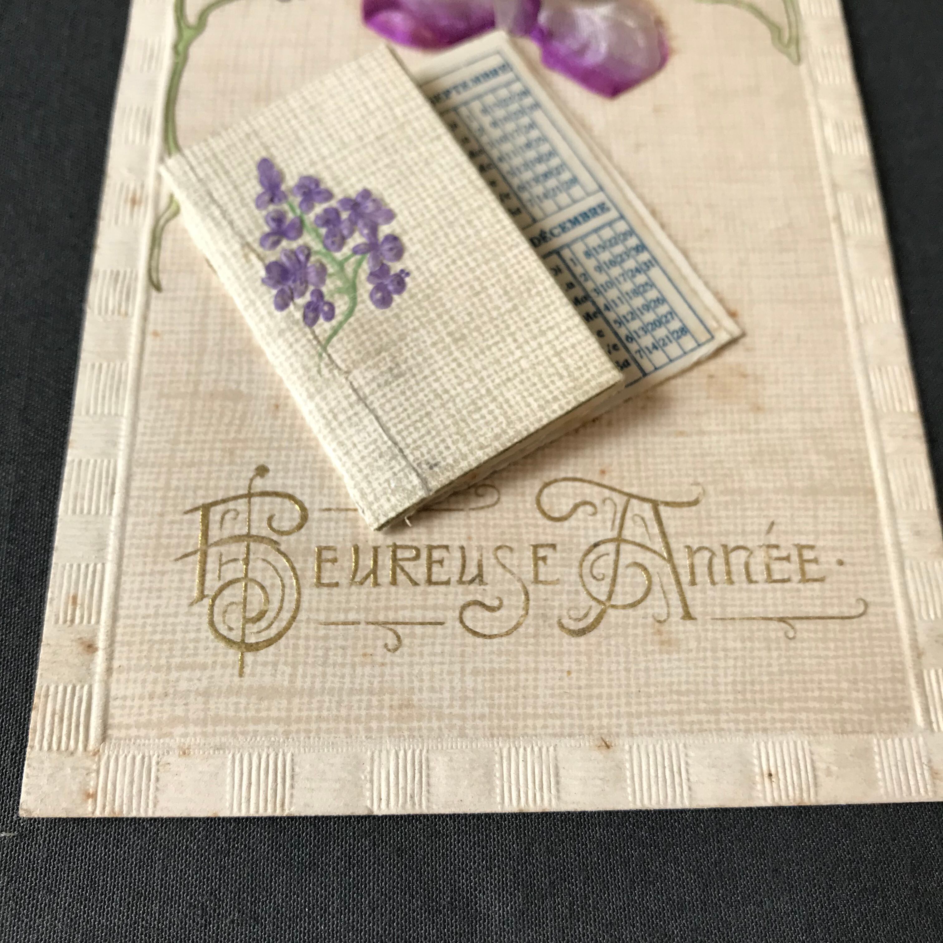 ・縦 14 ㎝ 横 9㎝ エンボスが施されたカードにヌーボーのマロニエの花、スミレ色の綺麗な花と葉のエンボスにスミレ色のリボンがついています。中央には本の形のカレンダーになっています。大変凝った可愛らしいカードです。フランスビンテージ。