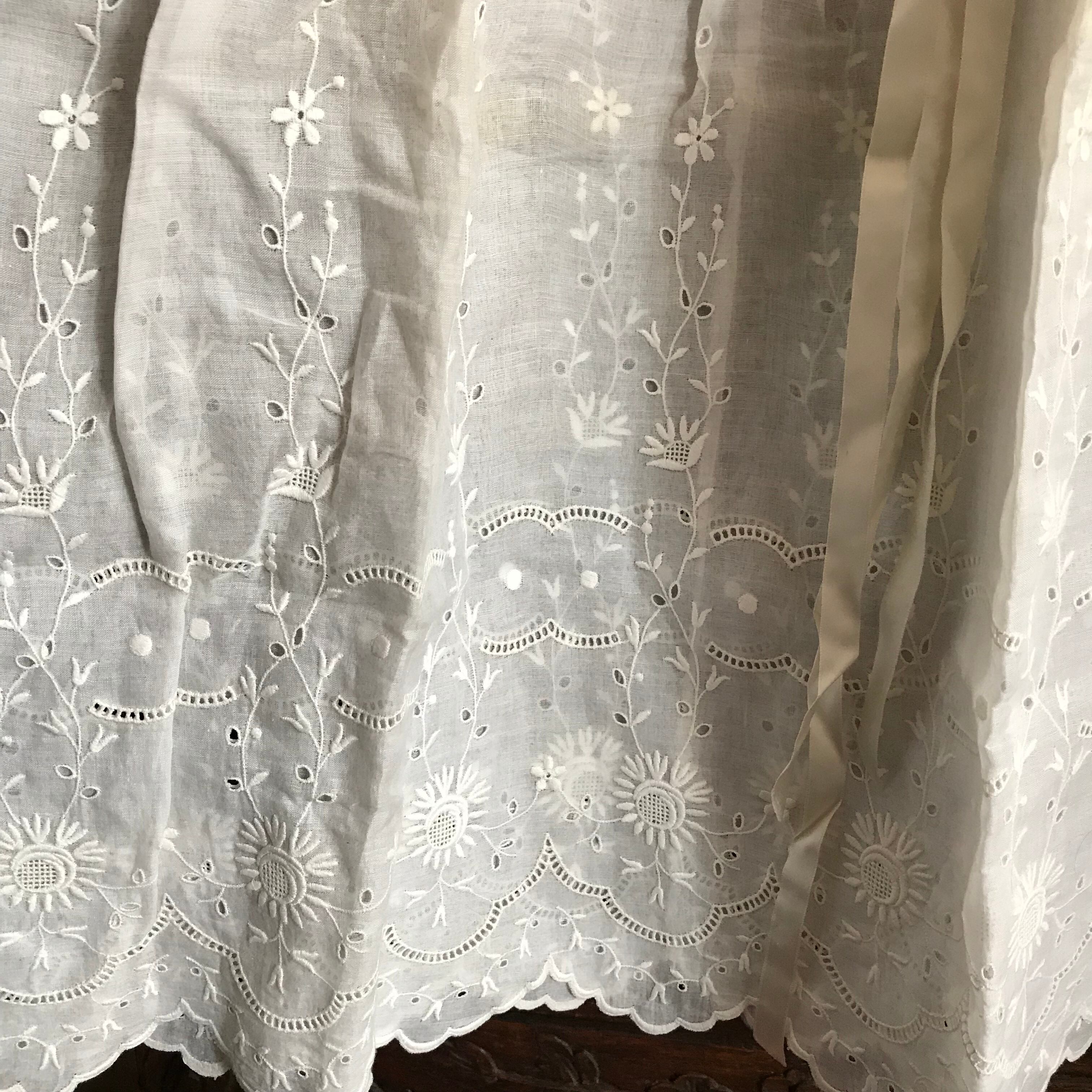 ・平置き 丈 61㎝ 胸囲 31㎝ 綿ローンの生地にマーガレットやリーフの刺繍が入り、シルクリボンのコサージュがついたベビードレスです。フランスアンティーク。