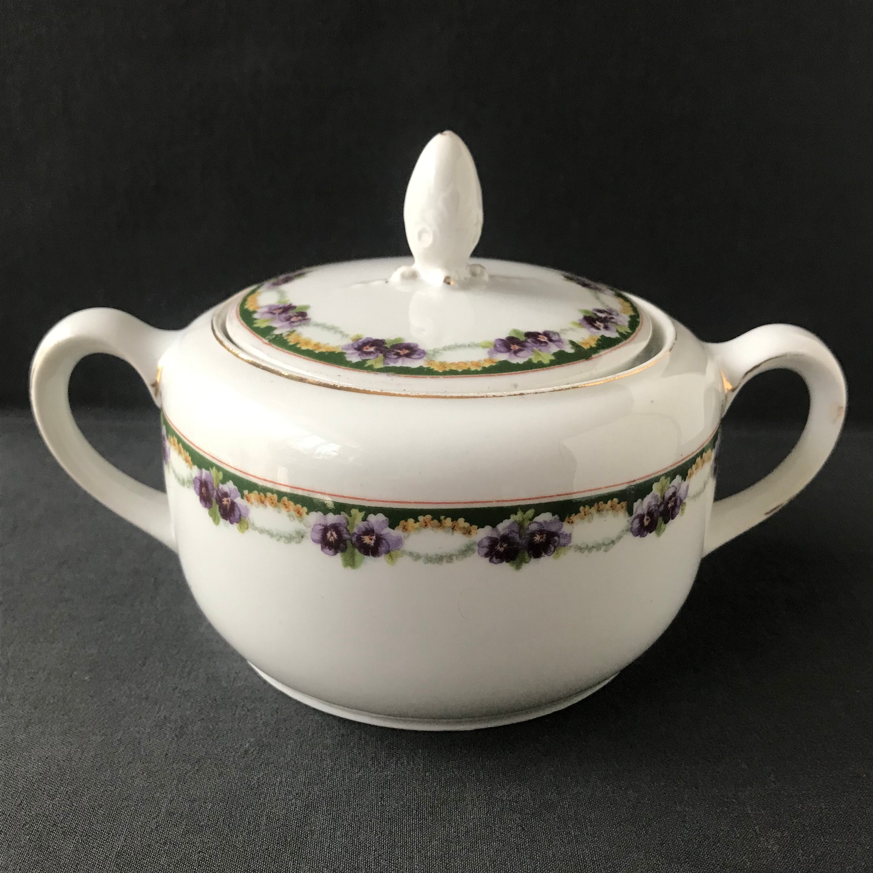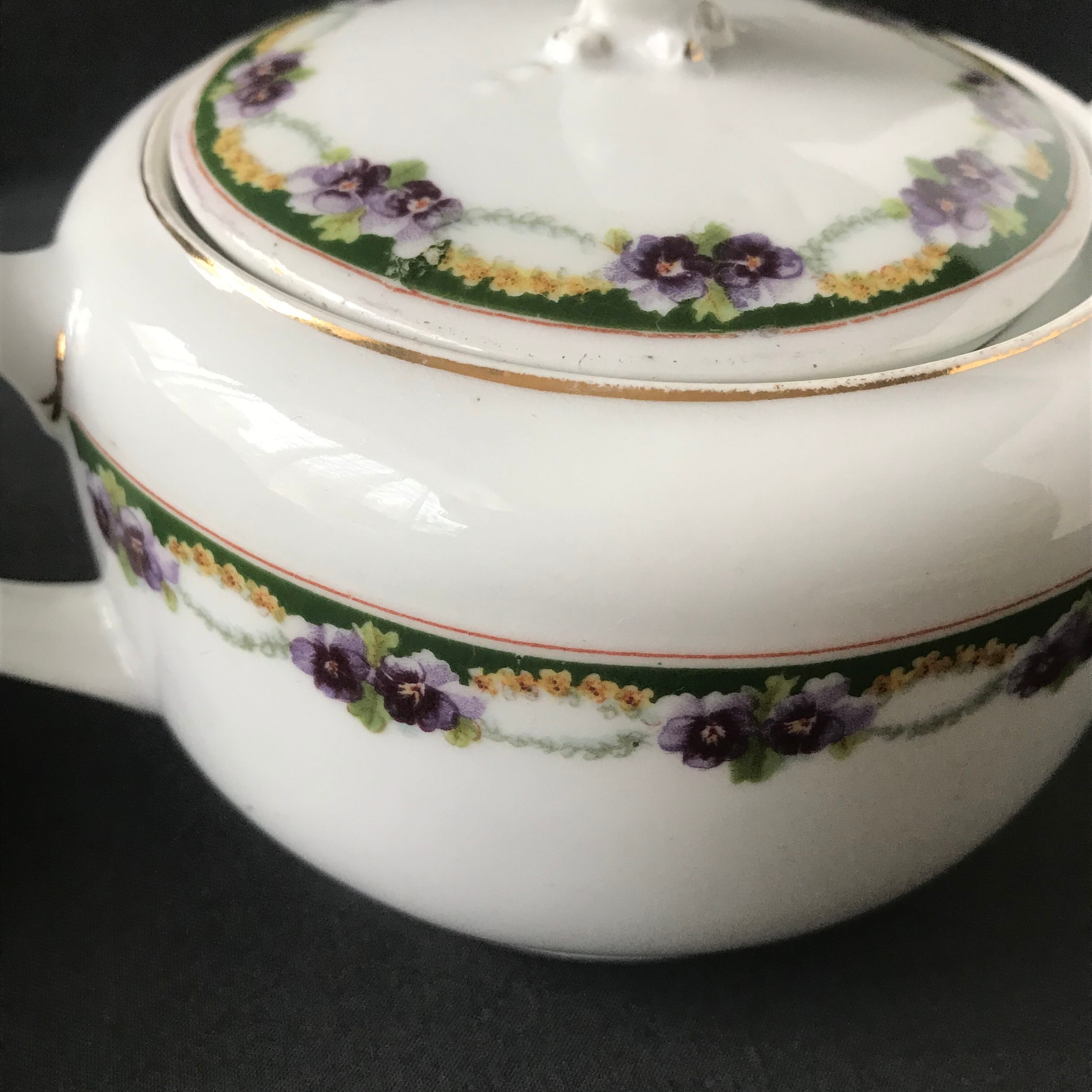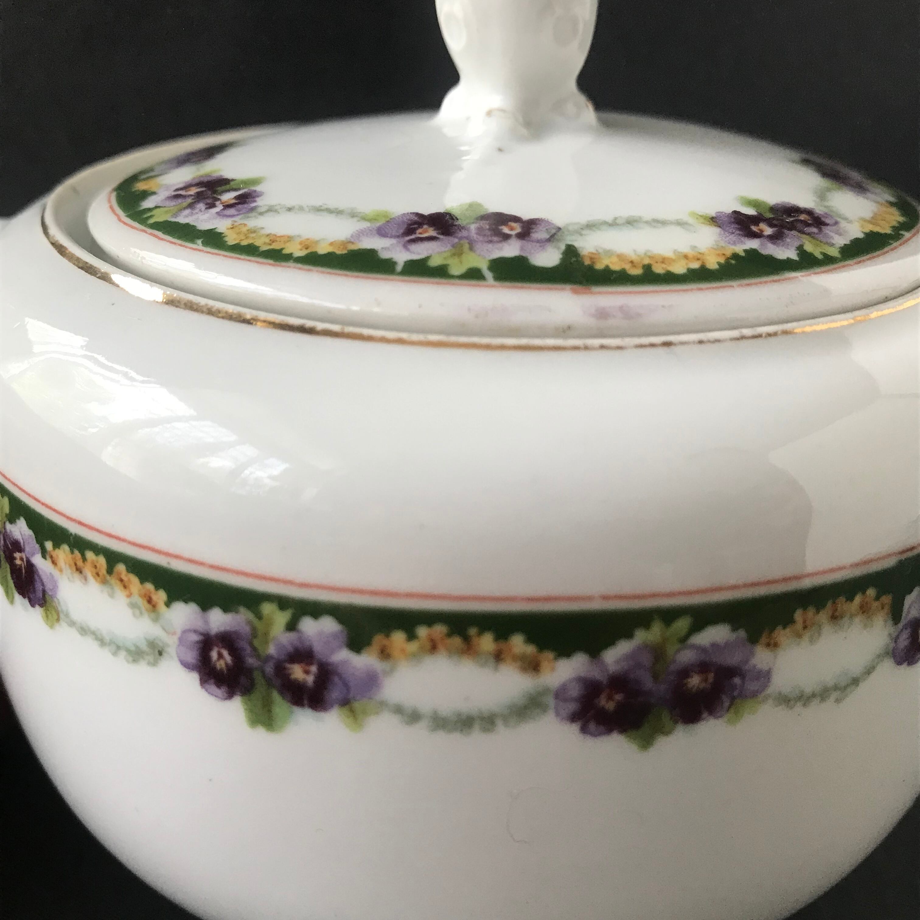 ・直径 10.5㎝ 高さ 9㎝ ドイツ KPMのパンジーのシュクリエです。ペインターサインあります。多少の金彩のスレがあります。中に茶色のシミがあります。前出のクレミエとお揃いです。ドイツビンテージ。