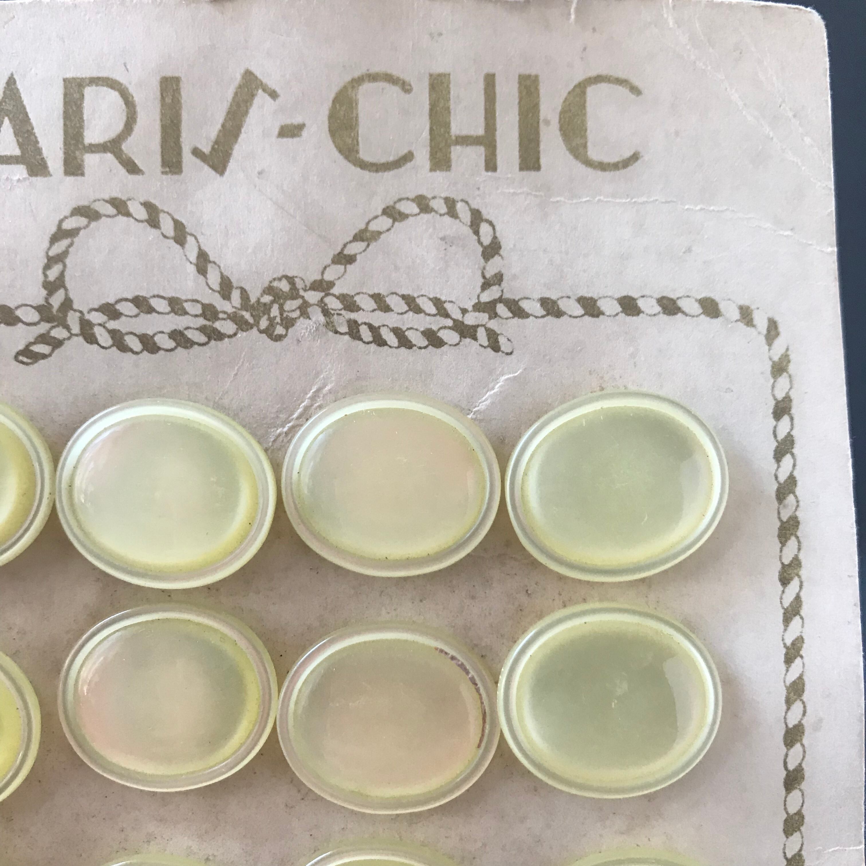 ・縦 19㎝ 横 12㎝ PARIS-CHIC のカードにパールイエロー色のボタンが24個ついています。そのままディスプレイして頂いたり、ボタンを使って頂いても可愛らしいです。フランスビンテージ。