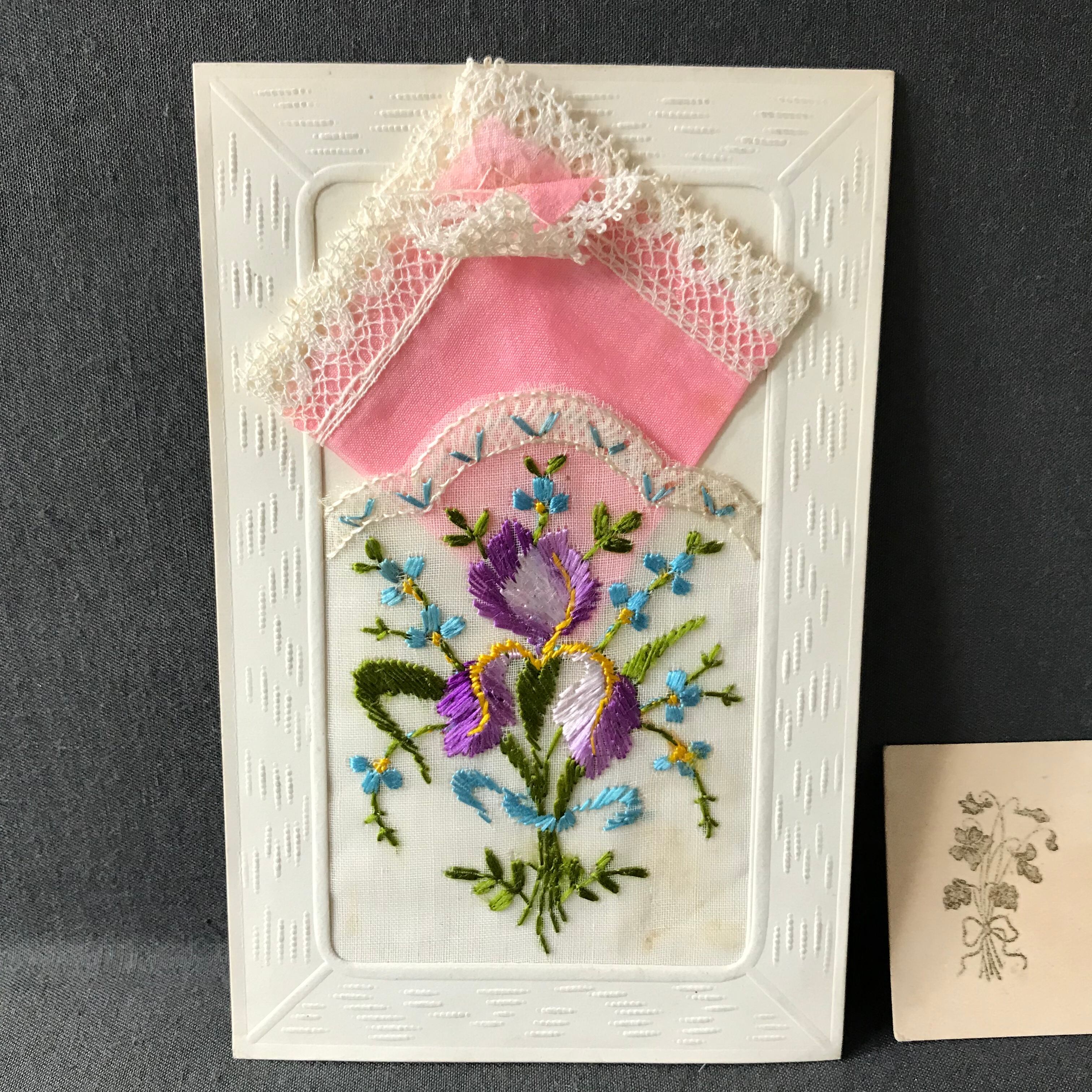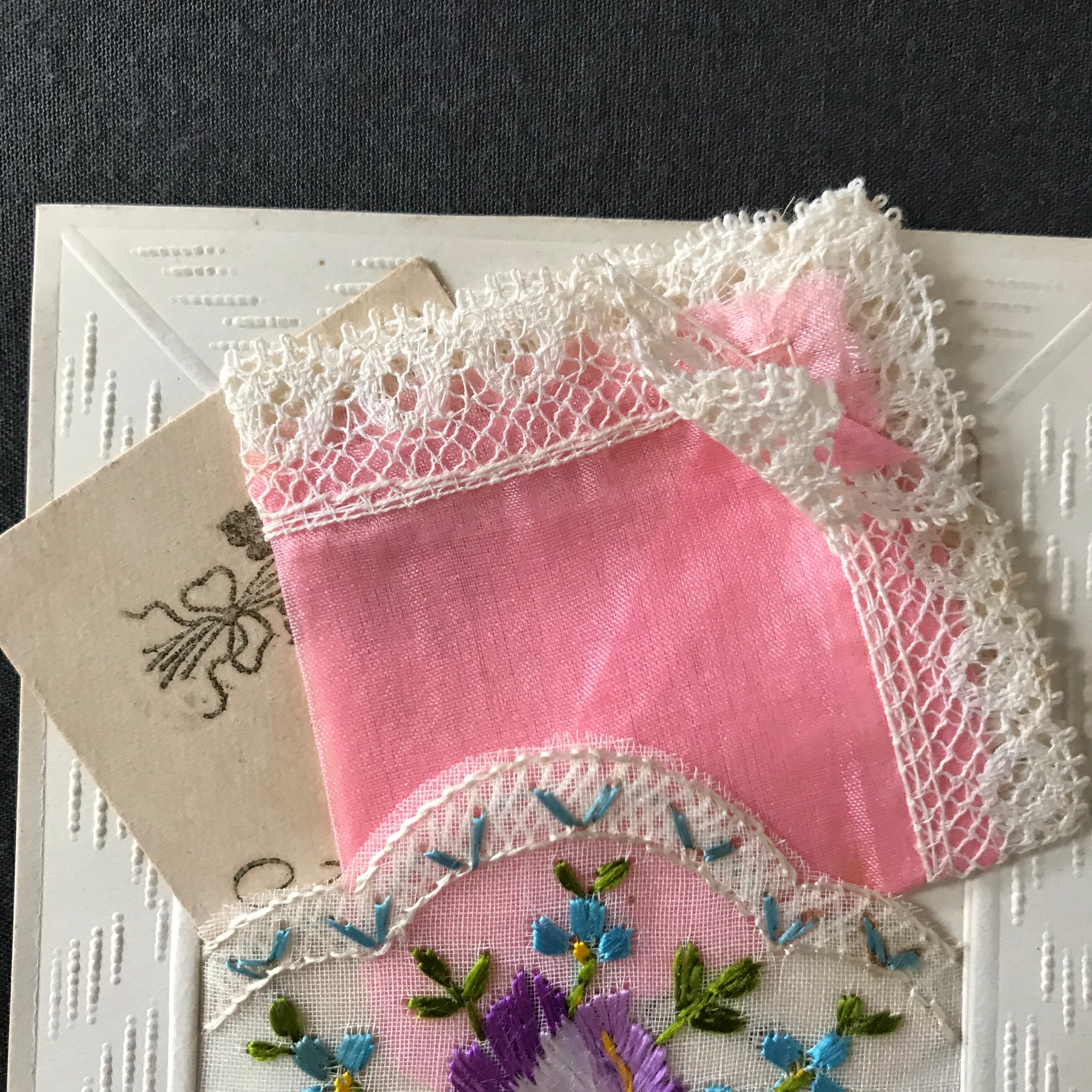 ・縦 14㎝ 横 9㎝ チュールのポケットにアヤメと勿忘草の刺繍が入り、ピンクのレースハンキーが入ったカードです。スミレのカードも入っています。ハンキーは取り出せます。フランスビンテージ。