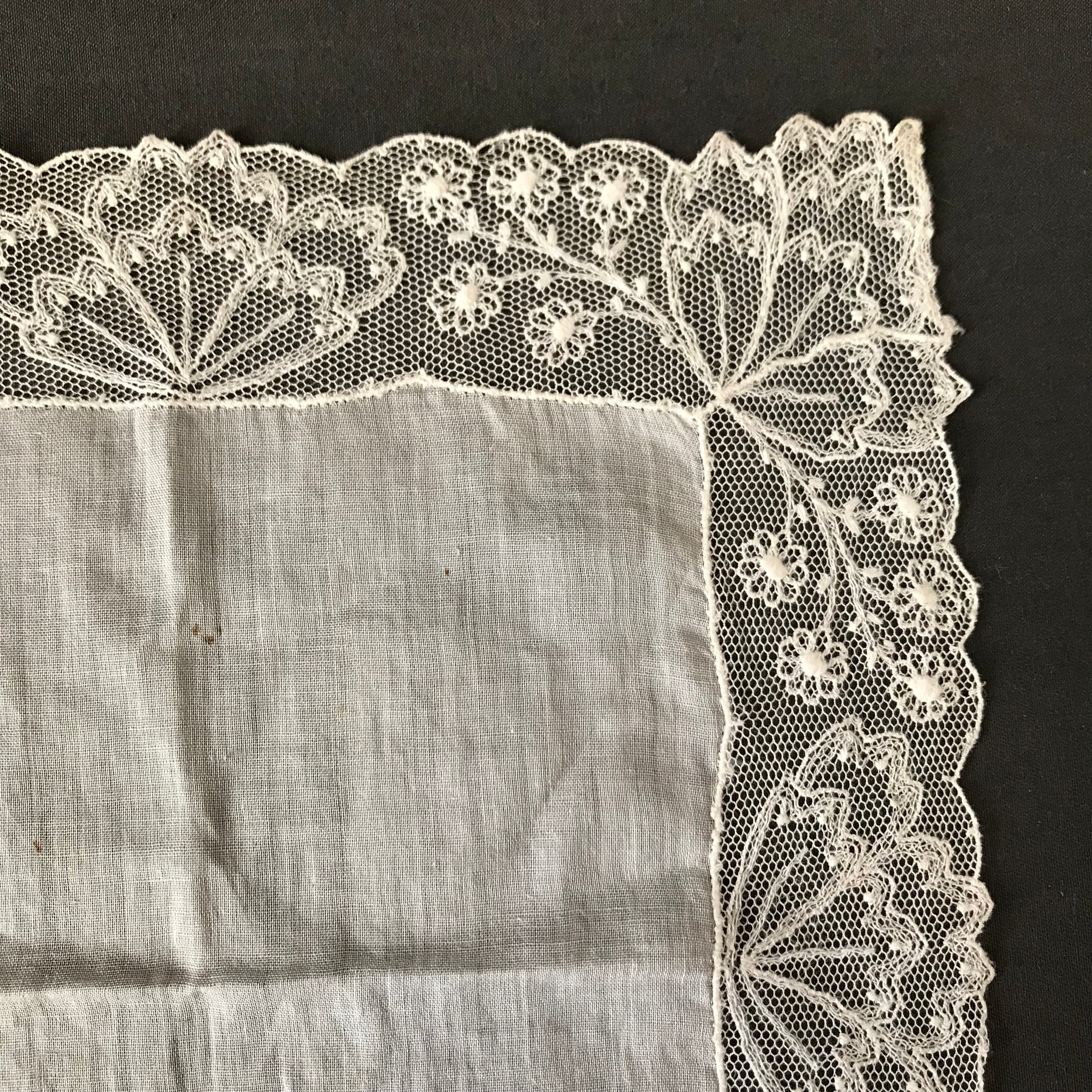 ・縦 22㎝ 横 23㎝ チュールにゼラニウムの刺繍が綺麗なハンキーです。1 ㎜程のシミがあります。その他は良い状態です。フランスビンテージ。