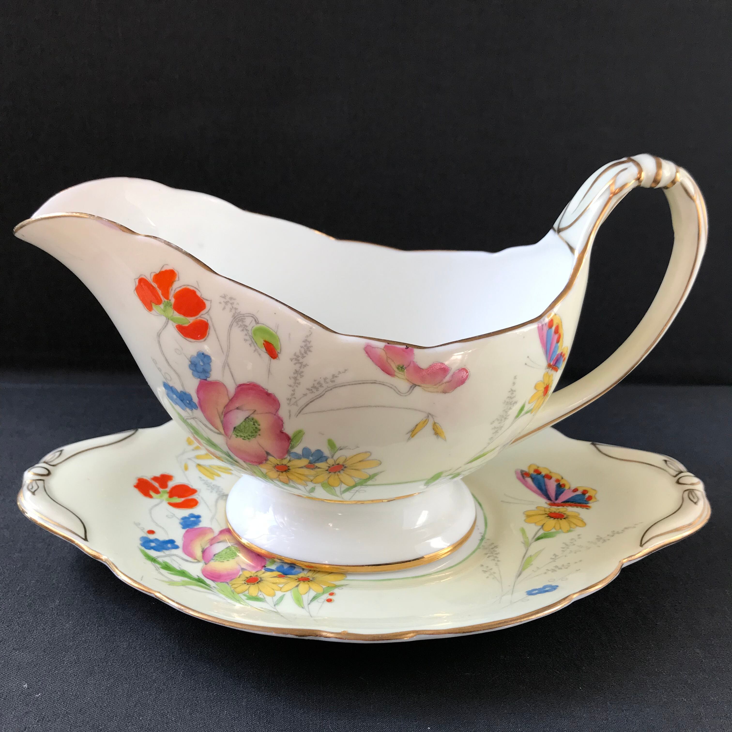ソーシエールですが、ポットとソーサーがわかれています。ひなげしやマーガレットチョウの絵付けがとても綺麗です。イギリスビンテージ。