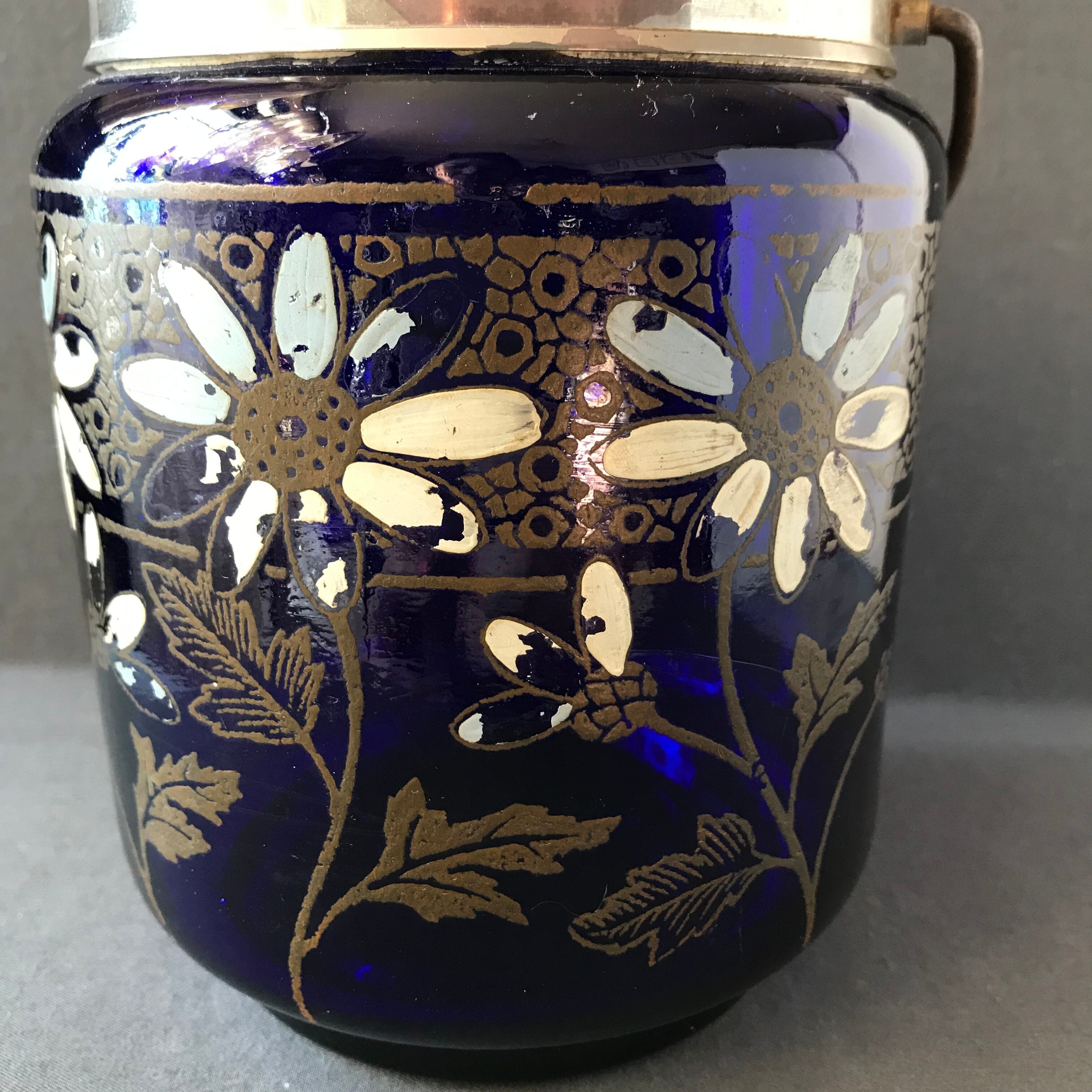 ・直径 12.5 ㎝ 高さ 18㎝ ロイヤルブルーのガラスにエナメルでマーガレットが描かれたクッキージャーです。エナメルの剥がれがあります。ガラスにヒビカケはございません。フランスアンティーク。