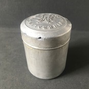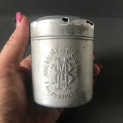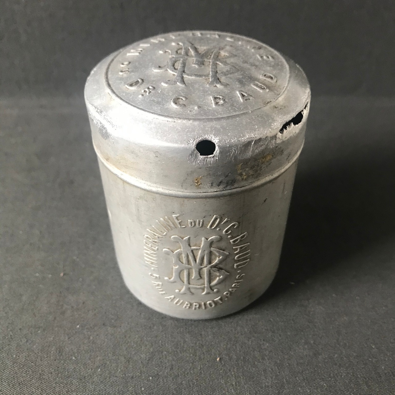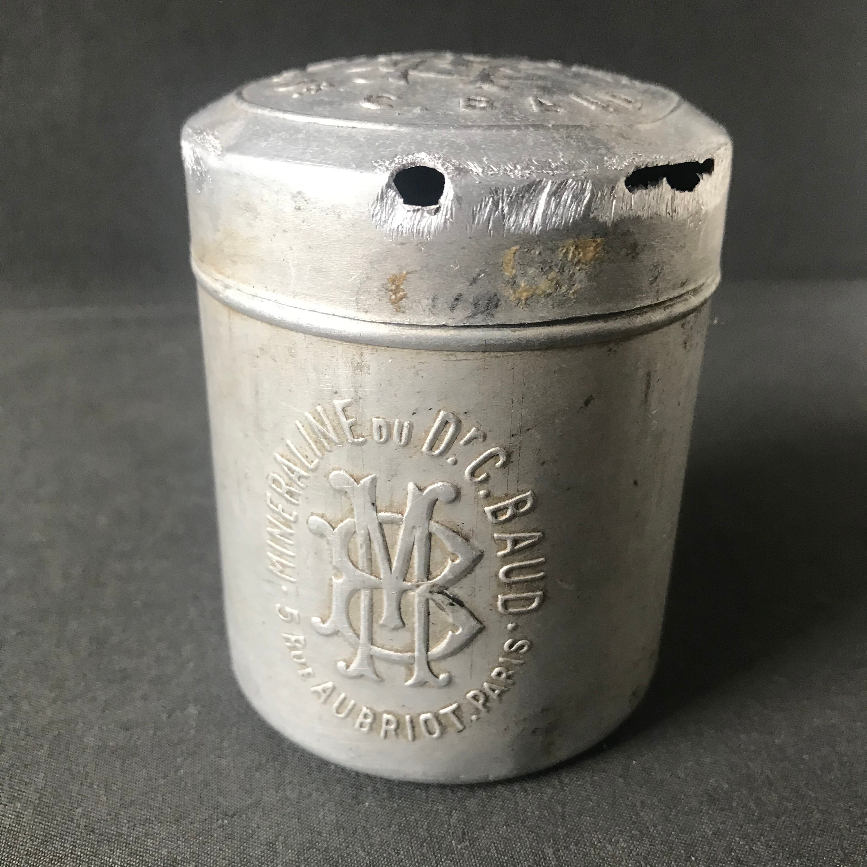 ・直径 6.5㎝ 高さ8㎝ アルミ製のMBのロゴが入ったパウダーBOXです。蓋に3カ所穴があいています。その他は良い状態です。フランスアンティーク。