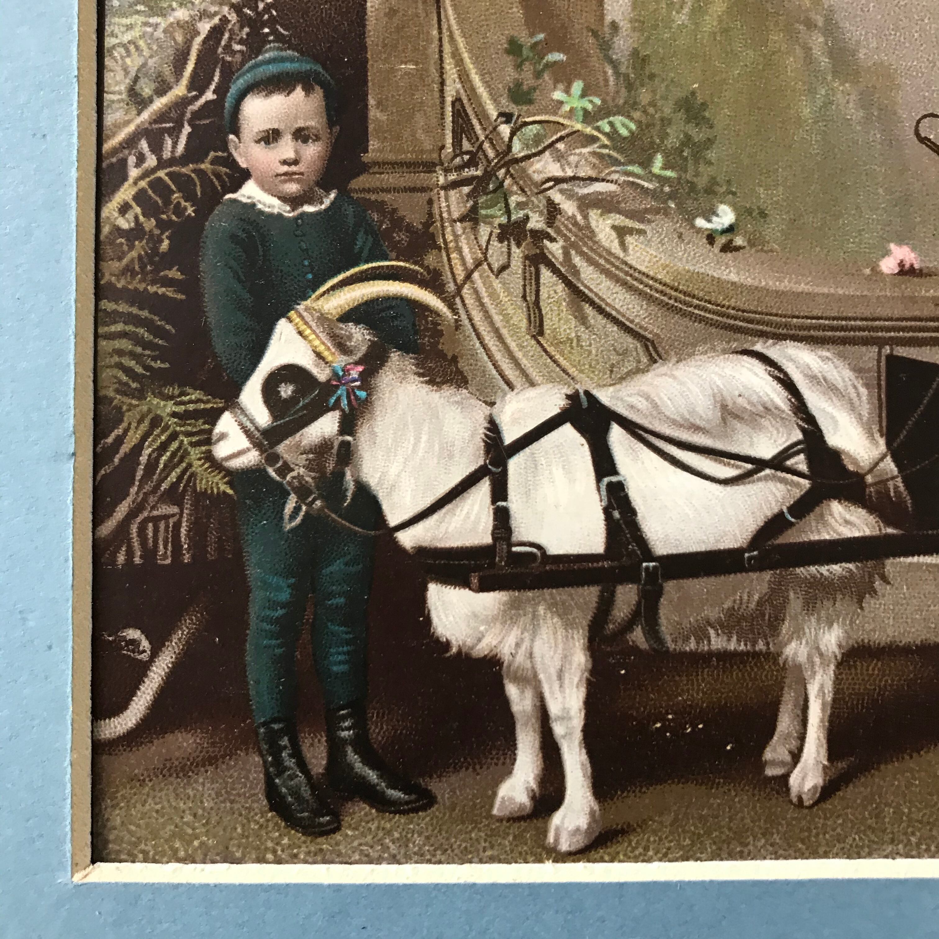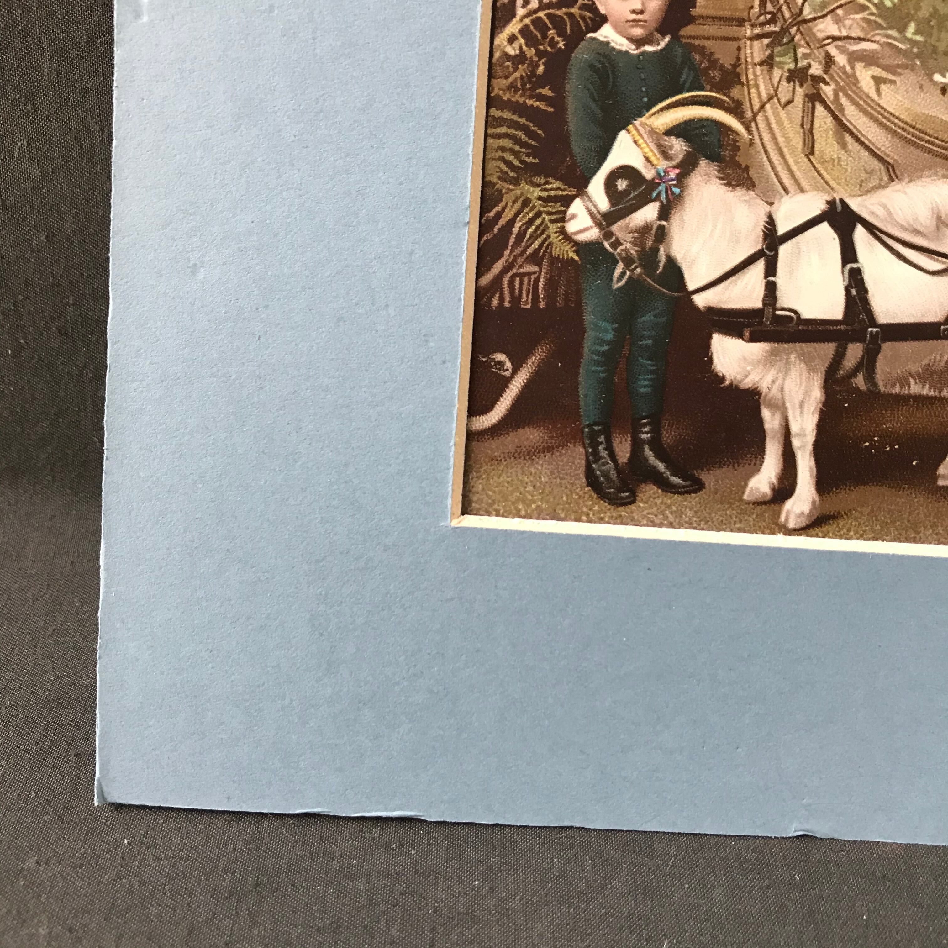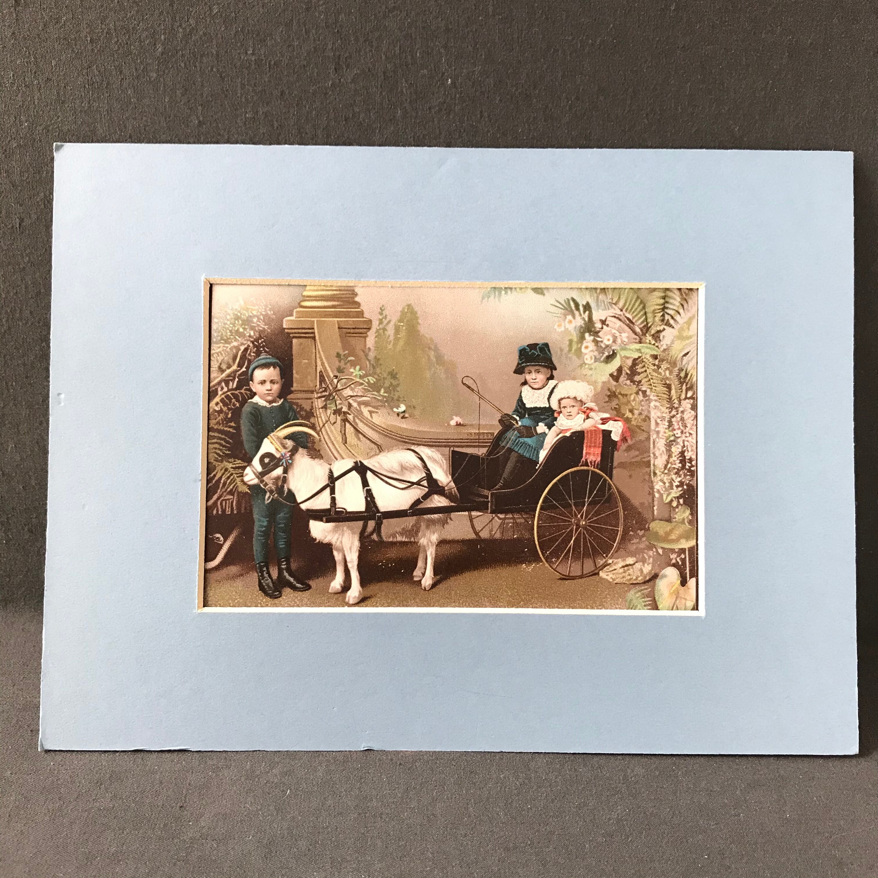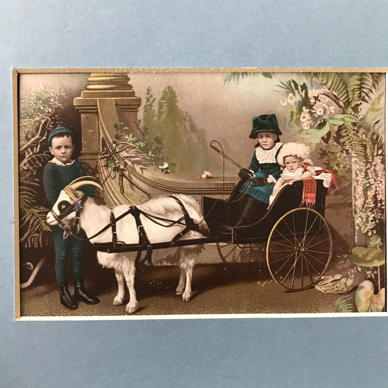 ・縦 18㎝ 横 24㎝ 山羊の馬車に乗った少女と少年のオフセット印刷に手彩色の絵とブルーグレーのマットです。フランスアンティーク。