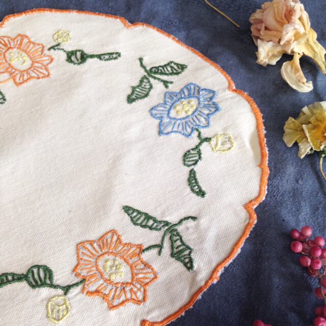 ・ハンド刺繍のお花が可愛いドイリーです。フランスアンティーク