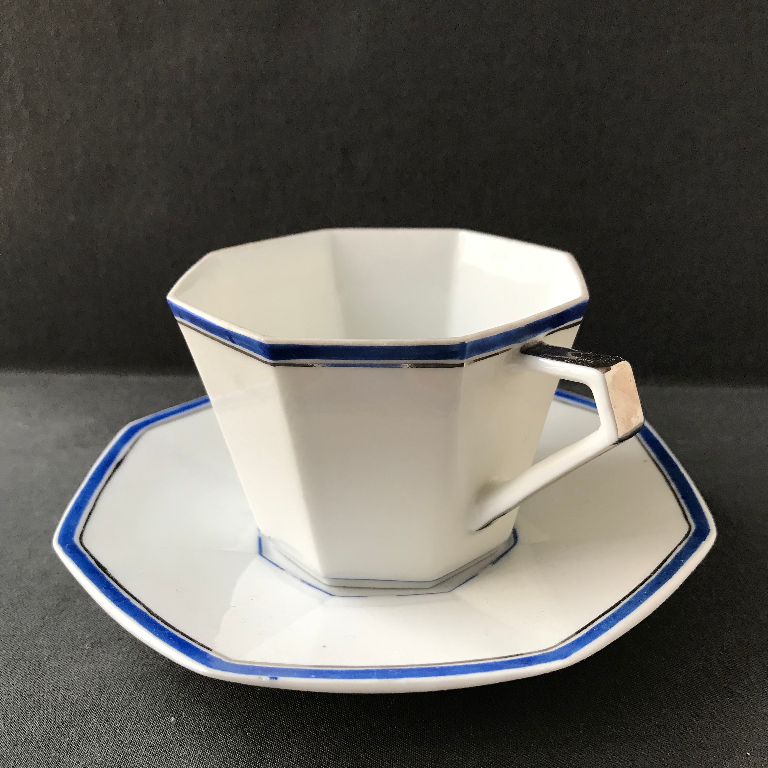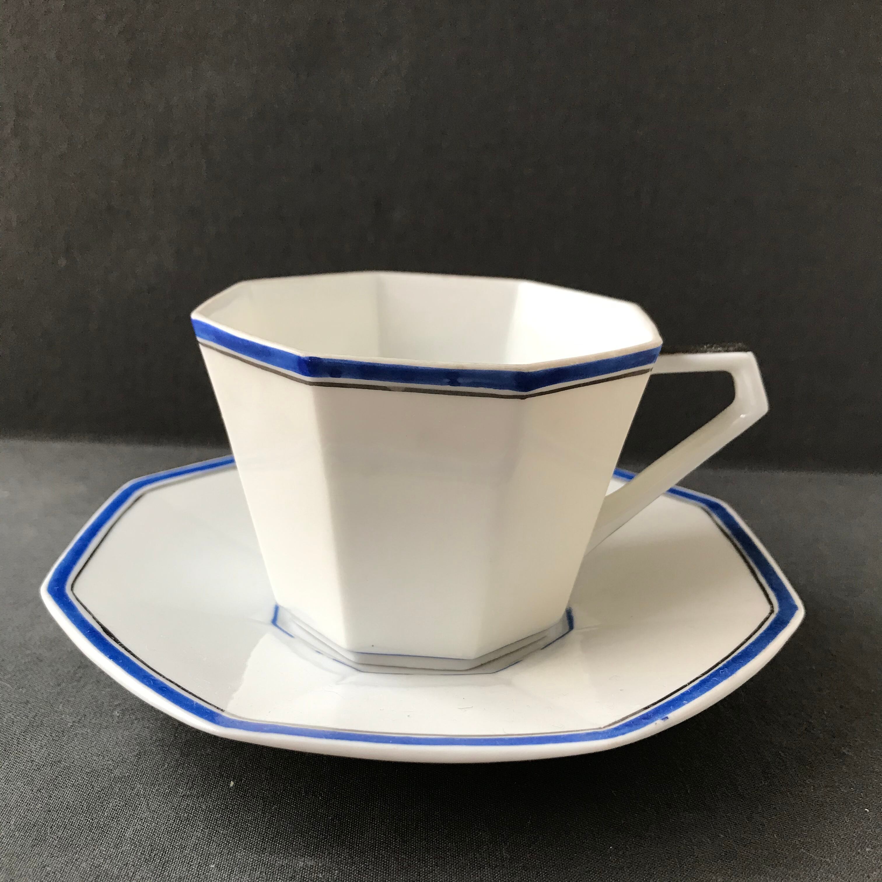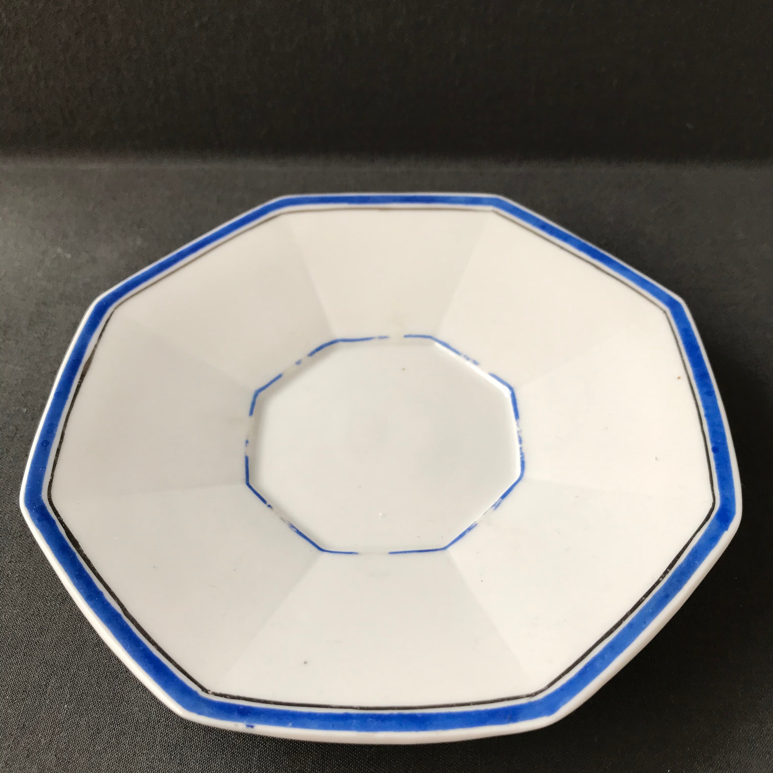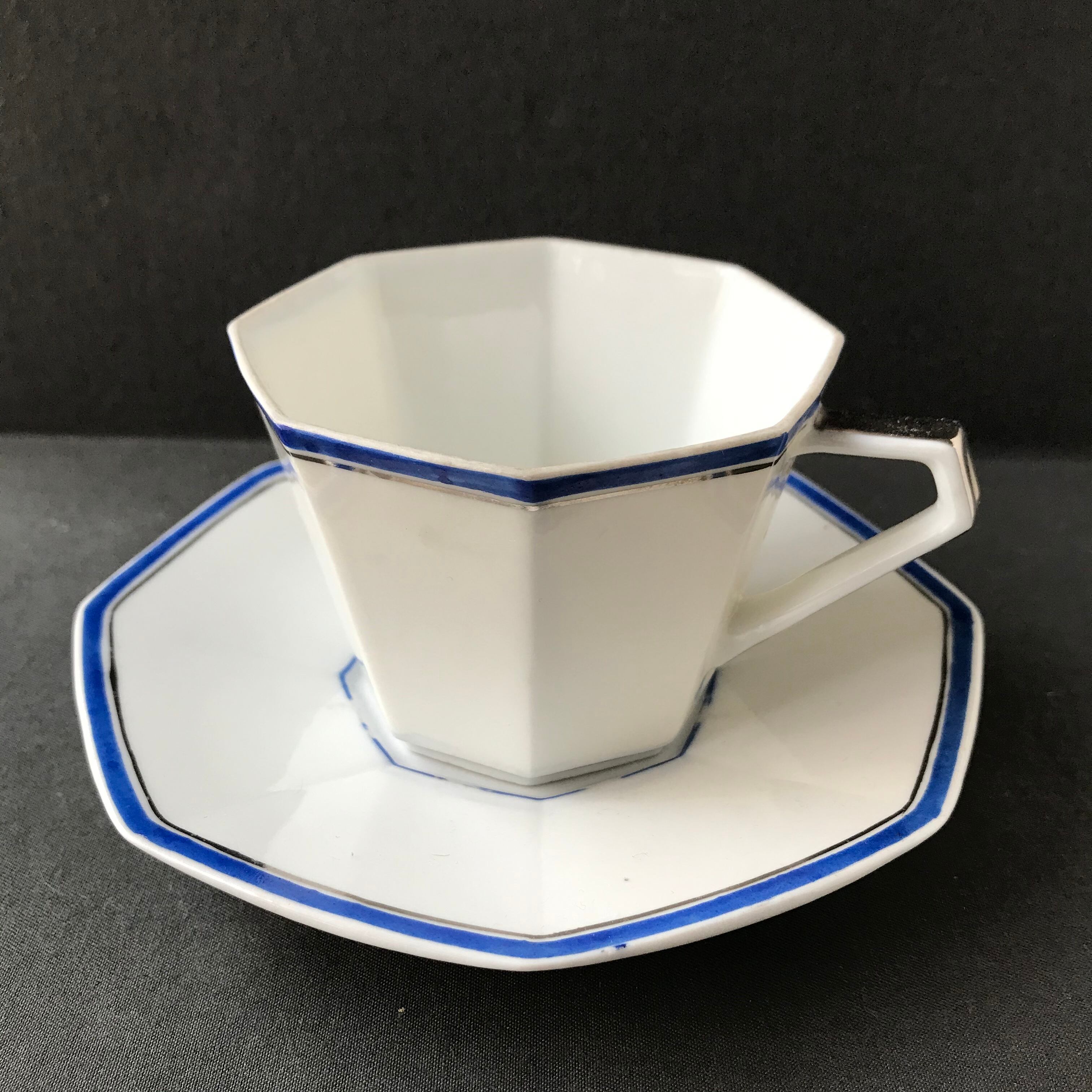ポーセリン ブルーのラインが特徴のオクトゴナルのカップ&ソーサーです。ソーサーの中央部分のブルーラインにスレはありますが、ヒビカケは無く良い状態です。フランスアンティーク。