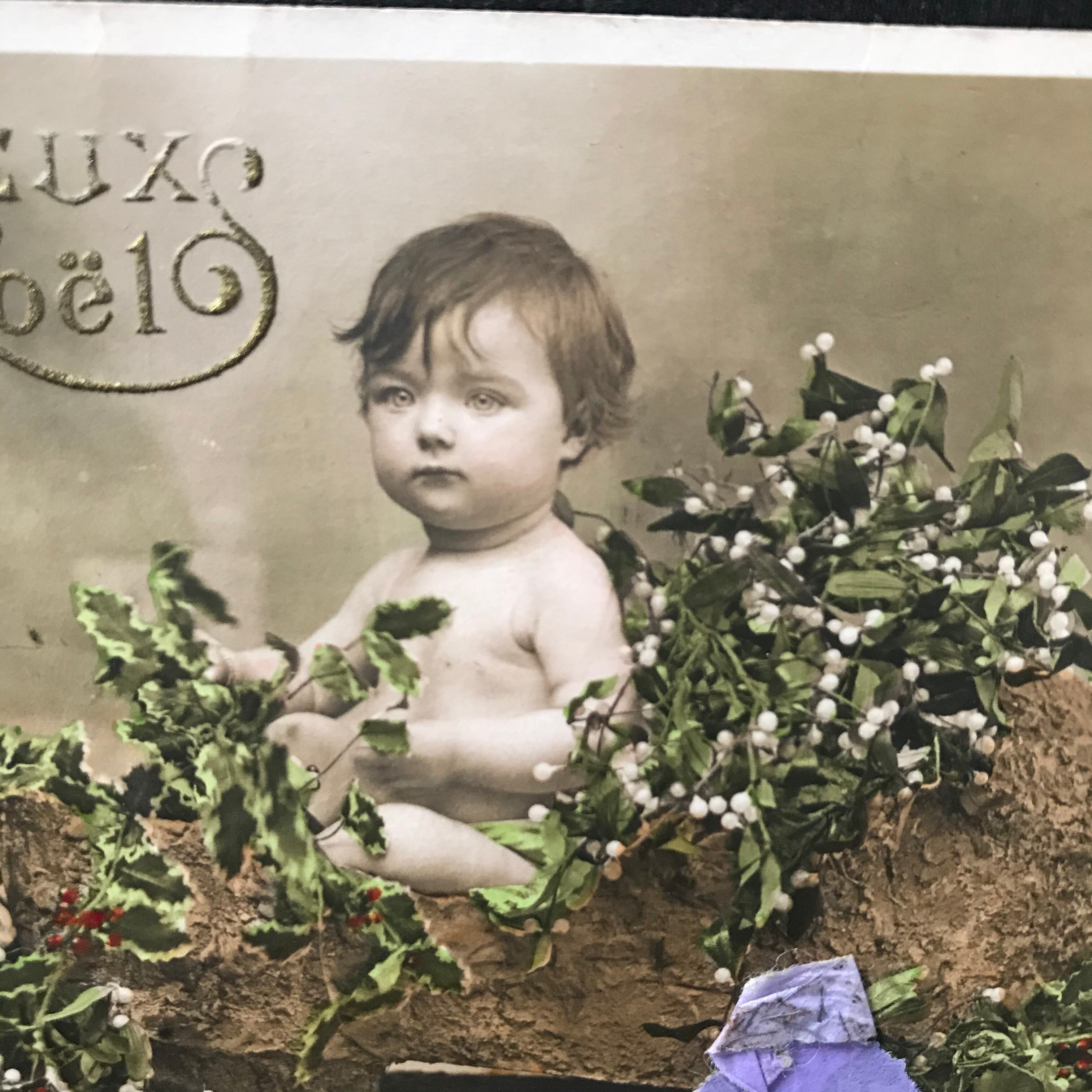 ・縦 9㎝ 横 14㎝ ヤドリギとヒイラギにべべちゃんが可愛いらしいポストカードです。フランスビンテージ。