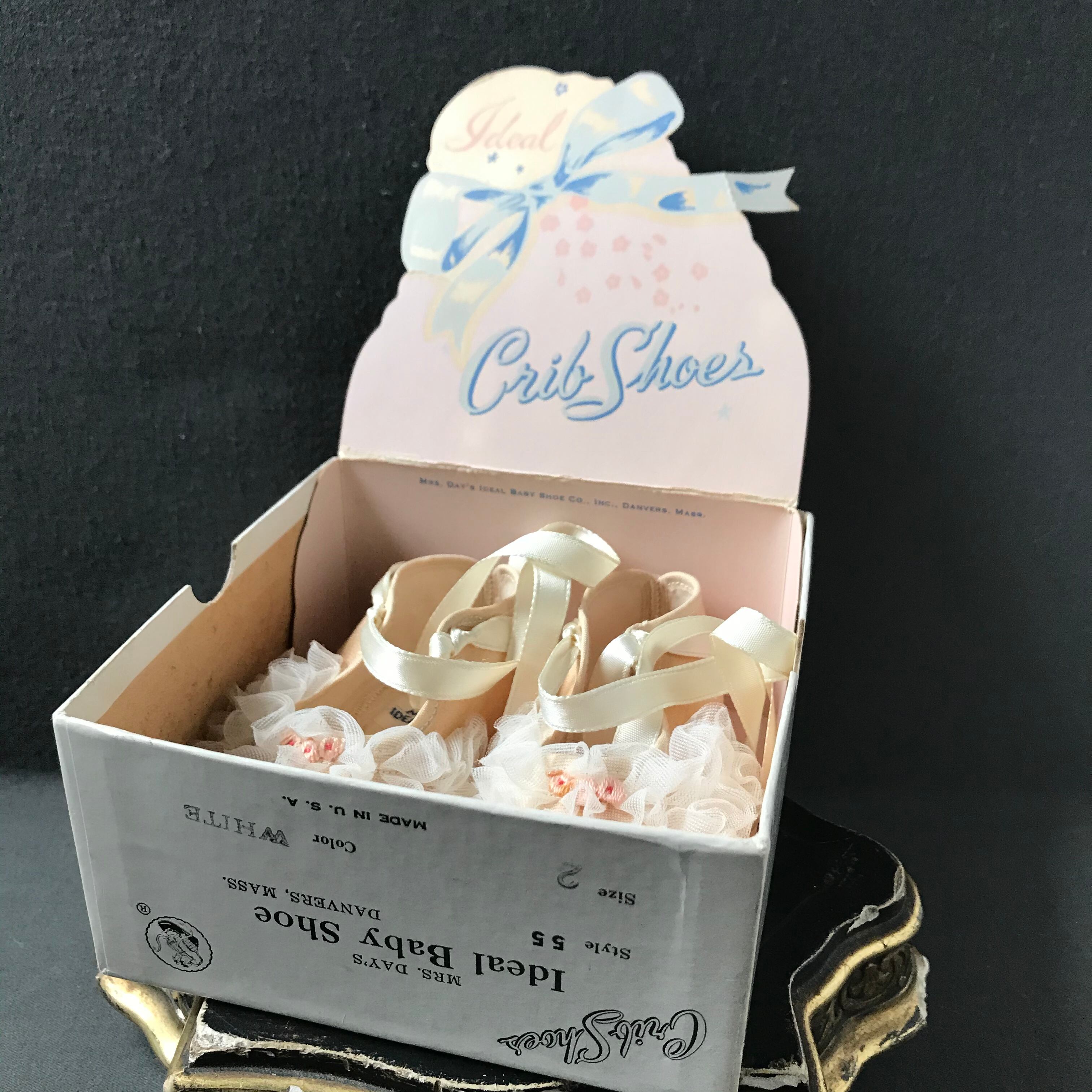 ・縦 11㎝ 横 4.5㎝ 箱入りのバラのロココ刺繍とチュールリボンが可愛いらしいベビーシューズです、アメリカビンテージ。