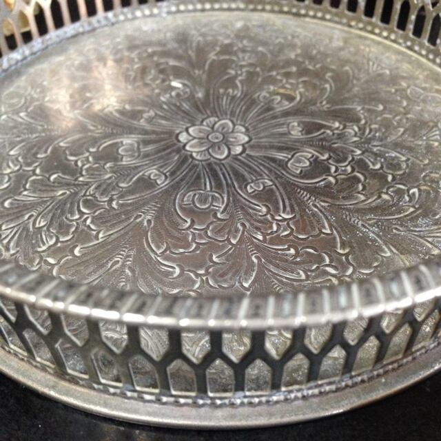 ・直径13㎝ 高さ3㎝ 周りの透かしと中央のエキゾチックな彫りが綺麗なシルバープレートのトレイです。フランスアンティーク。商品合計10000円以上で宅配送料無料です。