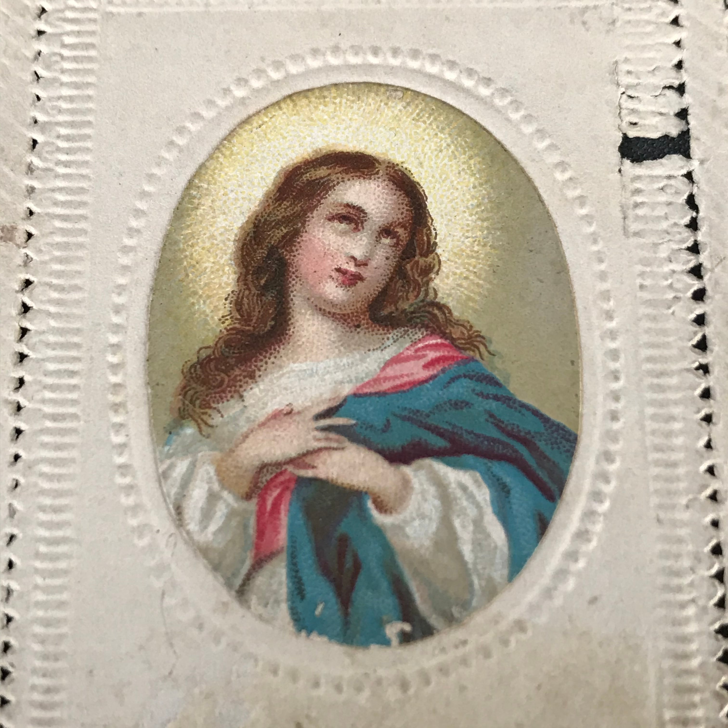 ・ 縦 9.5㎝ 横 6.3㎝ プルーとピンクのローブのマリア様が中央に、レースが繊細なカニヴェです。レース細工の欠落は写真を参考になさってください。フランスアンティーク。