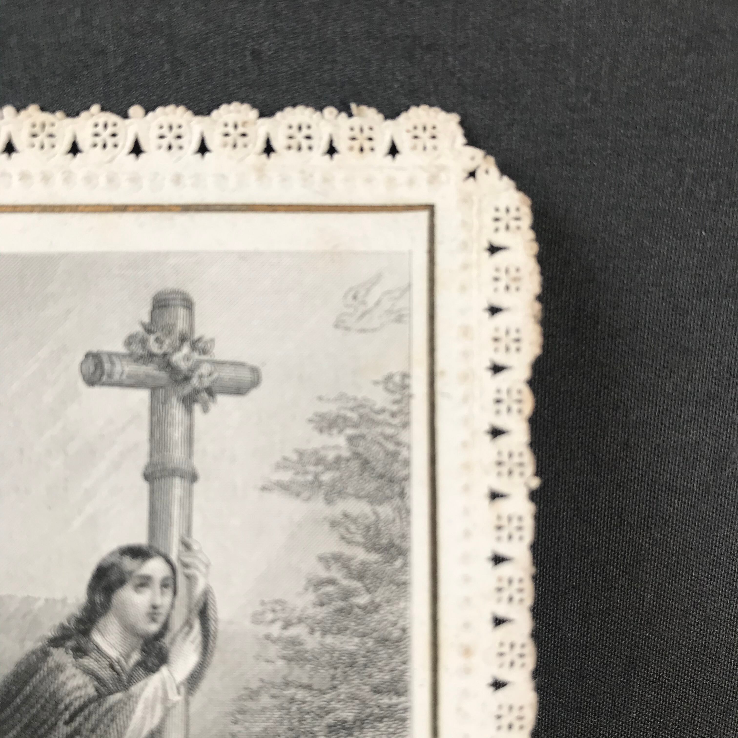・ 縦 11㎝ 横 7.5㎝ クロスを掲げたマリア様が特徴てきなレースカニヴェです。レースの欠落は写真を参考になさってください。フランスアンティーク。
