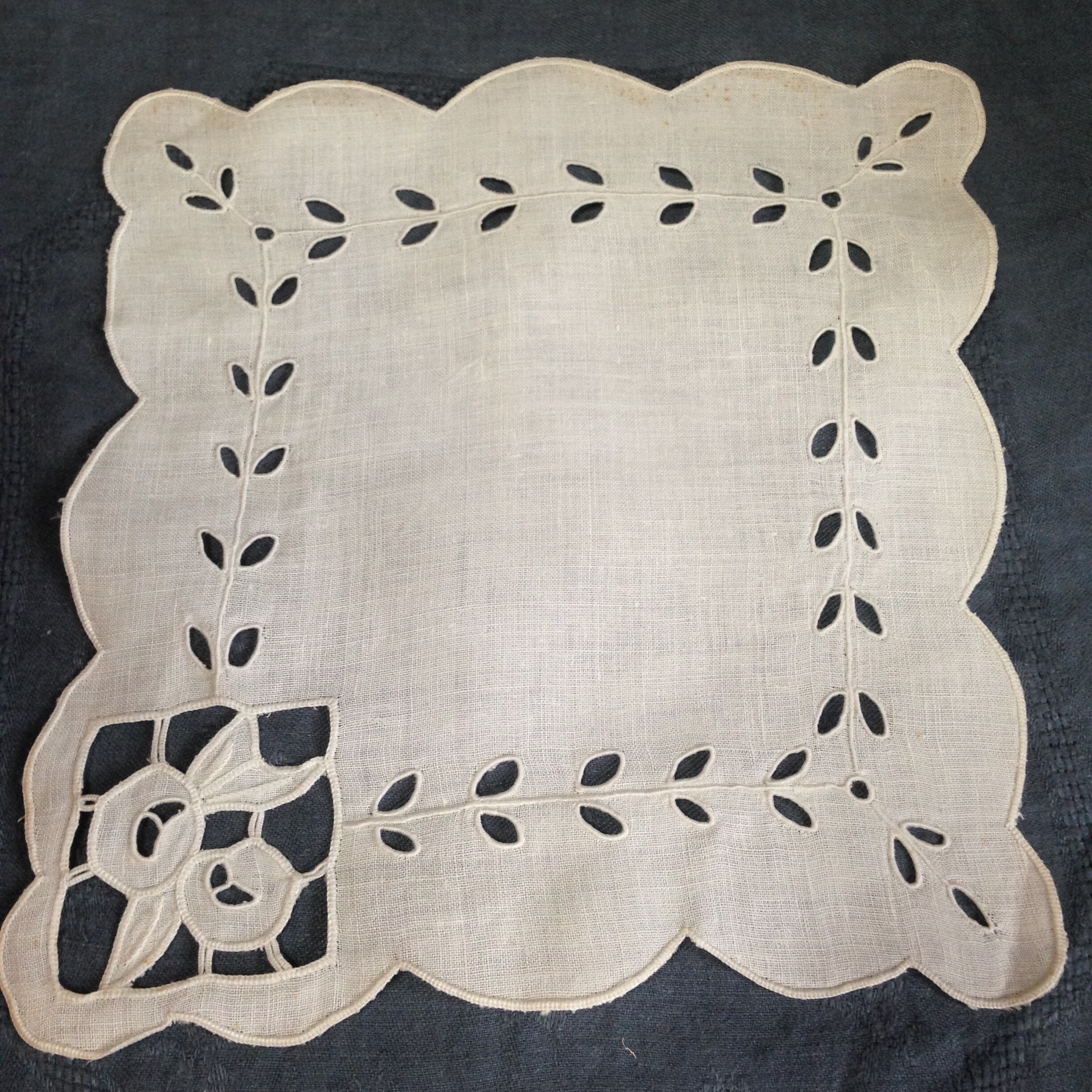・縦25㎝ 横25㎝ カメリアの花と葉が表現されている カットワークのレースです。フランスアンティーク。送料140円。