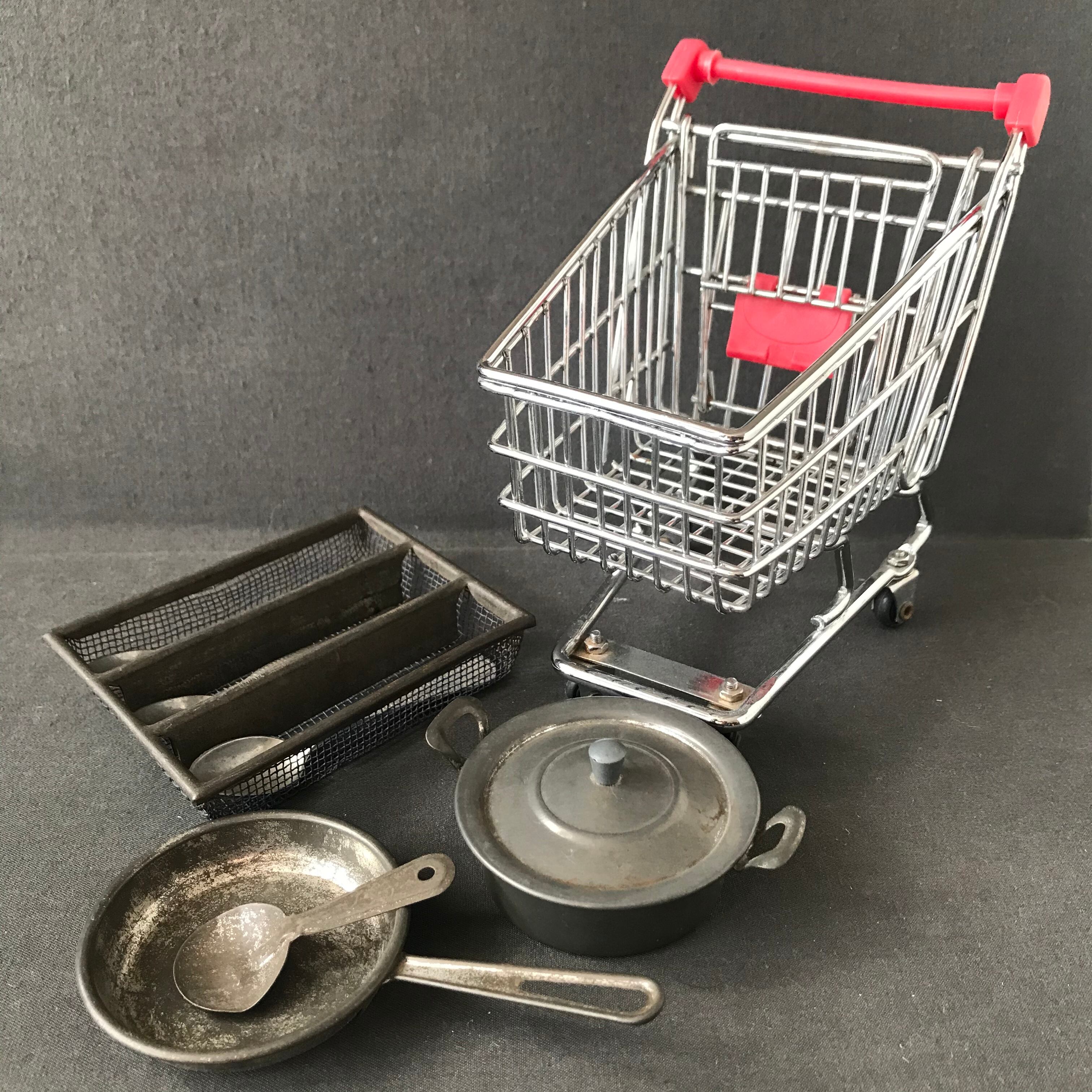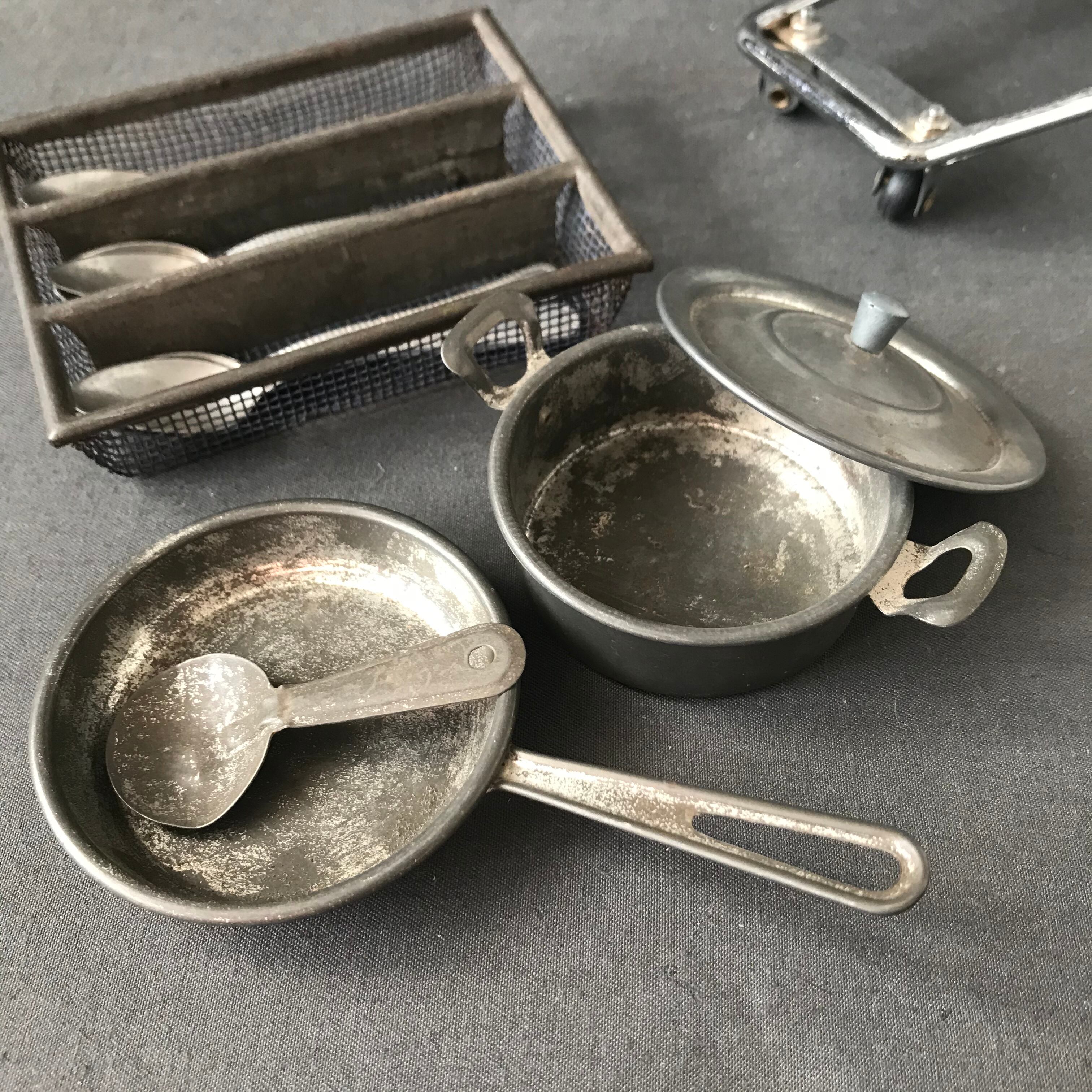 ショッピングカートはコロコロが動きます。ベビーちゃんを載せる所が開閉します。アルミのお鍋とフライパン、スプーンが6本ケースに入っています。フランスビンテージ。