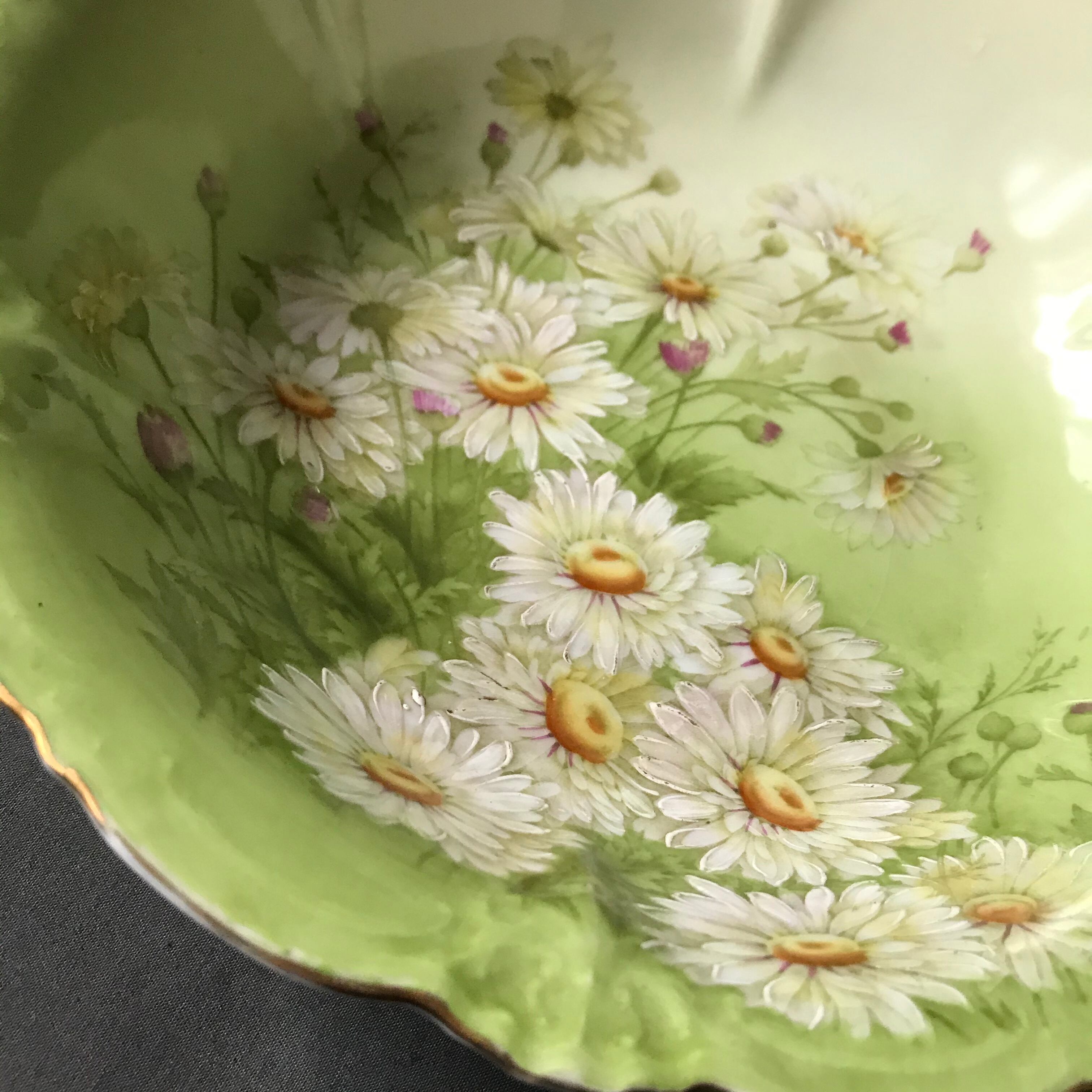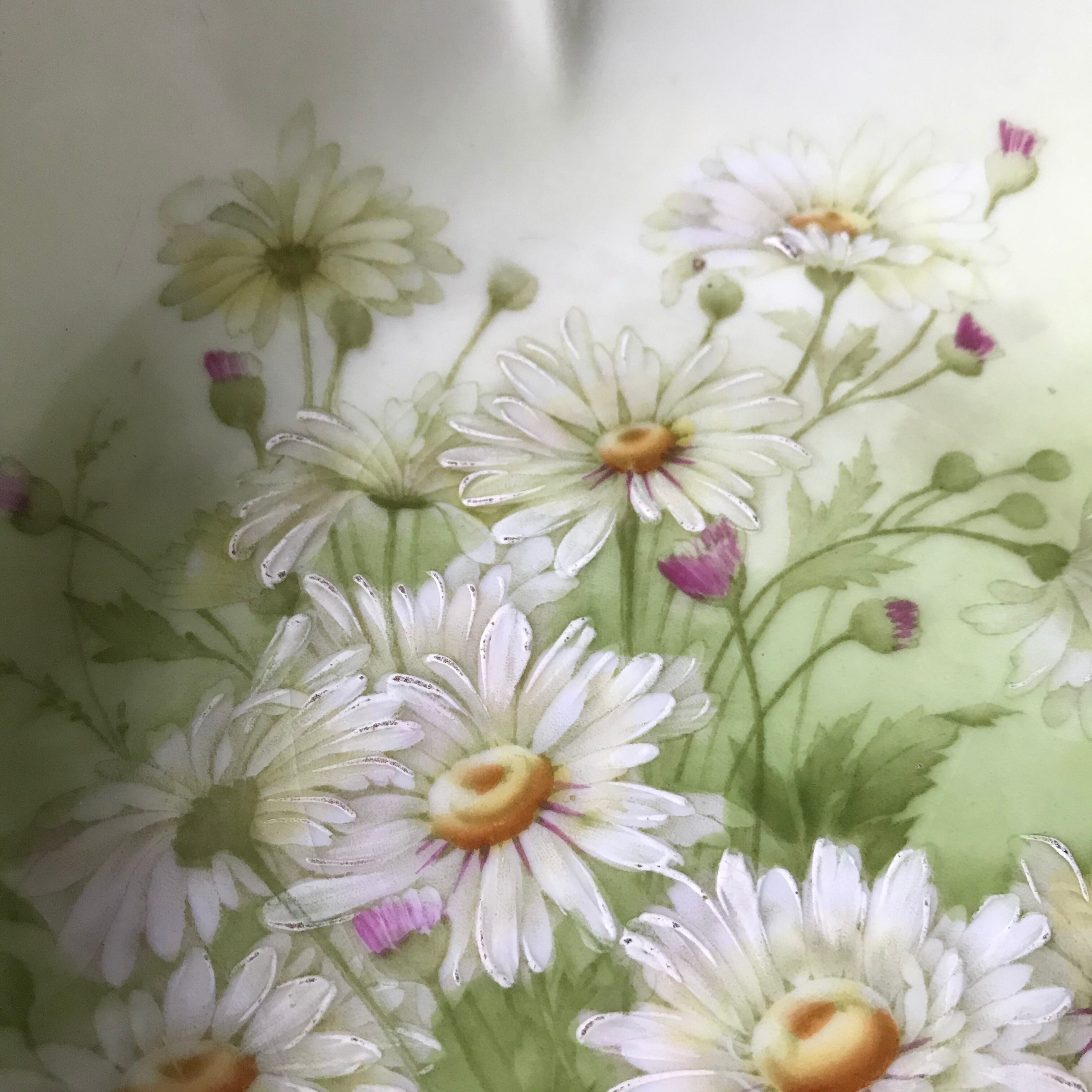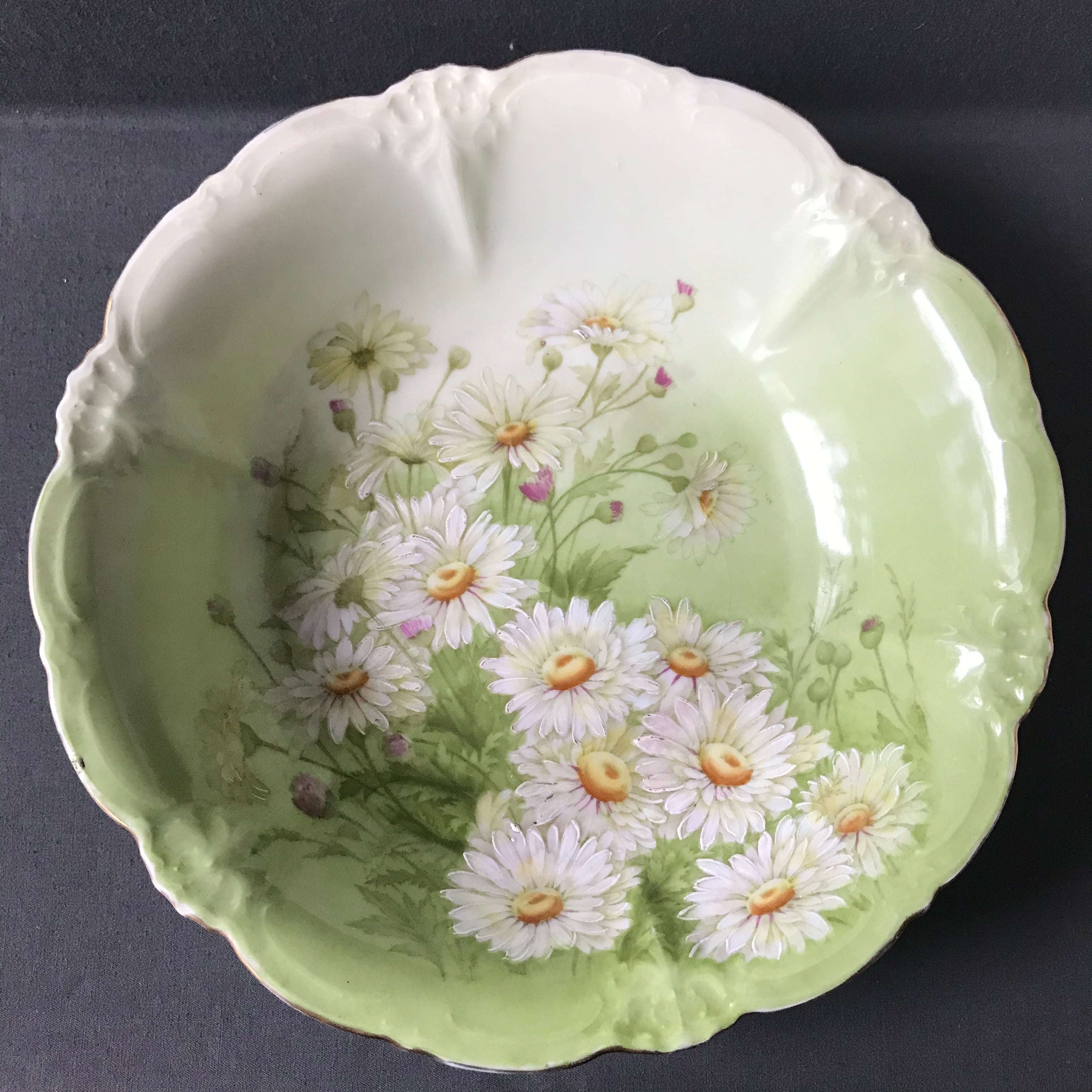 ・直径 23.8㎝ 高さ 5.5㎝ マーガレットのハンドペイントとレリーフが素晴らしいボウルです。表の縁部分に小さな焼きムラと裏にあたり傷があります。裏の傷は表には響いていません。ドイツアンティーク。