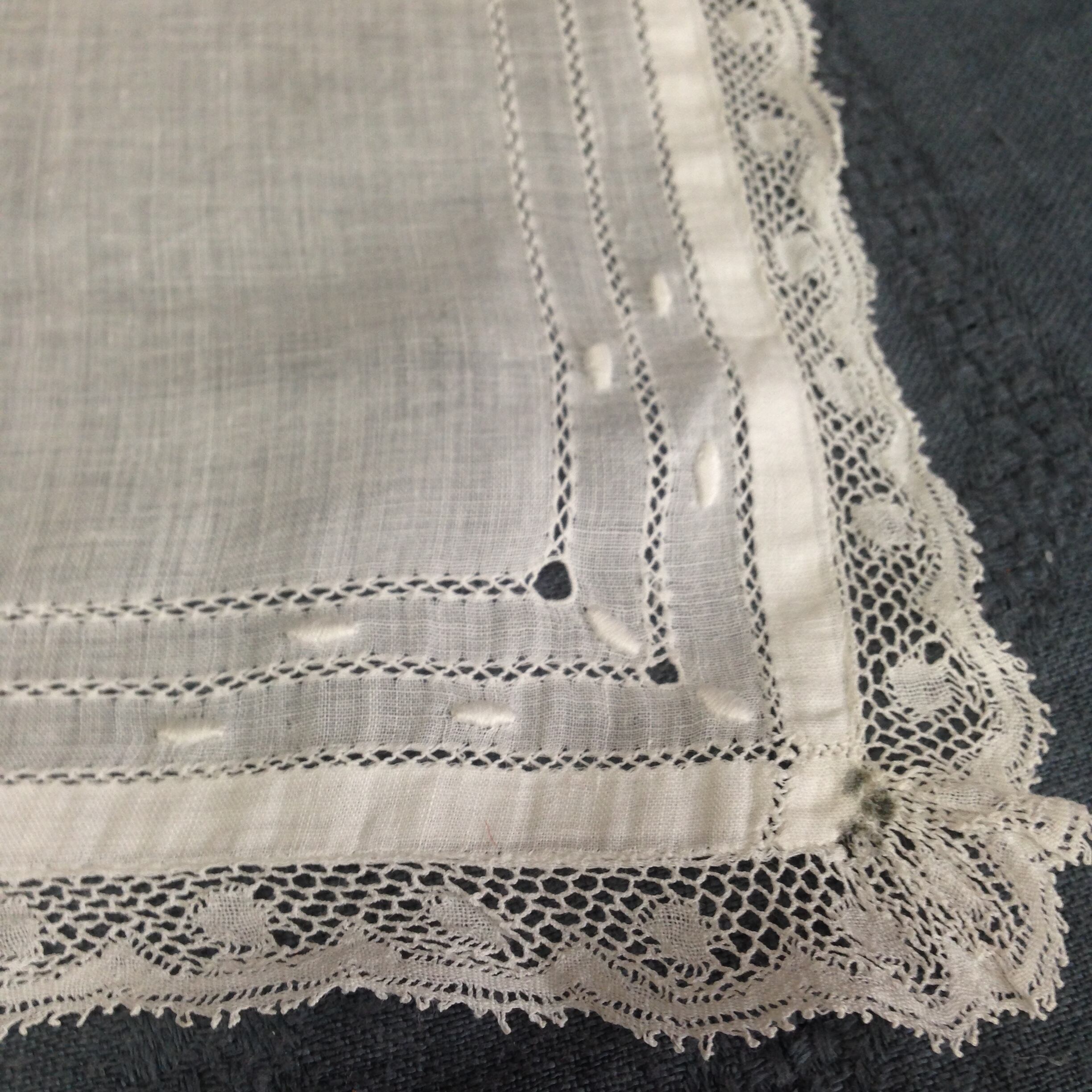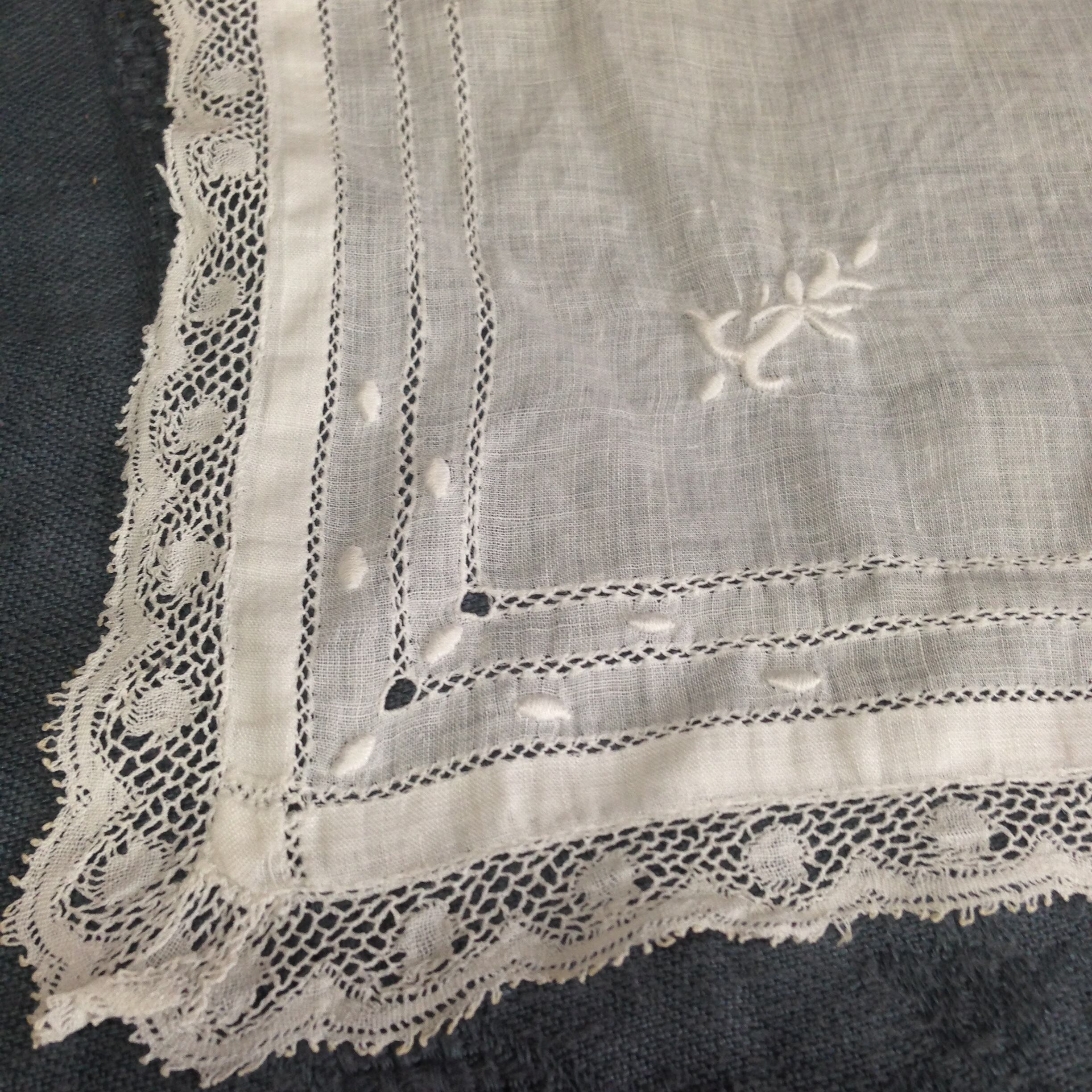 ・縦26㎝ 横26㎝ 周りのフィレレースと花の刺繍、ワンポイントの百合の紋章の刺繍がハンドワークされた大変繊細なハンカチーフです。きっと高貴な方の持ち物だったことでしょう。フランスアンティーク。送料140円。