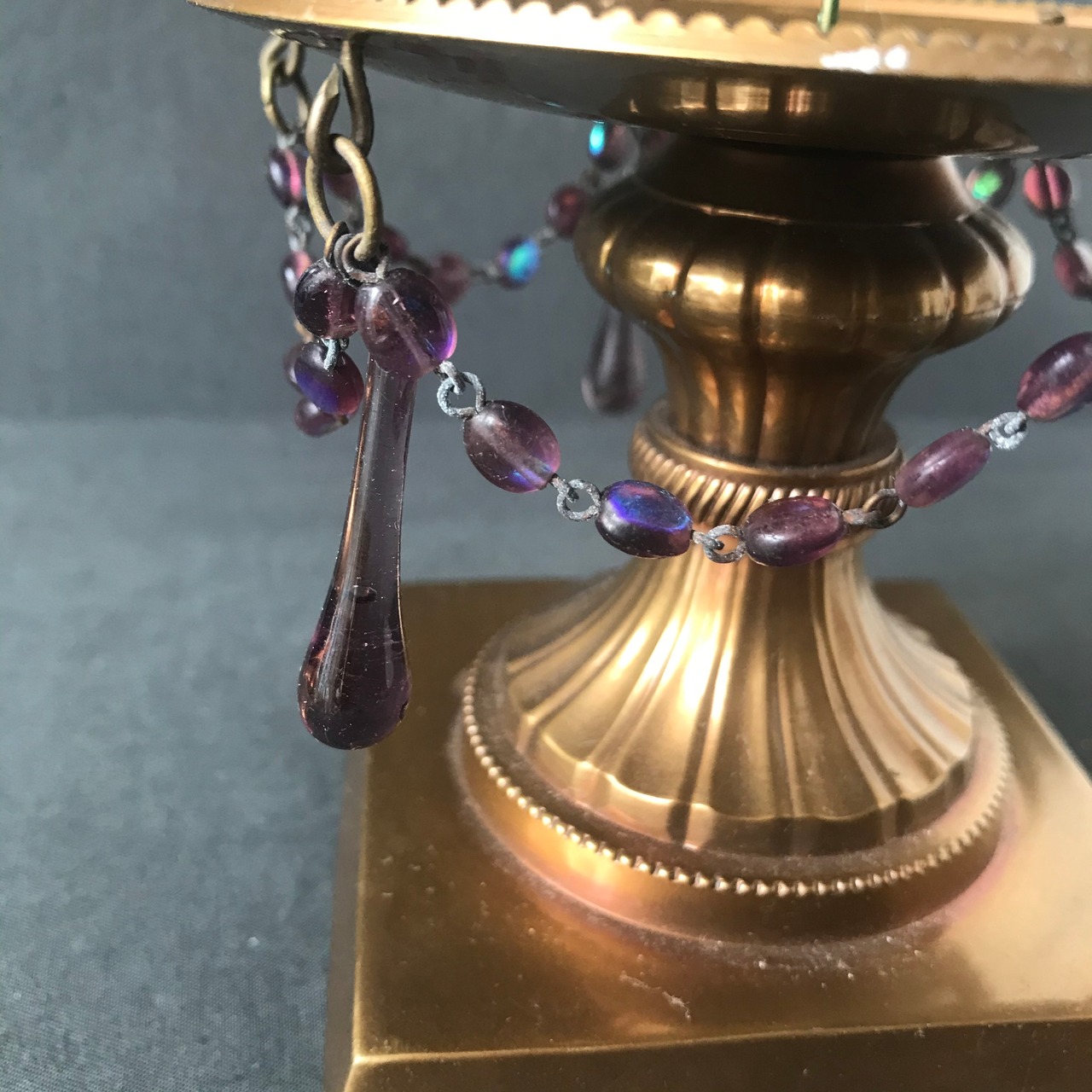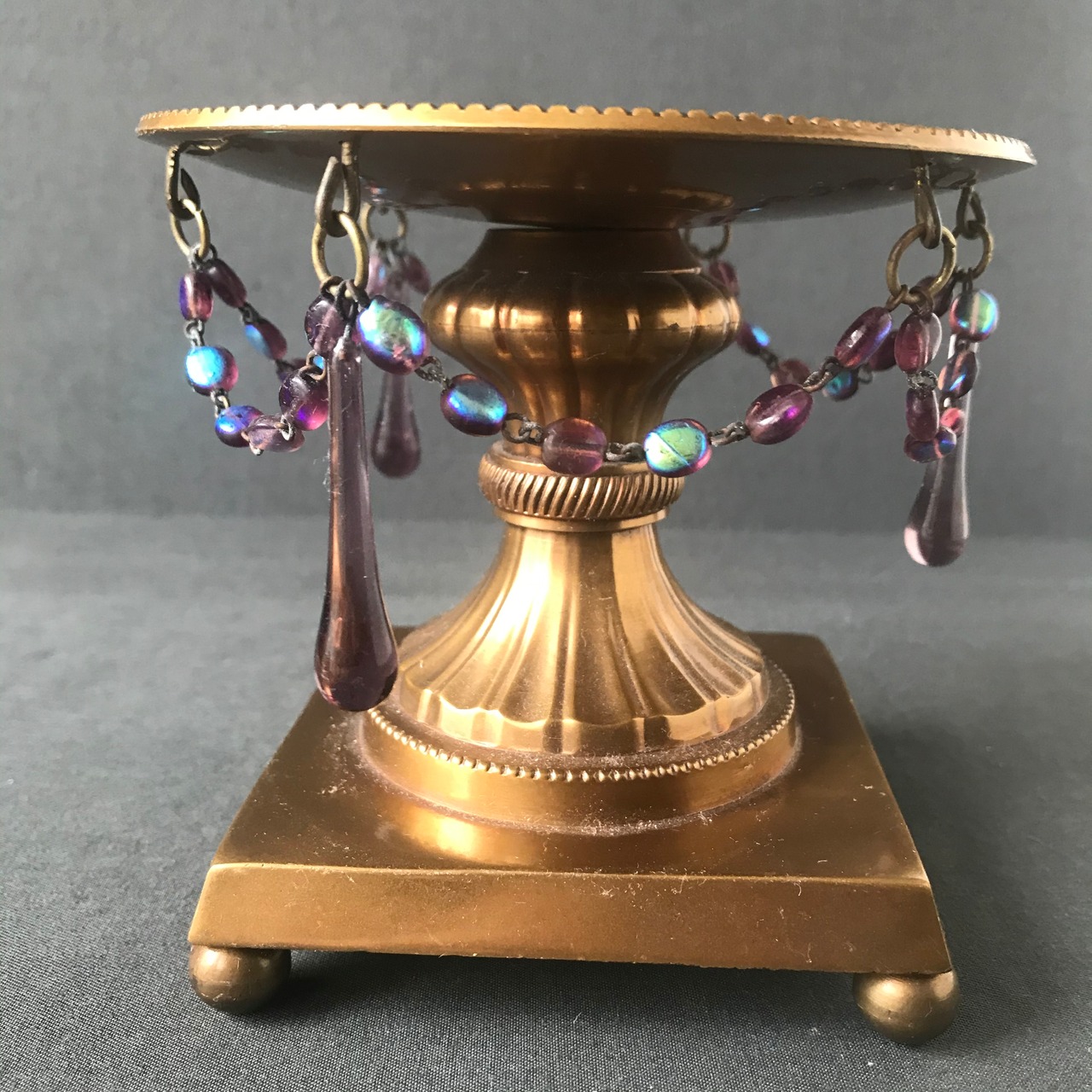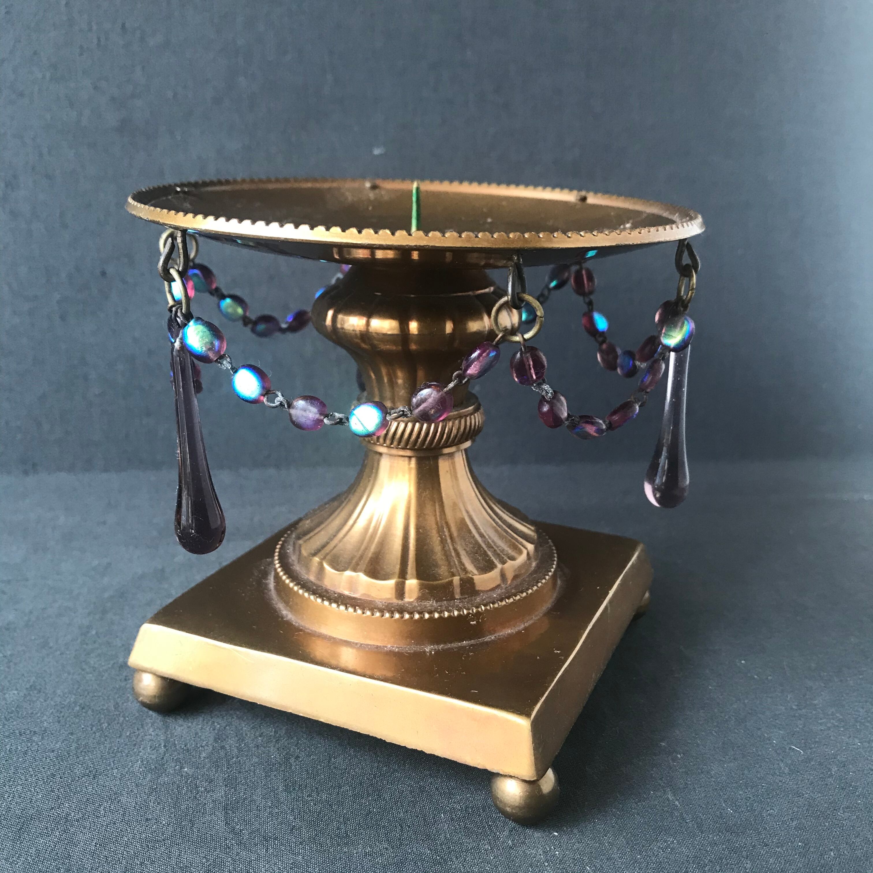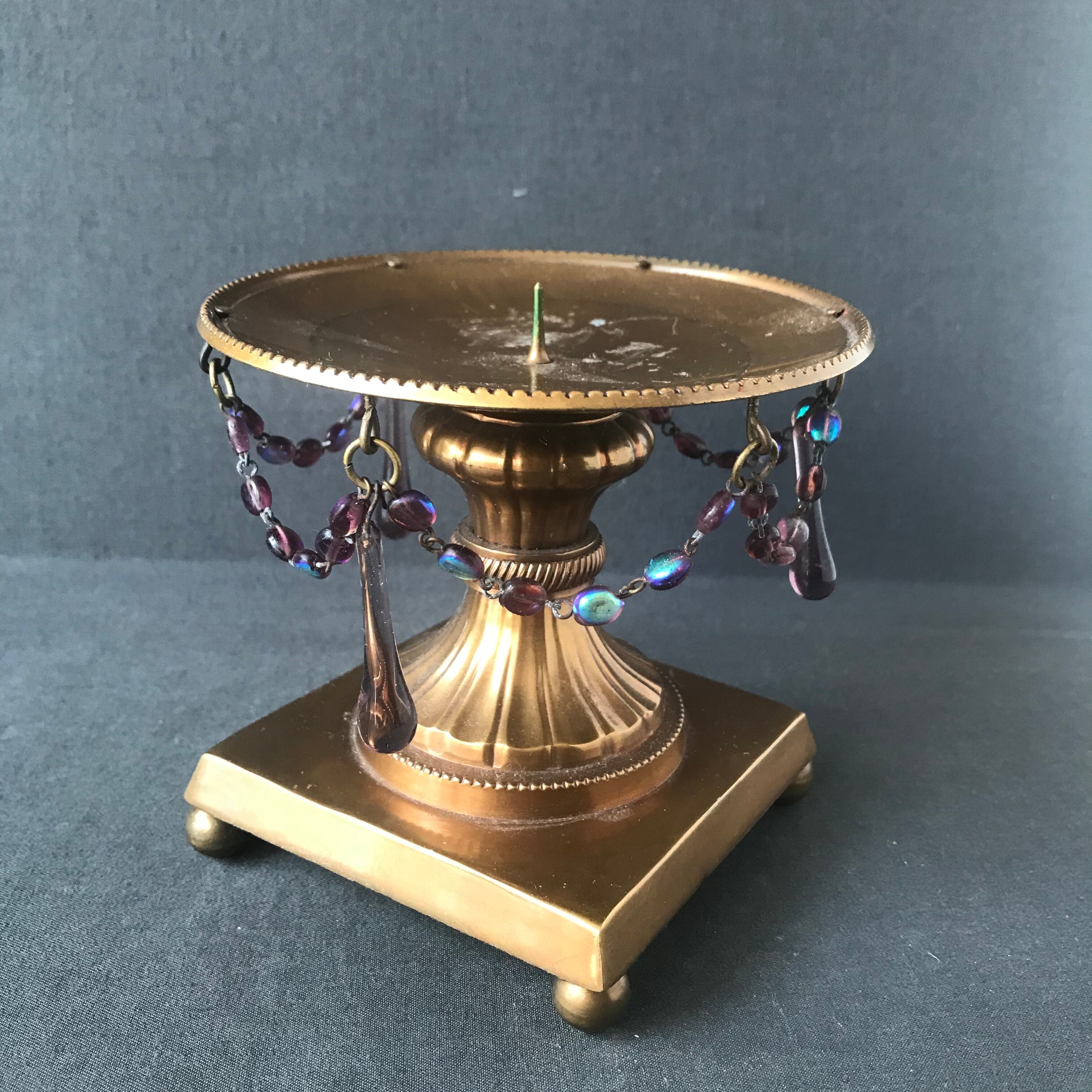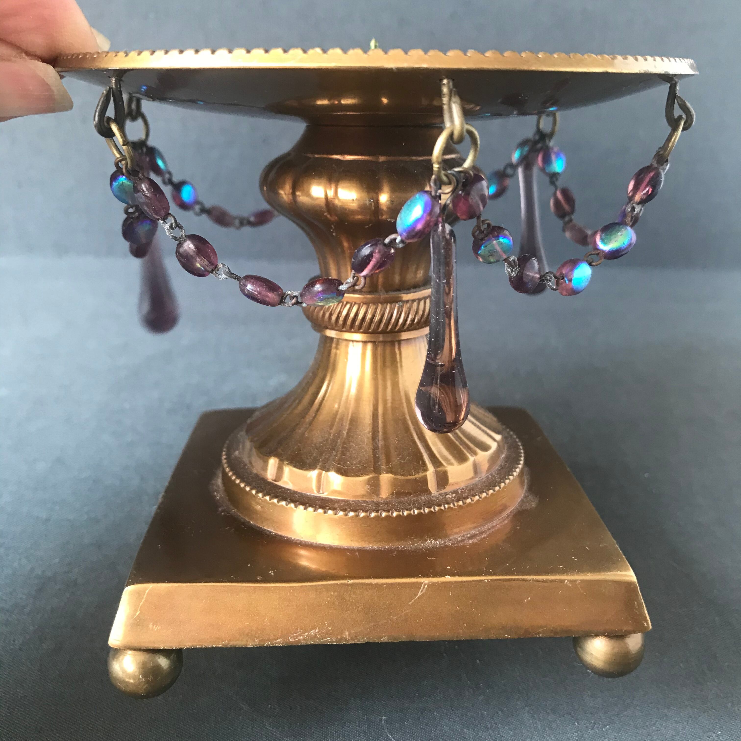 ・直径 11.3㎝ 高さ 10.3㎝ 珍しいスミレ色ガラスの雫型ガラストスミレ色のオーバルガラスの装飾が素晴らしいブラス製のキャンドルスタンドです。フランスアンティーク。