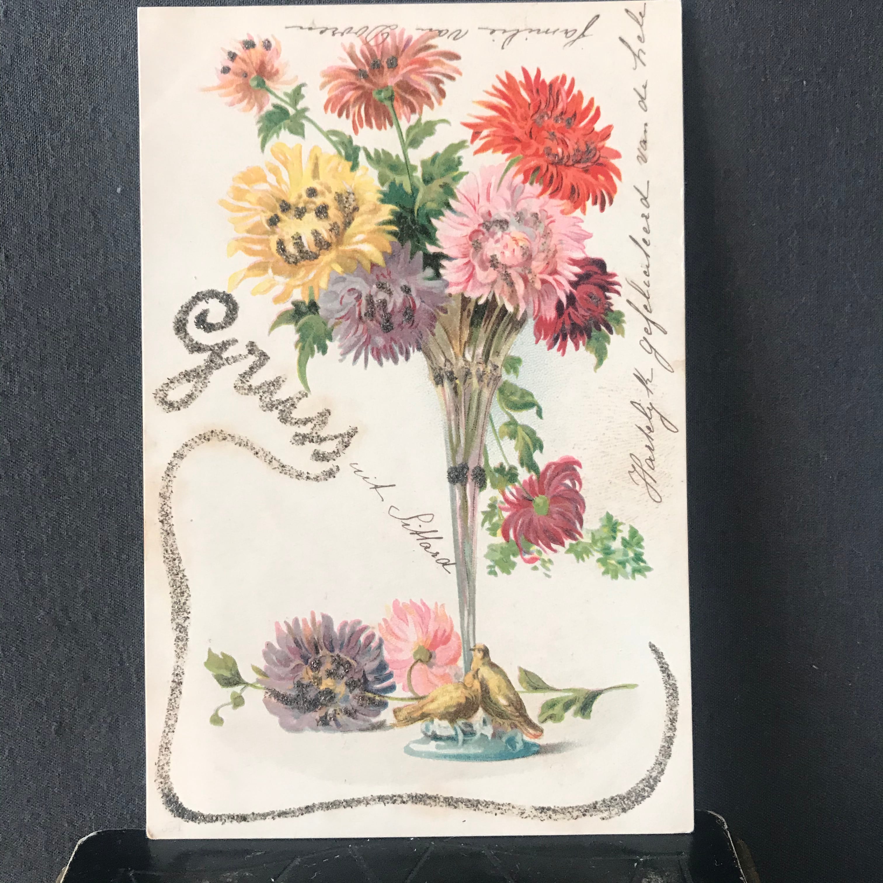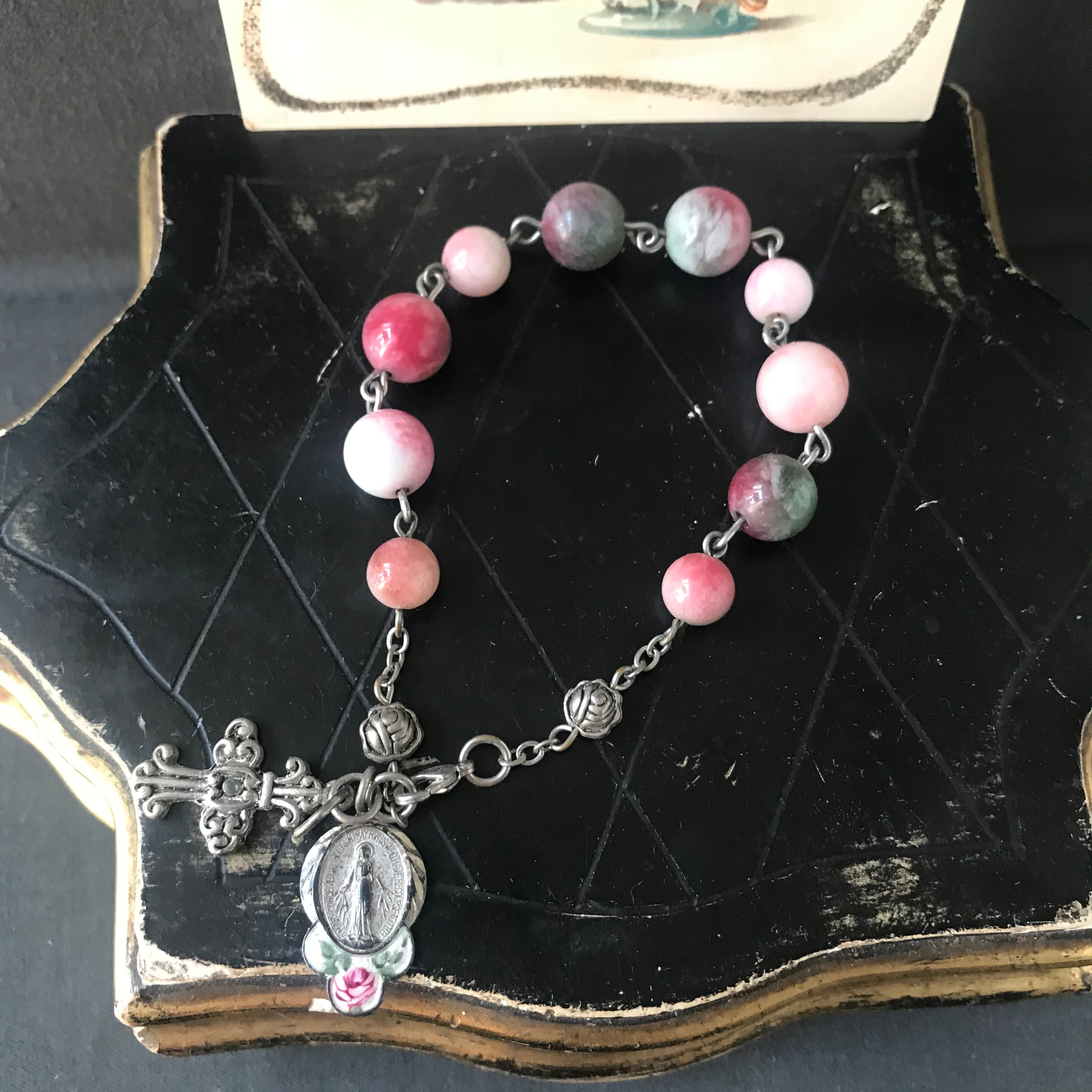 ・ブレス 長さ 24㎝ 珍しいエナメルのバラのメダイユとクロスが付いたピンクマーブルガラスのブレスロザリオです。ヒビカケ無く良い状態です。ポストカードも付いています。フランスアンティーク。