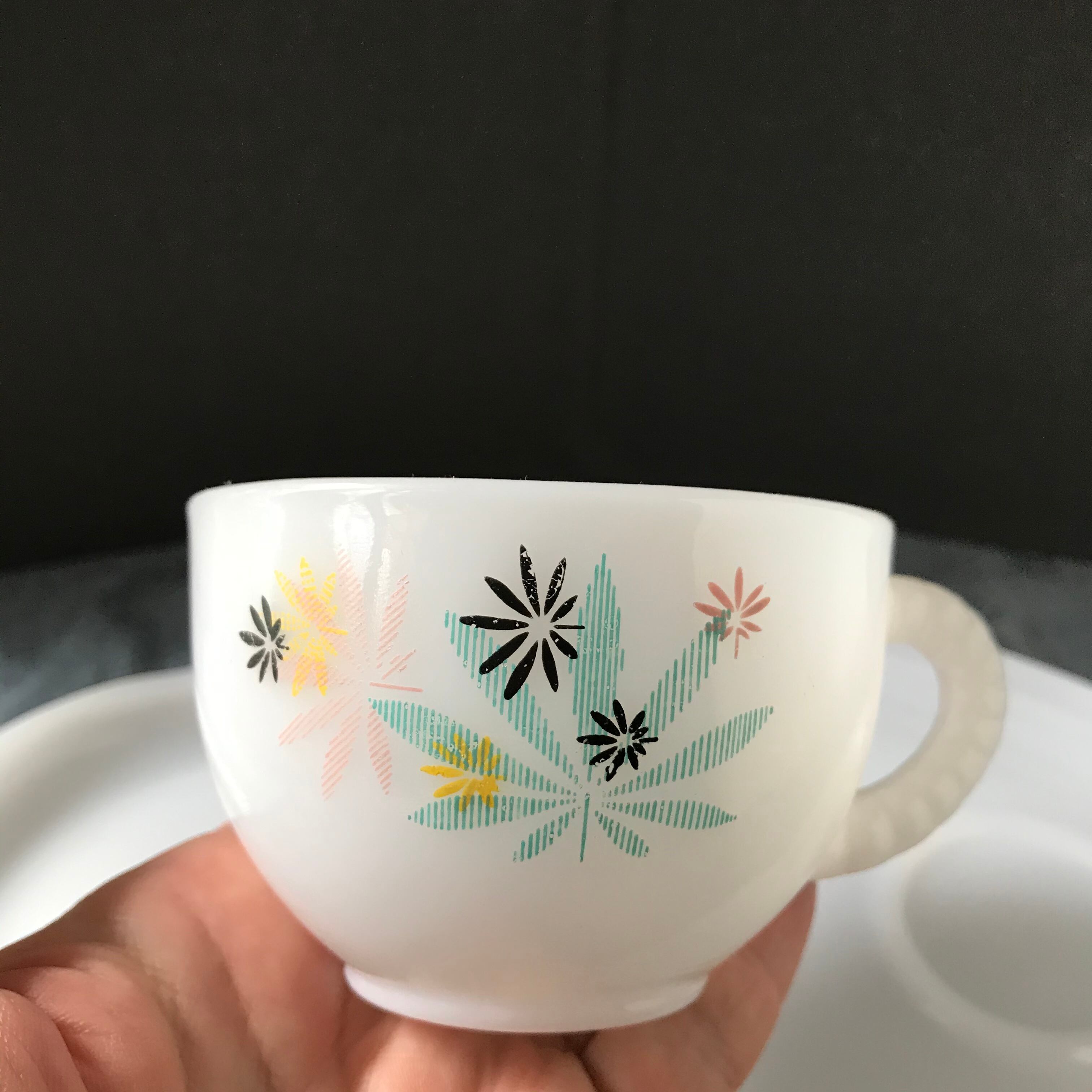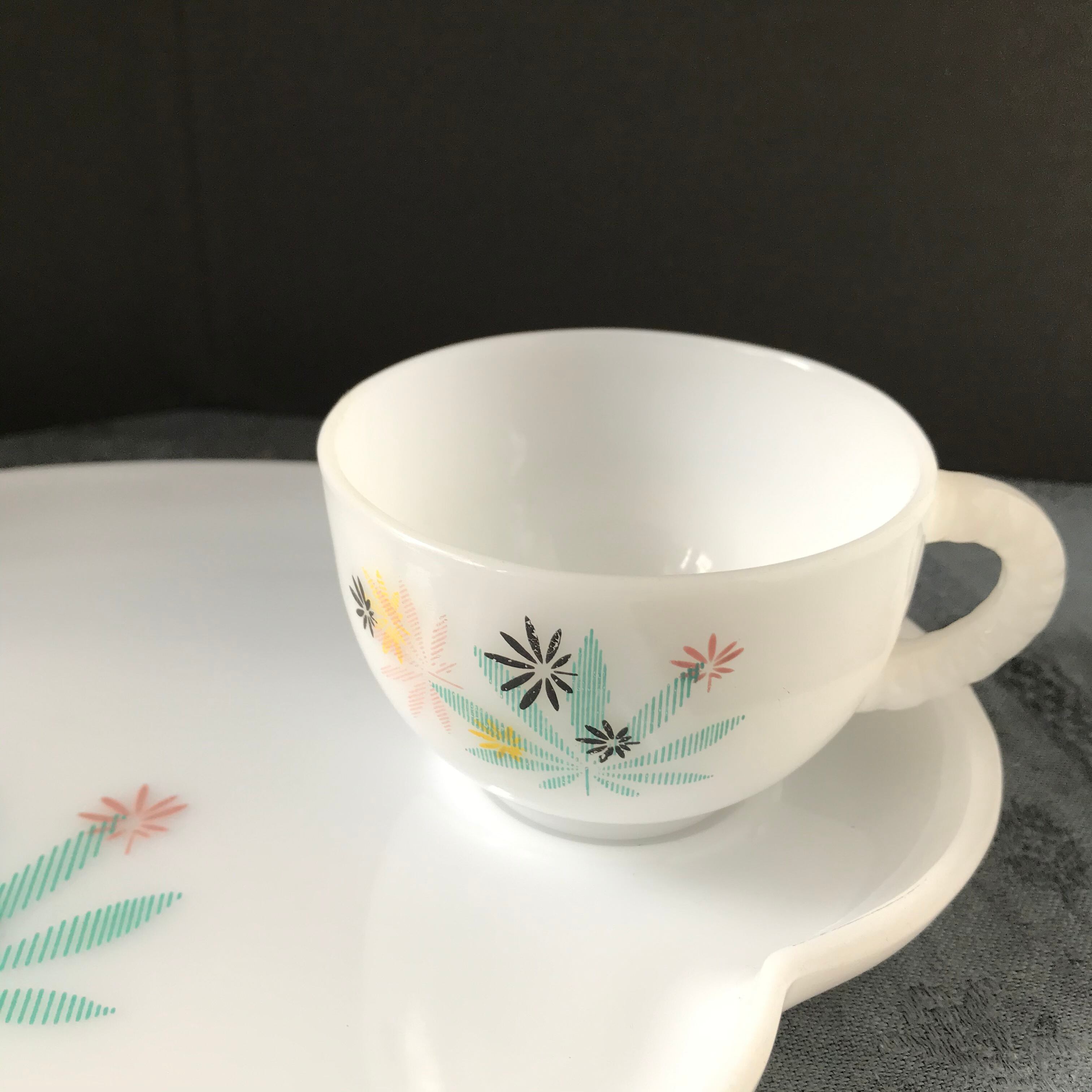 ミルクガラスのカップとスナックトレイのセットです。ヒビカケ無く良い状態です。3組あります。
