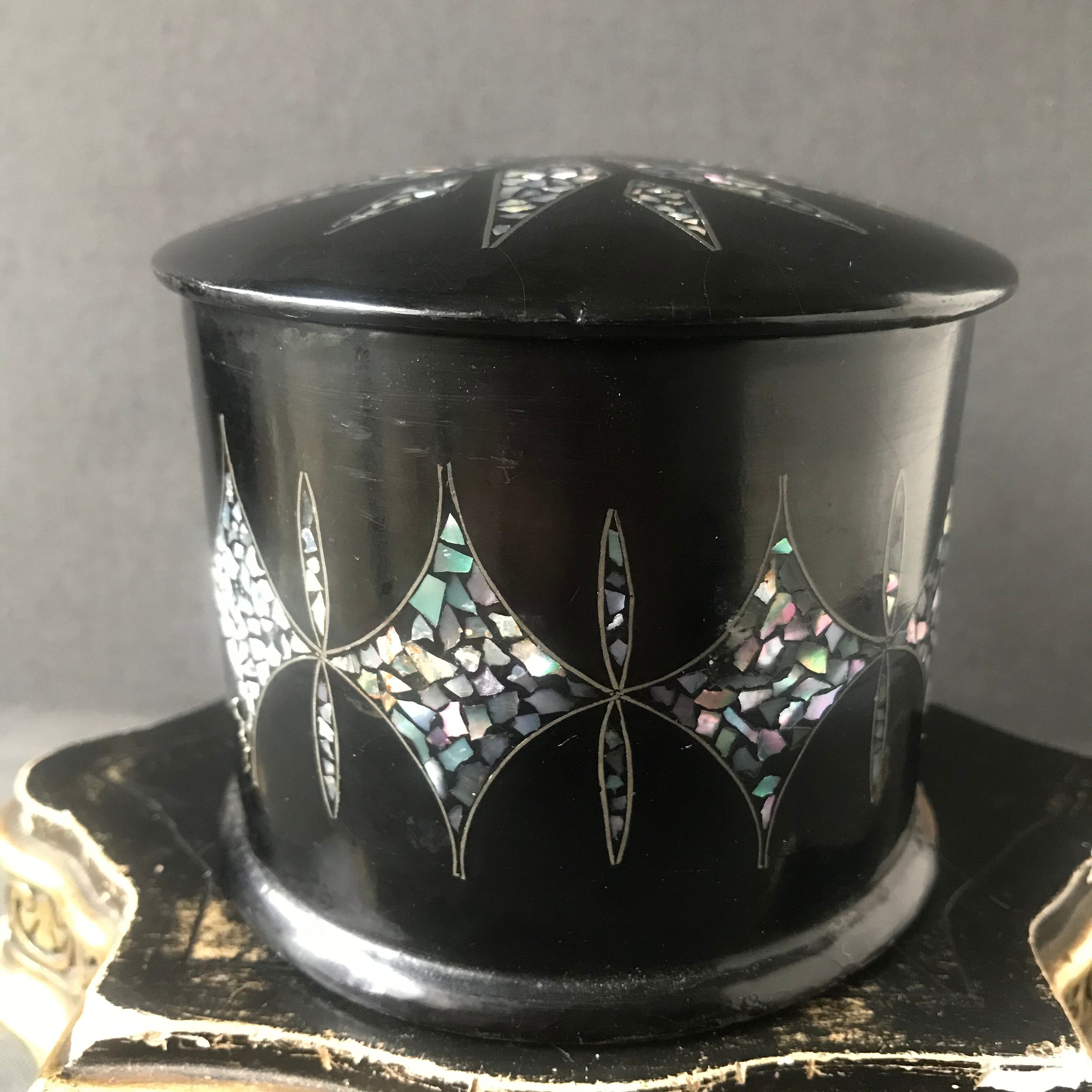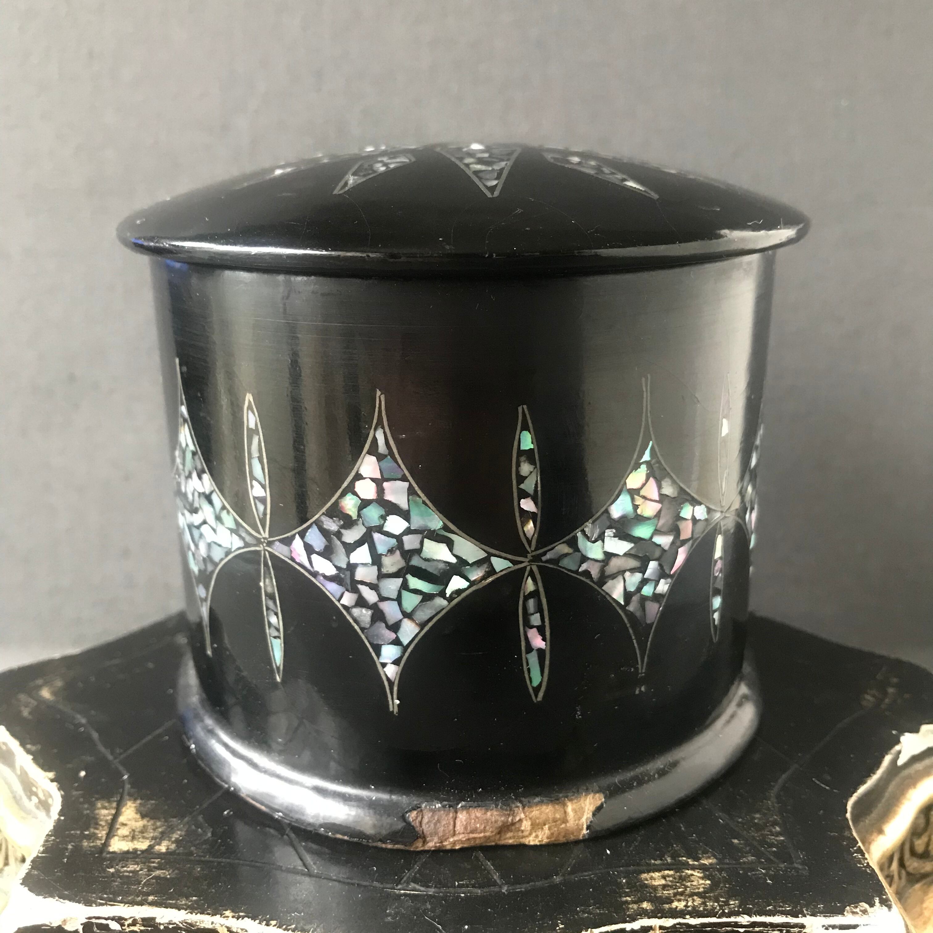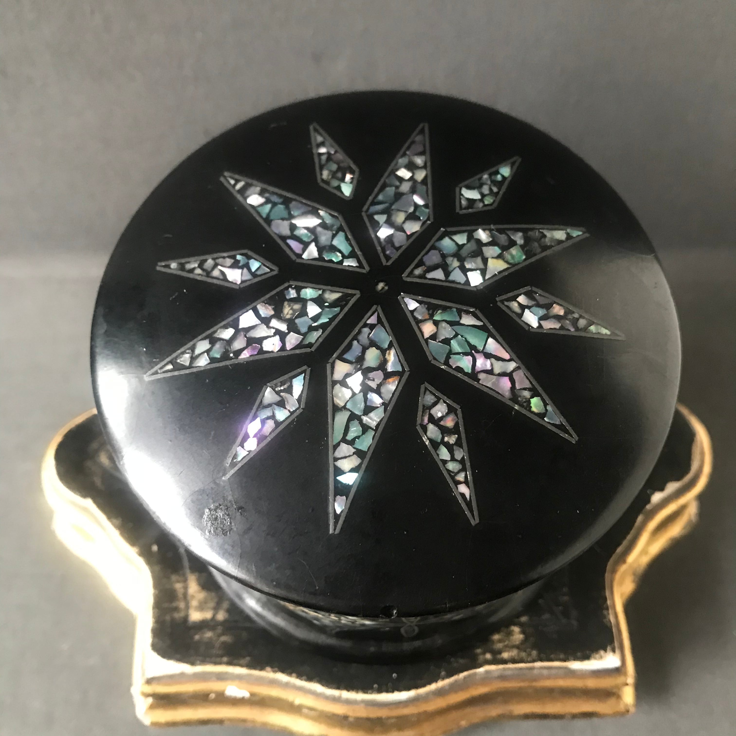 ・直径 10㎝ 高さ 9.5㎝ パピエマシェに螺鈿細工が素晴らしい珍しいBOX型のパピエマシェです。3ヶ所 剥がれがあります。100年経っている割には良い状態です。フランスアンティーク。