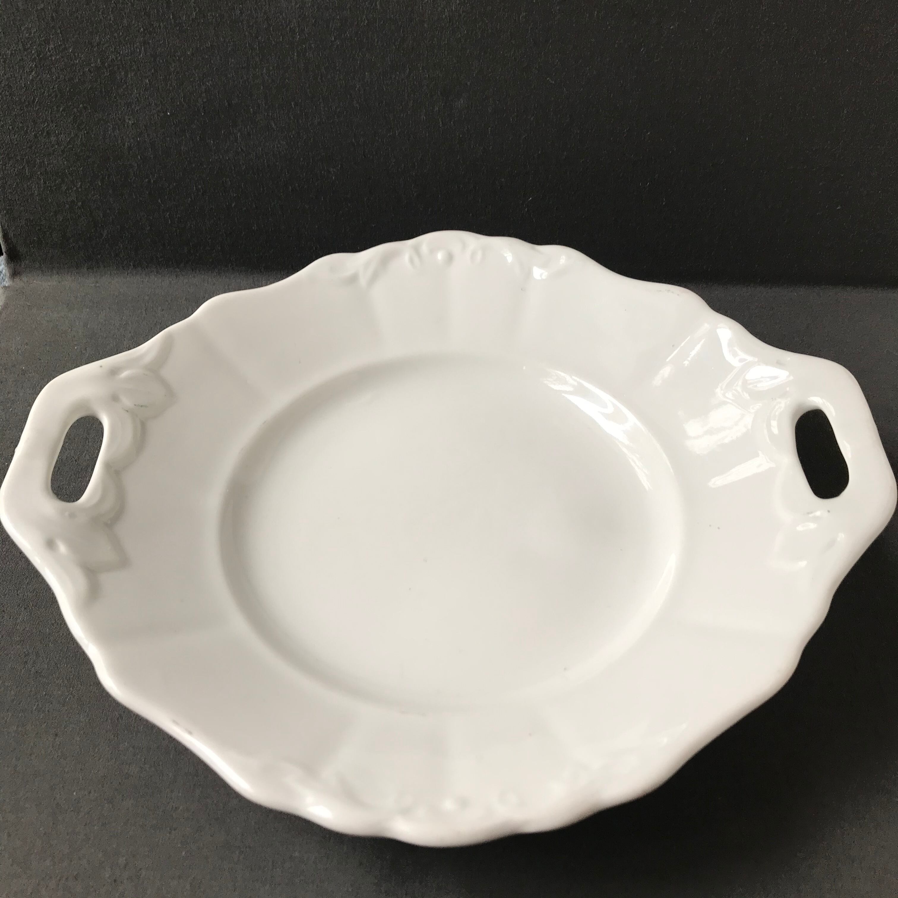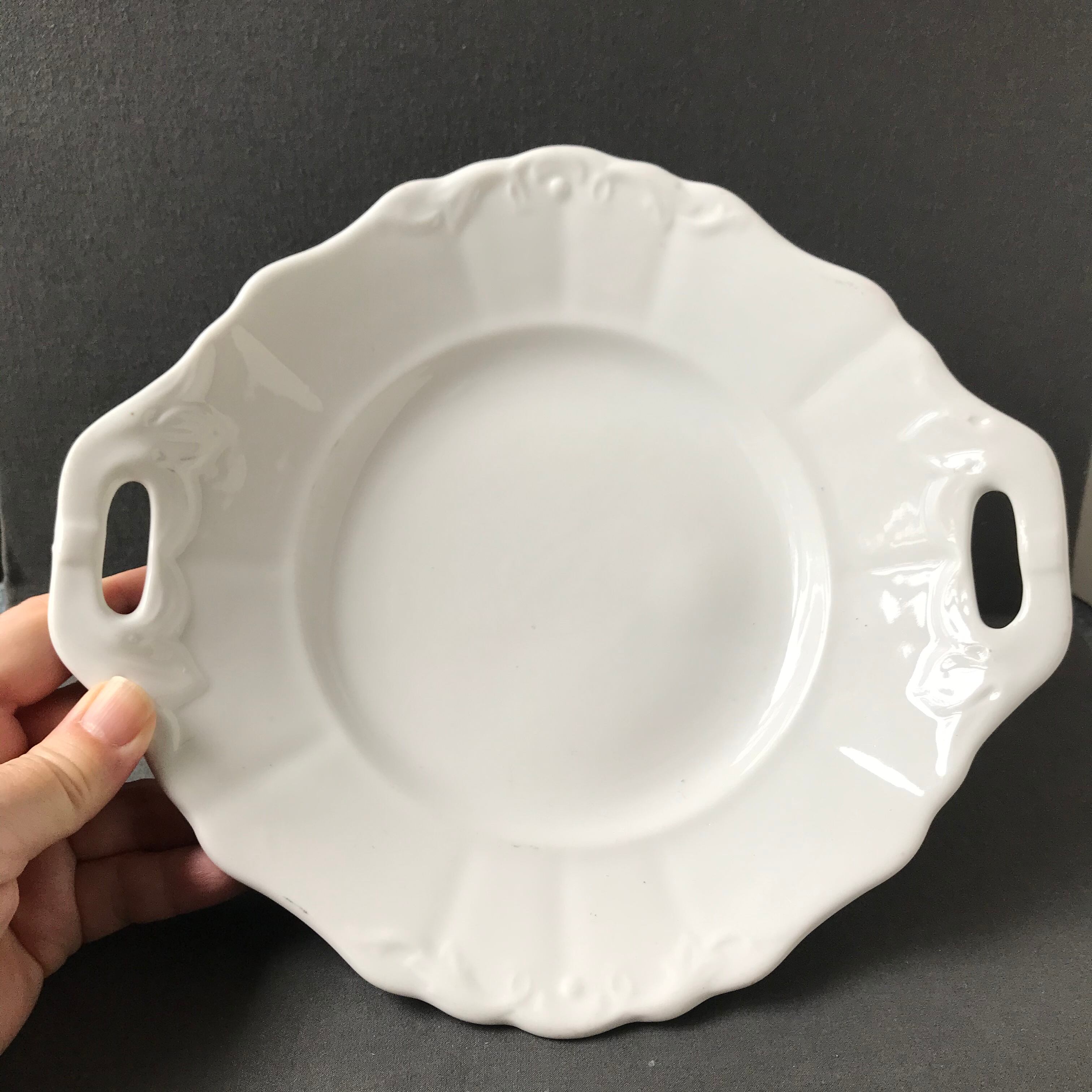 ・縦 23㎝ 横 25.5㎝ ポーセリン製 持ち手付きのレリーフが綺麗なプレートです。ヒビカケ無く経年の割に良い状態です。フランスアンティーク。